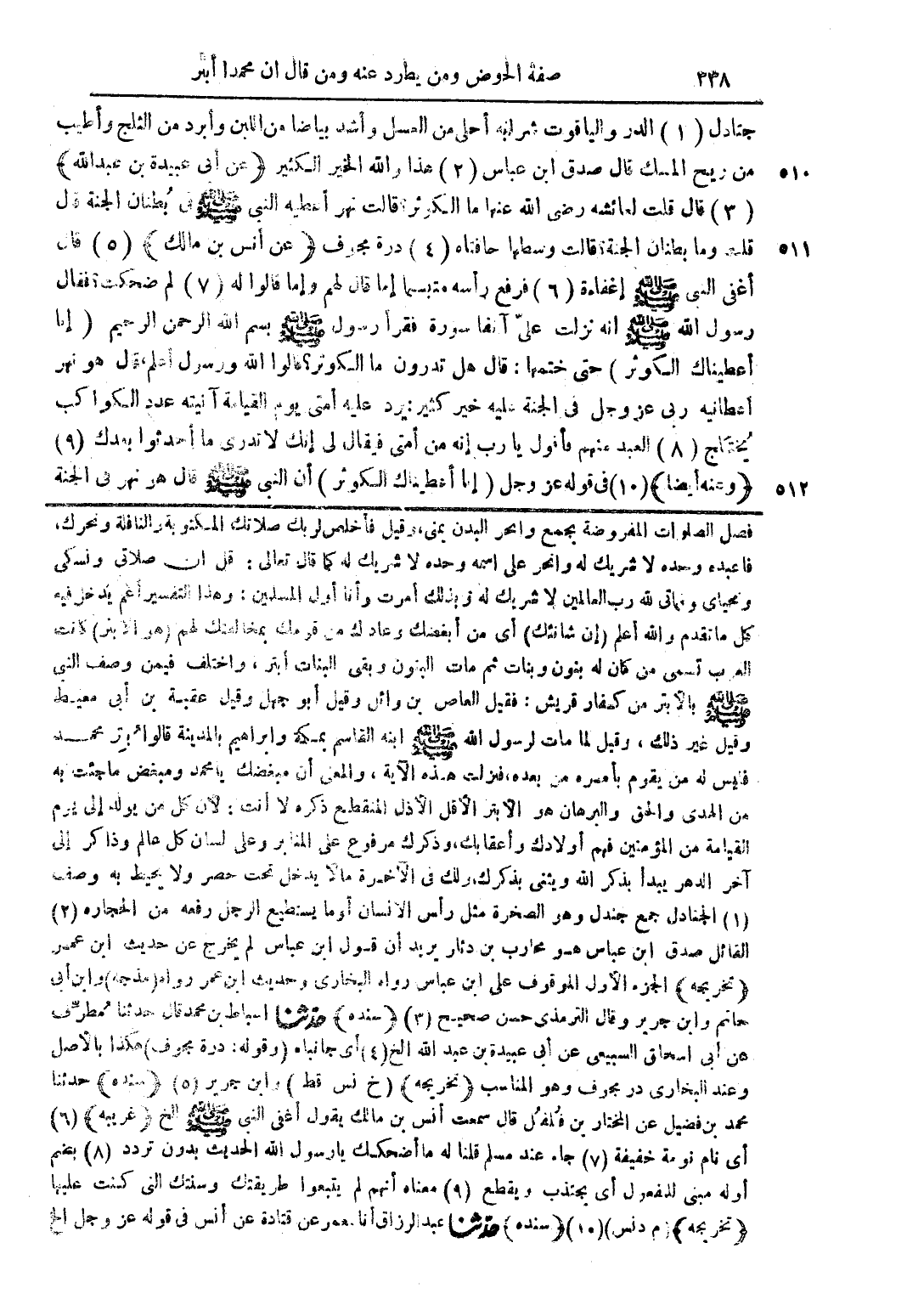 فصل الصلوات المفروضة بجمع وانحر البدن يمنى، وقيل فأخلص لربك صلاتك المكتوبة والناقلة ونحرك، فاعبده وحده لا شريك له وانحر على اسمه وحده لا شريك له كما قال تعالى: (قل إن صلاتي ونسكي ومحياي ومماتي لله رب العالمين لا شريك له)؛ وبذلك أمرت وأنا أول المسلمين: وهذا التفسير أعم يدخر فيه كل ما تقدم والله أعلم (إن شانئك) أي من أبغضك وعادك من قومك بمخالفتك لهم (هو الأبتر) كامن العرب تسمى من كان له بنون وبنات ثم مات البنون وبقي البنات أبتر، واختلف فيمن وصف النبي صلى الله عليه وسلم بالأبتر من كفار قريش: فقيل العاص بن وائل وقيل أبو جهل وقيل عقبة بن أبي معيط وقيل غير ذلك، وقيل لما مات لرسول الله صلى الله عليه وسلم ابنه القاسم بمكة وإبراهيم بالمدينة قالوا بتر محمد فليس له من يقوم بأمره من بعده، فنزلت هذه الآية، والمعنى أن مبغضك يا محمد ومبغض ما جئت به من الهدى والبرهان هو الأبتر الأقل الأذل المنقطع ذكره لا أنت؛ لأن كل من يولد إلى يوم القيامة من المؤمنين فهم أولادك وأعقابك، وذكرك مرفوع على ....... وعلى كل عالم وذاكر إلى آخر الدهر يبدأ بذكر الله ويثنى بذكرك، ولك في الآخرة مالا يدخل تحت حصر ولا يحيط به وصف (1) الجنادل جمع جندل وهو الصخرة مثل رأس الإنسان أو ما يستطيع الرجل رفعه من الحجارة (2) القائل صدق ابن عباس هو محارب بن دثار يريد أن قول ابن عباس لم يخرج عن حديث ابن عمر (تخريجه) الجزء الأول الموقوف على ابن عباس رواه البخاري وحديث ابن عمر رواه (مذجه) وابن أبي حاتم وابن جرير وقال الترمذي حسن صحيح (3) (سنده) حدثنا أسباط بن محمد قال حدثنا مطرف عن أبي إسحاق السبيعي عن أبي عبيدة بن عبد الله الخ (4) أي جانباه (وقوله: درة مجوف) هكذا بالأصل وعند البخاري در مجوف وهو المناسب (تخريجه) (خ. نس. قط) وابن جرير (5) (سنده) حدثنا محمد بن فضيل عن المختار بن فلفل قال سمعت أنس بن مالك يقول أغفى النبي صلى الله عليه وسلم الخ (غريبه) (6) أي نام نومة خفيفة (7) جاء عند مسلم قلنا له ما أضحكك يا رسول الله الحديث بدون تردد (8) بضم أوله مبني للمفعول أي يجتذب ويقطع (9) معناه أنهم لم يتبعوا طرقتك وسنتك التي كنت عليها (تخريجه) (م. دنس) (10) (سنده) حدثنا عبد الرزاق أنا عمر عن قتادة عن أنس في قوله عز وجل الخ
