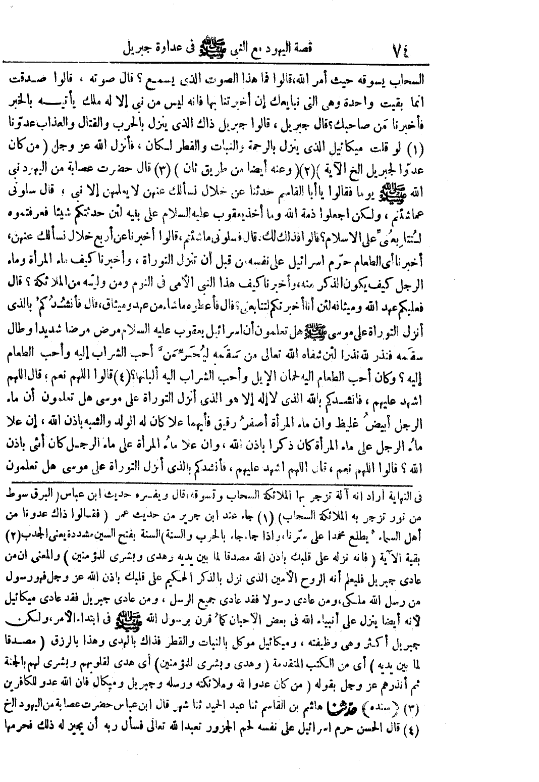 في النهاية أراد انه آلة تزجر بها الملائكة السحاب وتسوقه قال ويفسره حديث ابن عباس (البرق سوط من نور تزجر به الملائكة السحاب) (1) جاء عند ابن جرير من حديث عمر (فقالوا ذاك عدونا من أهل السماء يطلع محمدا على سرنا واذا جاء جاء بالحرب والسنة) السنة بفتح السين مشددة يعني الجدب (2) بقية الآية (فإنه نزله على قلبك بإذن الله مصدقا لما بين يديه وهدى وبشرى للمؤمنين) والمعنى ان من عادى جبريل فليعلم انه الروح الأمين الذي نزل بالذكر الحكيم على قلبك بإذن الله عز وجل فهو رسول من رسل الله ملكى ومن عادى رسولا فقد عادى جميع الرسل ومن عادى جبريل فقد عادى ميكائيل لأنه أيضا ينزل على أنبياء الله في بعض الأحيان كما قرن برسول الله صلى الله عليه وسلم في ابتداء الأمر ولكن جبريل أكثر وهي وظيفته وميكائيل موكل بالنبات والقطر فذاك بالهدى وهذا بالرزق (مصدقا لما بين يديه) أي من الكتب المتقدمة (وهدى وبشرى للمؤمنين) أي هدى لقلوبهم وبشرى لهم بالجنة ثم أنذرهم عز وجل بقوله (من كان عدوا لله وملائكته ورسله وجبريل وميكال فإن الله عدو للكافرين) (3) (سنده) حدثنا هاشم بن القاسم ثنا عبد الحميد ثنا شهر قال ابن عباس حضرت عصابة من اليهود الخ (4) قال الحسن حرم اسرائيل على نفسه لحم الجزور تعبدا لله تعالى فسأل ربه أن يجيز له ذلك فحرمها