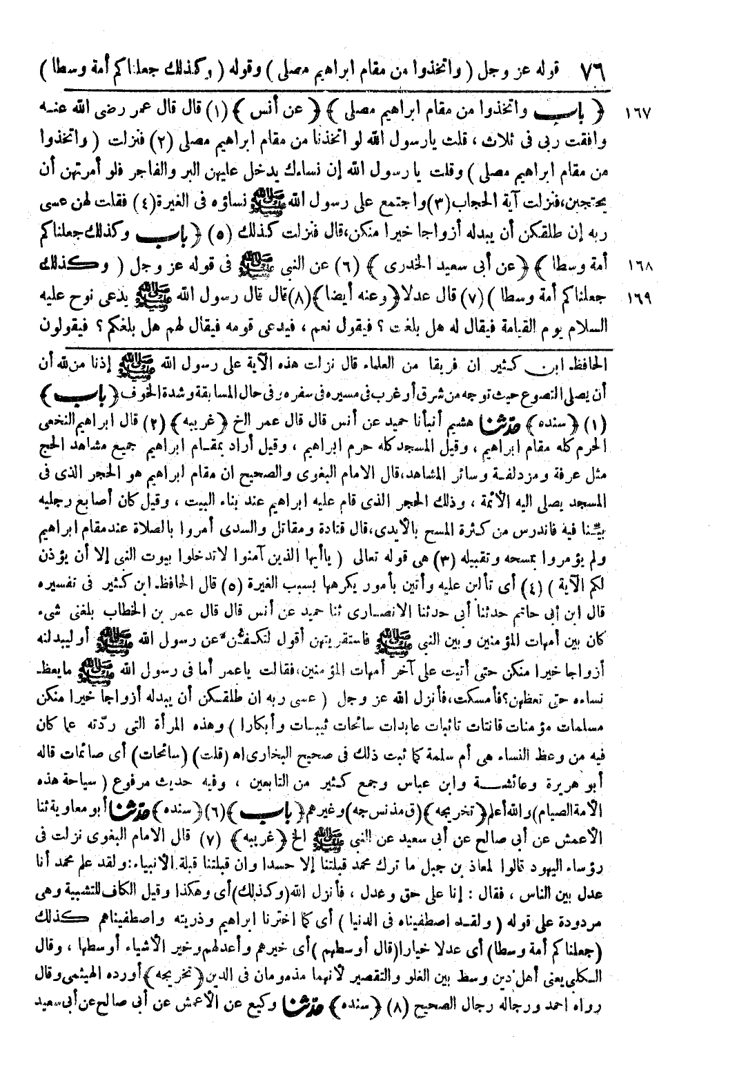 (باب واتخذوا من مقام ابراهيم مصلى) (عن أنس) (1) قال قال عمر رضي الله عنه وافقت ربي في ثلاث قلت يا رسول الله لو اتخذنا من مقام ابراهيم مصلى (2) فنزلت (واتخذوا من مقام ابراهيم مصلى) وقلت يا رسول الله إن نساءك يدخل عليهن البر والفاجر فلو أمرتهن أن يحتجبن فنزلت آية الحجاب (3) واجتمع على رسول الله صلى الله عليه وسلم نساؤه في الغيرة (4) فقلت لهن عسى ربه إن طلقكن أن يبدله أزواجا خيرا منكن قال فنزلت كذلك (5) (باب وكذلك جعلناكم أمة وسطا) (عن أبي سعيد الخدري) (6) عن النبي صلى الله عليه وسلم في قوله عز وجل (وكذلك جعلناكم أمة وسطا) (7) قال عدلا (وعنه أيضا) (8) قال قال رسول الله صلى الله عليه وسلم يدعى نوح عليه السلام يوم القيامة فيقال له هل بلغت؟ فيقول نعم فيدعى قومه فيقال لهم هل بلغكم؟ فيقولون
