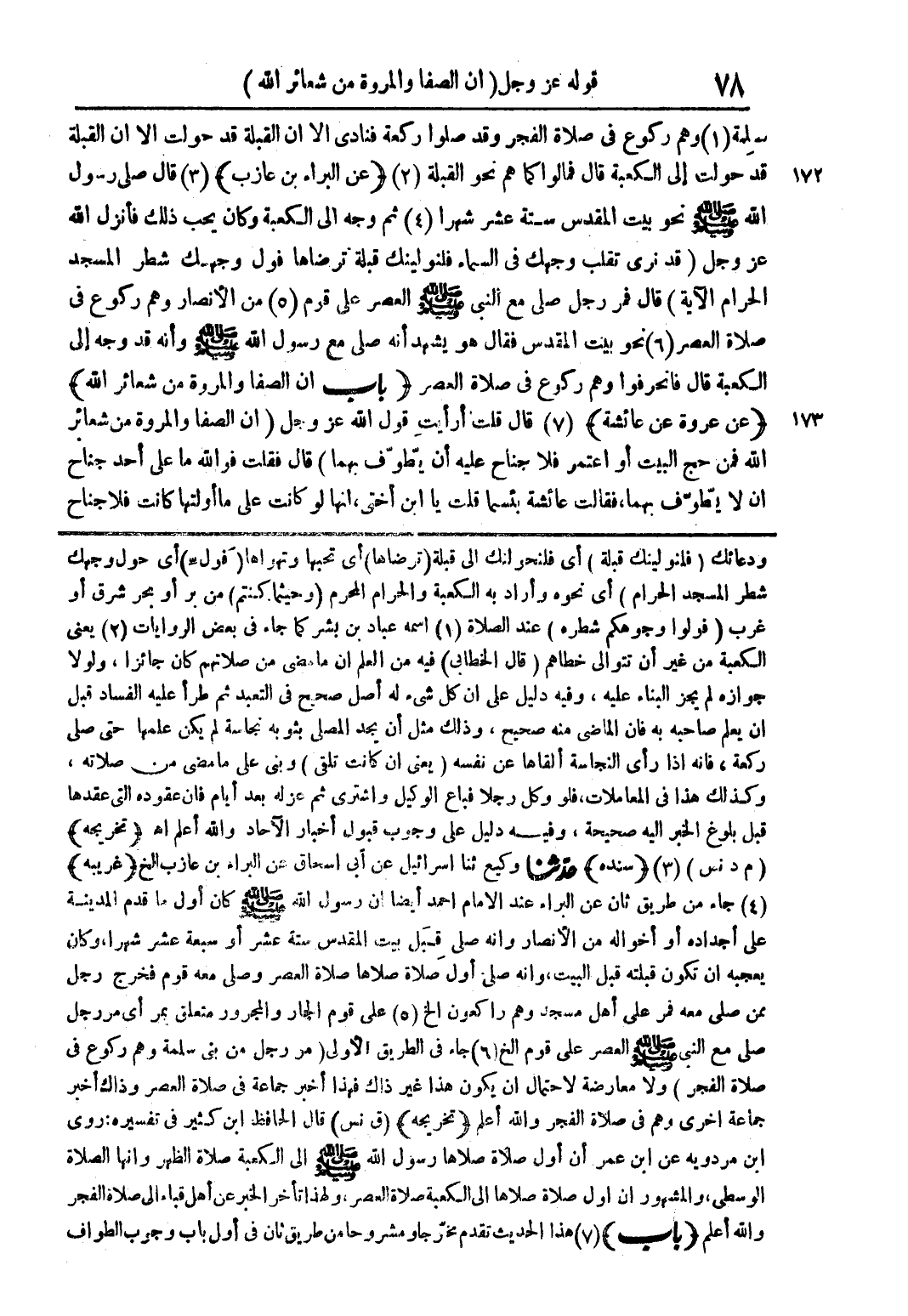 سلمة (1) وهم ركوع في صلاة الفجر وقد صلوا ركعة فنادى الا ان القبلة قد حولت الا ان القبلة قد حولت إلى الكعبة قال فمالوا كما هم نحو القبلة (2) (عن البراء بن عازب) (3) قال صلى رسول الله صلى الله عليه وسلم نحو بيت المقدس ستة عشر شهرا (4) ثم وجه إلى الكعبة وكان يحب ذلك فأنزل الله عز وجل (قد نرى تقلب وجهك في السماء فلنولينك قبلة ترضاها فول وجهك شطر المسجد الحرام الآية) قال فمر رجل صلى مع النبي صلى الله عليه وسلم العصر على قوم (5) من الأنصار وهم ركوع في صلاة العصر (6) نحو بيت المقدس فقال هو يشهد أنه صلى مع رسول الله صلى الله عليه وسلم وأنه قد وجه إلى الكعبة قال فانحرفوا وهم ركوع في صلاة العصر (باب ان الصفا والمروة من شعائر الله) (عن عروة عن عائشة) (7) قال قلت أرأيت قول الله عز وجل (ان الصفا والمروة من شعائر الله فمن حج البيت أو اعتمر فلا جناح عليه أن يطوف بهما) قال فقلت فوالله ما على أحد جناح ان لا يطوف بهما فقالت عائشة بئسما قلت يا ابن اختي انها لو كانت على ما أولتها كانت فلا جناح