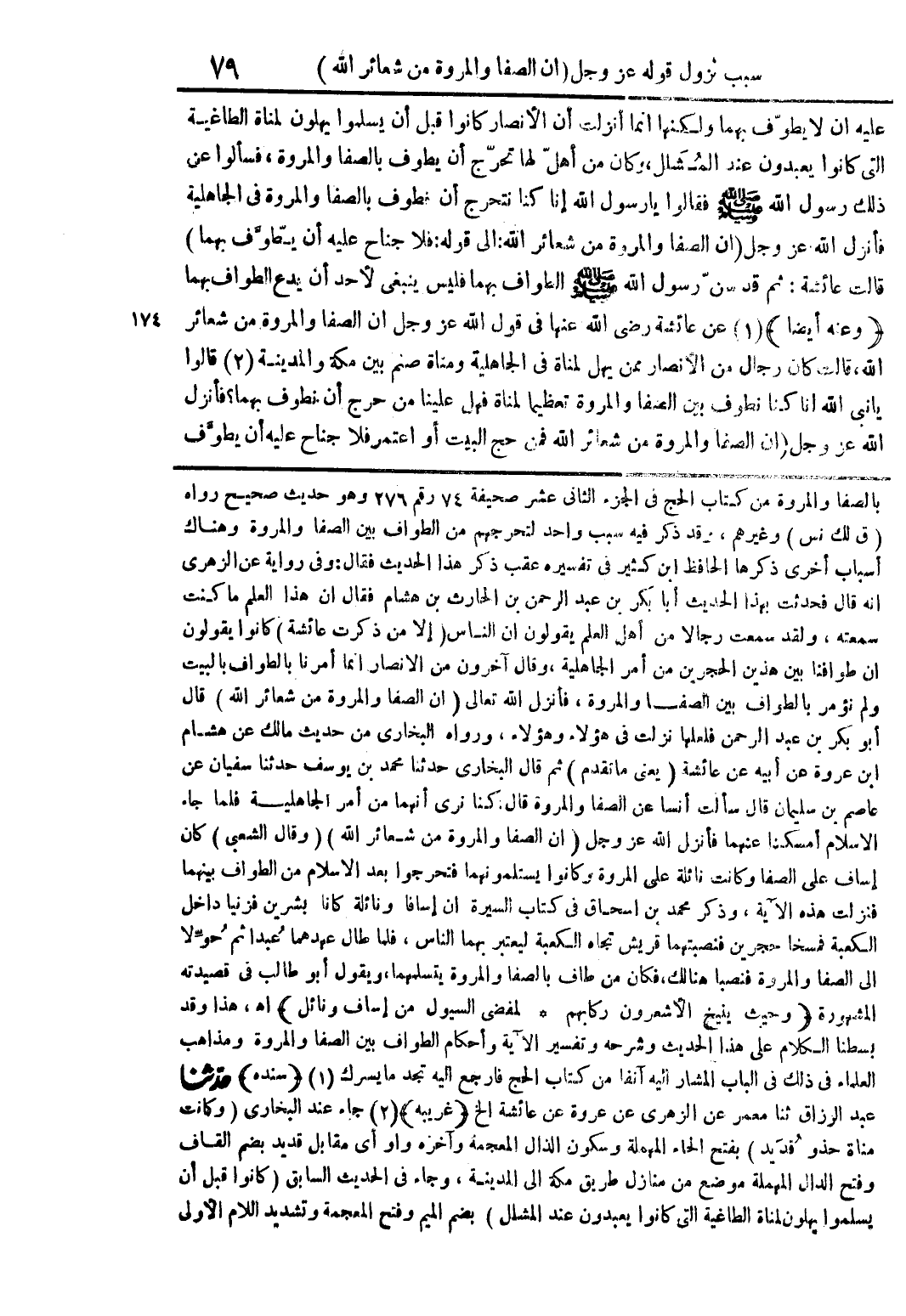 بالصفا والمروة من كتاب الحج في الجزء الثاني عشر صحيفة 74 رقم 276 وهو حديث صحيح رواه (ق لك نس) وغيرهم وقد ذكر فيه سبب واحد لتحرجهم من الطواف بين الصفا والمروة وهناك أسباب أخرى ذكرها الحافظ ابن كثير في تفسيره عقب ذكر هذا الحديث فقال وفي رواية عن الزهري انه قال فحدثت بهذا الحديث أبا بكر بن عبد الرحمن بن الحارث بن هشام فقال ان هذا العلم ما كنت سمعته ولقد سمعت رجالا من أهل العلم يقولون ان الناس (إلا من ذكرت عائشة) كانوا يقولون ان طوافنا بين هذين الحجرين من أمر الجاهلية وقال آخرون من الانصار انما امرنا بالطواف بالبيت ولم نؤمر بالطواف بين الصفا والمروة فأنزل الله تعالى (ان الصفا والمروة من شعائر الله) قال أبو بكر بن عبد الرحمن فلعلها نزلت في هؤلاء وهؤلاء ورواه البخاري من حديث مالك عن هشام ابن عروة عن أبيه عن عائشة (يعني ما تقدم) ثم قال البخاري حدثنا محمد بن يوسف حدثنا سفيان عن عاصم بن سليمان قال سالت أنسا عن الصفا والمروة قال كنا نرى أنهما من أمر الجاهلية فلما جاء الاسلام امسكنا عنهما فأنزل الله عز وجل (ان الصفا والمروة من شعائر الله) (وقال الشعبي) كان إساف على الصفا وكانت نائلة على المروة وكانوا يستلمونهما فتحرجوا بعد الاسلام من الطواف بينهما فنزلت هذه الآية وذكر محمد بن اسحاق في كتاب السيرة ان اسافا ونائلة كانا بشرين فزنيا داخل الكعبة فمسخا حجرين فنصبتهما قريش تجاه الكعبة ليعتبر بهما الناس فلما طال عهدهما عبدا ثم حولا إلى الصفا والمروة فنصبا هنالك فكان من طاف بالصفا والمروة يتسلمهما ويقول أبو طالب في قصيدته المشهورة (وحيث ينيخ الأشعرون ركابهم * لمفضى السيول من اساف ونائل) اهـ هذا وقد بسطنا الكلام على هذا الحديث وشرحه وتفسير الآية وأحكام الطواف بين الصفا والمروة ومذاهب العلماء في ذلك في الباب المشار اليه آنفا من كتاب الحج فارجع اليه تجد ما يسرك (1) (سنده) حدثنا عبد الرزاق ثنا معمر عن الزهري عن عروة عن عائشة الخ (غريبه) (2) جاء عند البخاري (وكانت مناة حذو فديد) بفتح الحاء المهملة وسكون الذال المعجمة وآخره واو أي مقابل قديد بضم القاف وفتح الدال المهملة موضع من منازل طريق مكة إلى المدينة وجاء في الحديث السابق (كانوا قبل ان يسلموا يهلون لمناة الطاغية التي كانوا يعبدون عند المشلل) بضم الميم وفتح المعجمة وتشديد اللام الأولى