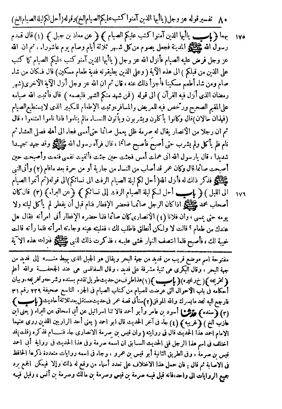 بهما (باب يا أيها الذين آمنوا كتب عليكم الصيام) (عن معاذ بن جبل) (1) قال قدم رسول الله صلى الله عليه وسلم المدينة فجعل يصوم من كل شهر ثلاثة أيام وصام يوم عاشوراء ثم ان الله عز وجل فرض عليه الصيام فأنزل الله عز وجل (يا أيها الذين آمنو كتب عليكم الصيام كما كتب على الذين من قبلكم) إلى هذه الآية (وعلى الذين يطيقونه فدية طعام مسكين) قال فكان من شاء صام ومن شاء أطعم مسكينا فأجزأ ذلك عنه قال ثم ان الله عز وجل انزل الآية الأخرى (شهر رمضان الذي أنزل فيه القرآن) إلى قوله (فمن شهد منكم الشهر فليصمه) قال فأثبت الله صيامه على المقيم الصحيح ورخص فيه للمريض والمسافر وثبت الاطعام للكبير الذي لا يستطيع الصيام (فهذان حالان) قال وكانوا يأكلون ويشربون ويأتون النساء مالم يناموا فإذا ناموا امتنعوا قال ثم ان رجلا من الانصار يقال له صرمة ظل يعمل صائما حتى أمسى فجاء إلى أهله فصلى العشاء ثم نام فلم يأكل ولم يشرب حتى أصبح فأصبح صائما قال فرآه رسول الله صلى الله عليه وسلم وقد جهد جهدا شديدا قال يا رسول الله اني عملت أمس فجئت حين جئت فألقيت نفسي فنمت وأصبحت حين أصبحت صائما قال وكان عمر قد أصاب من النساء من جارية أو من حرة بعد ما قام (2) وأتى النبي صلى الله عليه وسلم فذكر ذلك فأنزل الله (احل لكم ليلة الصيام الرفث في نسائكم) إلى قوله (ثم اتموا الصيام إلى الليل) (باب أحل لكم ليلة الصيام الرفث إلى نسائكم) (عن البراء) (3) قال كان أصحاب محمد صلى الله عليه وسلم اذا كان الرجل صائما فحضر الافطار فنام قبل ان يفطر لم يأكل ليلته ولا يومه حتى يمسي وان فلانا (4) الانصاري كان صائما فلما حضره الافطار اتى امرأته فقال هل عندك من طعام؟ قالت لا ولكن انطلق فاطلب لك فغلبته عينه وجاءته امرأته فلما رأته قالت خيبة لك فأصبح فلما انتصف النهار غشي عليه فذكرت ذلك للنبي صلى الله عليه وسلم فنزلت هذه الآية