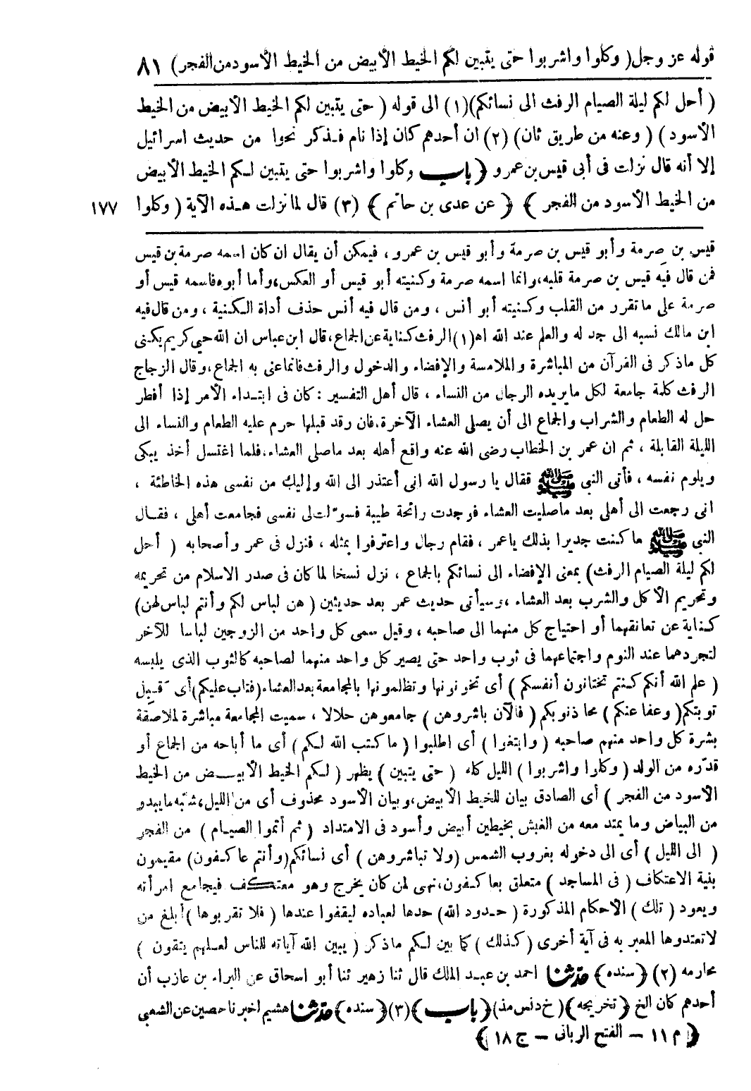 (أحل لكم ليلة الصيام الرفث إلى نسائكم) (1) إلى قوله تعالى (حتي يتبين لكم الخيط الأبيض من الخيط الأسود) (وعنه من طريق ثان) (2) ان احدهم كان إذا نام فذكر نحوا من حديث اسرائيل إلا أنه قال نزلت في ابي قيس بن عمرو (باب وكلوا واشربوا حتى يتبين لكم الخيط الأبيض من الخيط الأسود من الفجر) (عن عدي بن حاتم) (3) قال لما نزلت هذه الآية (وكلوا
