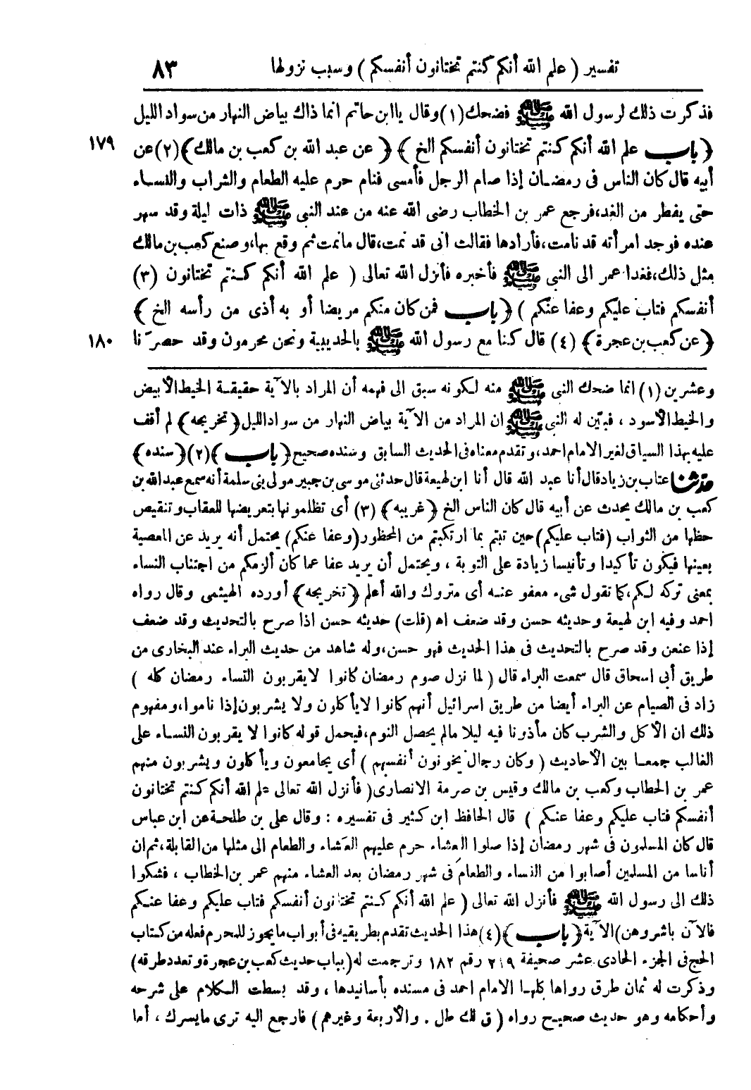 فذكرت ذلك لرسول الله صلى الله عليه وسلم فضحك (1) وقال يا ابن حاتم انما ذاك بياض النهار من سواد الليل (باب علم الله أنكم كنتم تختانون أنفسكم الخ) (عن عبد الله بن كعب بن مالك) (2) عن أبيه قال كان الناس في رمضان إذا صام الرجل فأمسى فنام حرم عليه الطعام والشراب والنساء حتى يفطر من الغد فرجع عمر بن الخطاب رضي الله عنه من عند النبي صلى الله عليه وسلم ذات ليلة وقد سهر عنده فوجد امرأته قد نامت فأرادها فقالت اني قد نمت قال ما نمت ثم وقع بها وصنع كعب بن مالك مثل ذلك فغدا عمر إلى النبي صلى الله عليه وسلم فأخبره فأنزل الله تعالى (علم الله أنكم كنتم تختانون (3) أنفسكم فتاب عليكم وعفا عنكم) (باب فمن كان منكم مريضا أو به أذى من رأسه الخ) (عن كعب بن عجرة) (4) قال كنا مع رسول الله صلى الله عليه وسلم بالحديبية ونحن محرمون وقد حصرنا