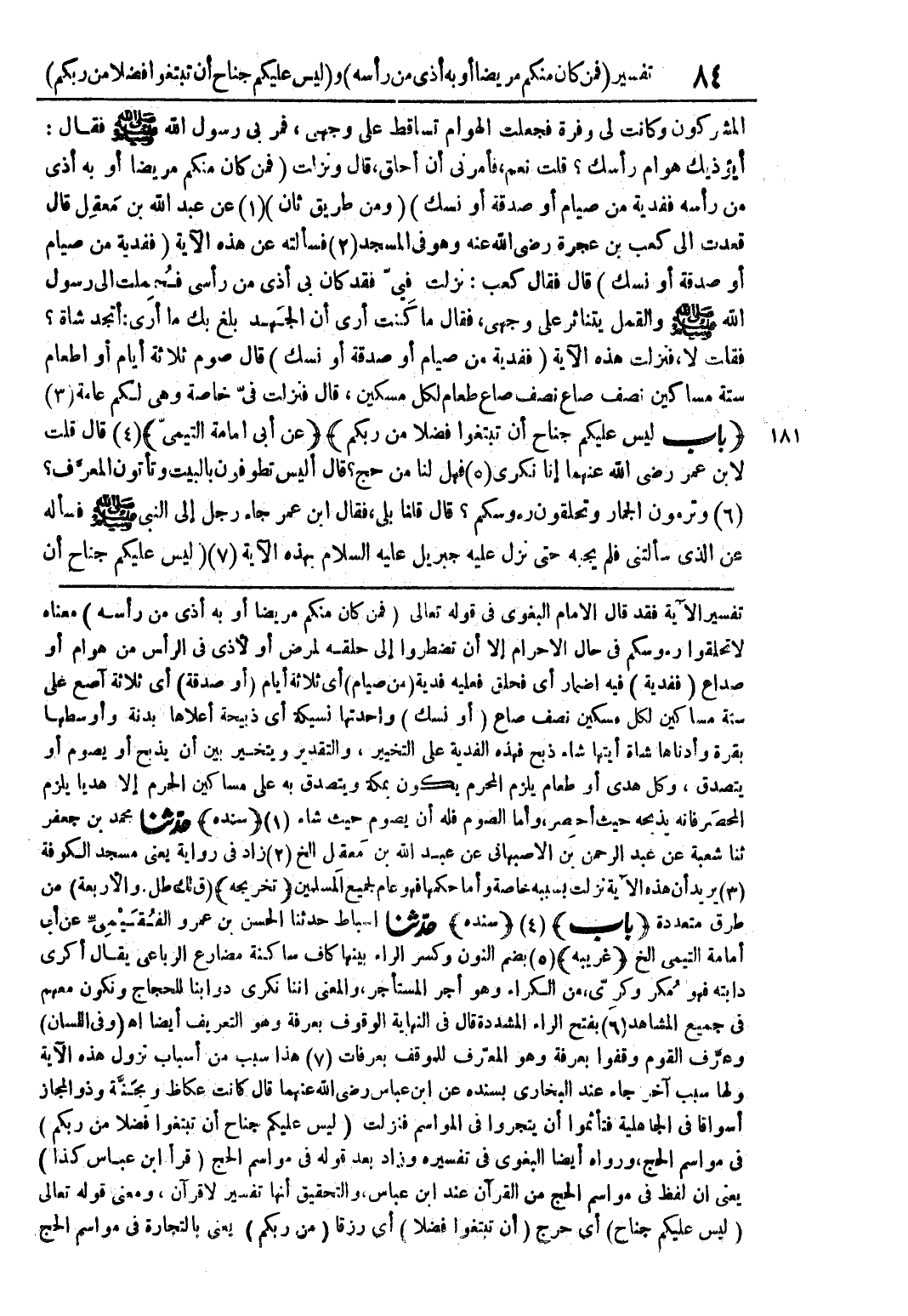 تفسير الآية فقد قال الامام البغوي في قوله تعالى (فمن كان منكم مريضا أو به أذى من رأسه) معناه لا تحلقوا رءوسكم في حال الاحرام إلا أن تضطروا إلى حلقه لمرض أو لأذى في الرأس من هوام أو صداع (ففدية) فيه اضمار أي فحلق فعليه فدية (من صيام) أي ثلاثة أيام (أو صدقة) أي ثلاثة آصع على ستة مساكين لكل مسكين نصف صاع (أو نسك) واحدتها نسيكة أي ذبيحة أعلاها بدنة وأوسطها بقرة وأدناها شاة أيتها شاء ذبح فهذه الفدية على التخيير والتقدير ويتخير بين أن يذبح أو يصوم أو يتصدق وكل هدى أو طعام يلزم المحرم يكون بمكة ويتصدق به على مساكين الحرم إلا هديا يلزم المحصر فإنه يذبحه حيث أحصر وأما الصوم فله أن يصوم حيث شاء (1) (سنده) حدثنا محمد بن جعفر ثنا شعبة عن عبد الرحمن بن الاصبهاني عن عبد الله بن معقل الخ (2) زاد في رواية يعني مسجد الكوفة (3) يريد أن هذه الآية نزلت بسببه خاصة وأما حكمها فهو عام لجميع المسلمين (تخريجه) (ق لك طل والأربعة) من طرق متعددة (باب) (4) (سنده) حدثنا اسباط حدثنا الحسن بن عمرو الفقيمي عن أبي أمامة التيمي الخ (غريبه) (5) بضم النون وكسر الراء بينها كاف ساكنة مضارع الرباعي يقال اكرى دابته فهو مكر وكرى من الكراء وهو أجسر المستأجر والمعنى اننا نكرى دوابنا للحجاج ونكون معهم في جميع المشاهد (6) بفتح الراء المشددة قال في النهاية الوقوف بعرفة وهو التعريف أيضا اهـ (وفي اللسان) وعرف القوم وقفوا بعرفة وهو المعرف للموقف بعرفات (7) هذا سبب من أسباب نزول هذه الآية ولها سببب آخر جاء عند البخاري بسنده عن ابن عباس رضي الله عنهما قال كانت عكاظ ومجنة وذو المجاز أسواقا في الجاهلية فتأثموا أن يتجروا في المواسم فنزلت (ليس عليكم جناح أن تبتغوا فضلا من ربكم) في مواسم الحج ورواه أيضا البغوي في تفسيره وزاد بعد قوله في مواسم الحج (قرأ ابن عباس كذا) يعني ان لفظ في مواسم الحج من القرآن عند ابن عباس والتحقيق انها تفسير لا قرآن ومعنى قوله تعالى (ليس عليكم جناح) أي حرج (أن تبتغوا فضلا) أي رزقا (من ربكم) يعني بالتجارة في مواسم الحج