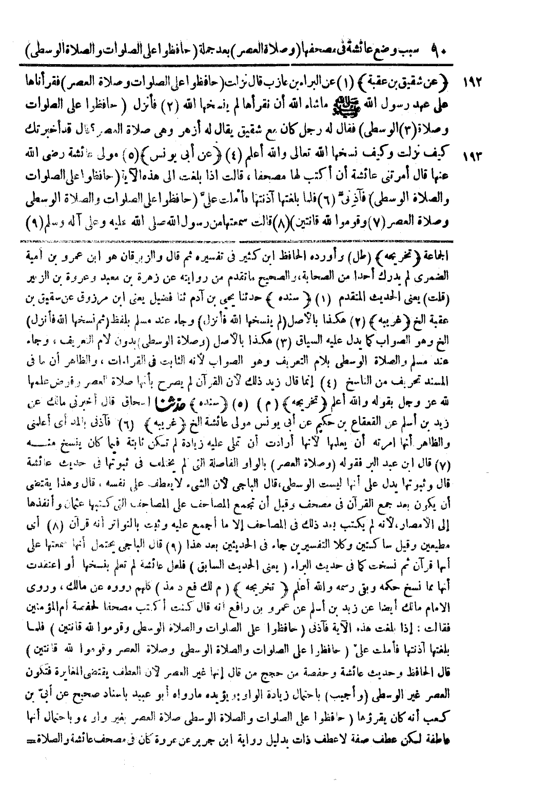 (عن شقيق بن عقبة) (1) عن البراء بن عازب قال نزلت (حافظوا على الصلوات وصلاة العصر) فقرأناها على عهد رسول الله صلى الله عليه وسلم ما شاء الله أن نقرأها لم ينسخها الله (2) فأنزل (حافظوا على الصلوات وصلاة (3) الوسطى) فقال له رجل كان مع شقيق يقال له أزهر وهي صلاة العصر؟ قال قد أخبرتك كيف نزلت وكيف نسخها الله تعالى والله أعلم (4) (عن أبي يونس) (5) مولى عائشة رضي الله عنها قال أمرتني عائشة أن أكتب لها مصحفا قال اذا بلغت إلى هذه الآية (حافظوا على الصلوات والصلاة الوسطى) فآذنى (6) فلما بلغتها آذنتها فأملت علي (حافظوا على الصلوات والصلاة الوسطى وصلاة العصر (7) وقوموا لله قانتين) (8) قالت سمعتها من رسول الله صلى الله عليه وعلى آله وسلم (9)