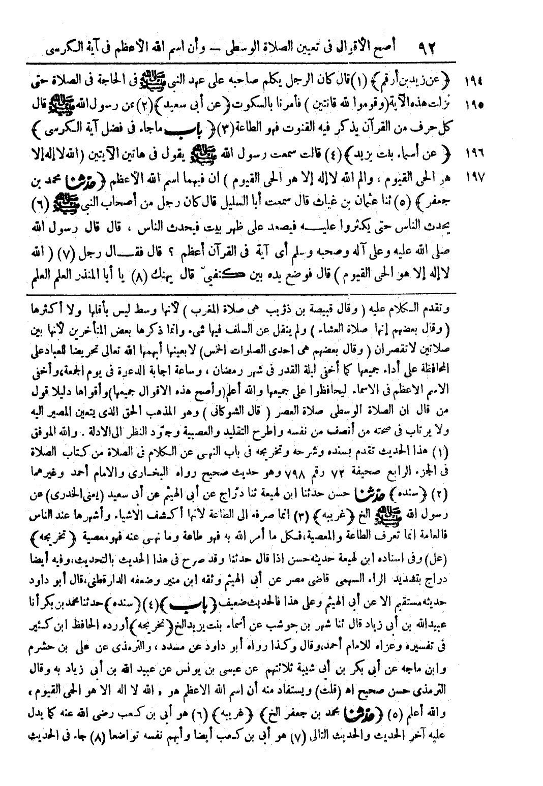 (عن زيد بن أرقم) (1) قال كان الرجل يكلم صاحبه على عهد النبي صلى الله عليه وسلم في الحاجة في الصلاة حتى نزلت هذه الآية (وقوموا لله قانتين) فأمونا بالسكوت (عن أبي سعيد) (2) عن رسول الله صلى الله عليه وسلم قال كل حرف من القرآن يذكر فيه القنوت فهو الطاعة (3) (باب ما جاء في فضل آية الكرسي) (عن أسماء بنت يزيد) (4) قال سمعت رسول الله صلى الله عليه وسلم يقول في هاتين الآيتين (الله لا إله إلا هو الحي القيوم، والم الله لا إله إلا هو الحي القيوم) ان فيهما اسم الله الأعظم (حدثنا محمد بن جعفر) (5) ثنا عثمان بن غياث قال سمعت أبا السليل قال كان رجل من أصحاب النبي صلى الله عليه وسلم (6) يحدث الناس حتى يكثروا عليه فيصعد على ظهر بيت فيحدث الناس قال قال رسول الله صلى الله عليه وعلى آله وصحبه وسلم أي آية في القرآن أعظم؟ قال فقال رجل (7) (الله لا إله إلا هو الحي القيوم) قال فوضع يده بين كتفي قال يهنك (8) يا أبا المنذر العلم العلم