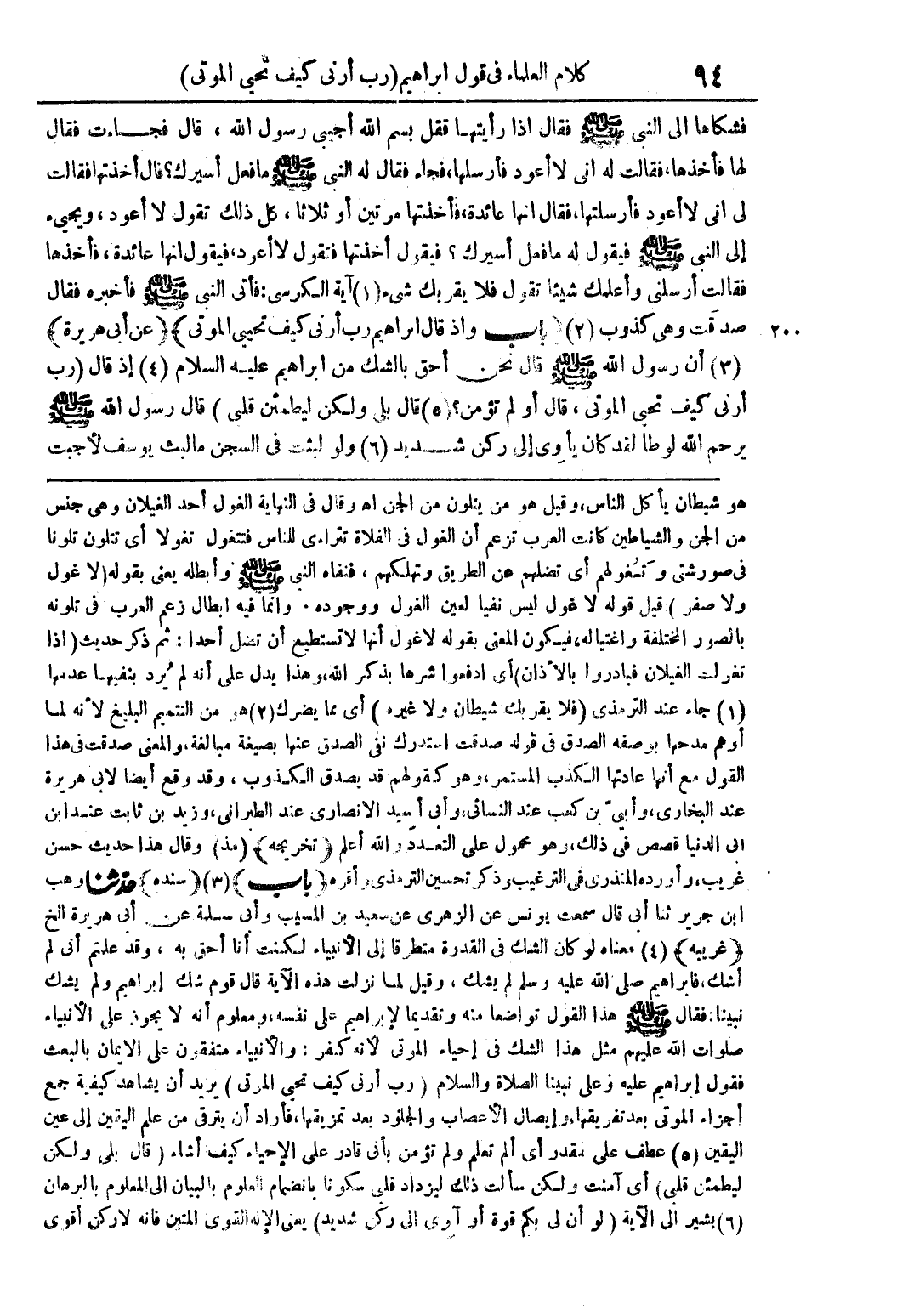 فشكاها إلى النبي صلى الله عليه وسلم فقال اذا رأيتها فقل بسم الله أجيبي رسول الله قال فجاءت فقال لها فأخذها فقالت له انى لا أعود فأرسلها فجاء فقال له النبي صلى الله عليه وسلم ما فعل أسيرك؟ قال أخذتها فقالت لي اني لا أعود فأرسلتها فقال انها عائدة فأخذتها مرتين أو ثلاثا كل ذلك تقول لا أعود ويجيء إلى النبي صلى الله عليه وسلم فيقول له ما فعل اسيرك؟ فيقول أخذتها فتقول لا اعود فيقول انها عائدة فأخذها فقالت أرسلني وأعملك شيئا تقول فلا يقربك شيء (1) آية الكرسي فأتى النبي صلى الله عليه وسلم فأخبره فقال صدقت وهي كذوب (2) (باب واذ قال ابراهيم رب ارني كيف تحيي الموتى) (عن أبي ابراهيم) (3) أن رسول الله صلى الله عليه وسلم قال نحن أحق بالشك من إبراهيم عليه السلام (4) إذ قال (رب ارني كيف تحيي الموتى قال أو لم تؤمن؟ (5) قال بلى ولكن ليطمئن قلبي) قال رسول الله صلى الله عليه وسلم يرحم الله لوطا لقد كان يأوى إلى ركن شديد (6) ولو لبثت في السجن ما لبث يوسف لأجبت