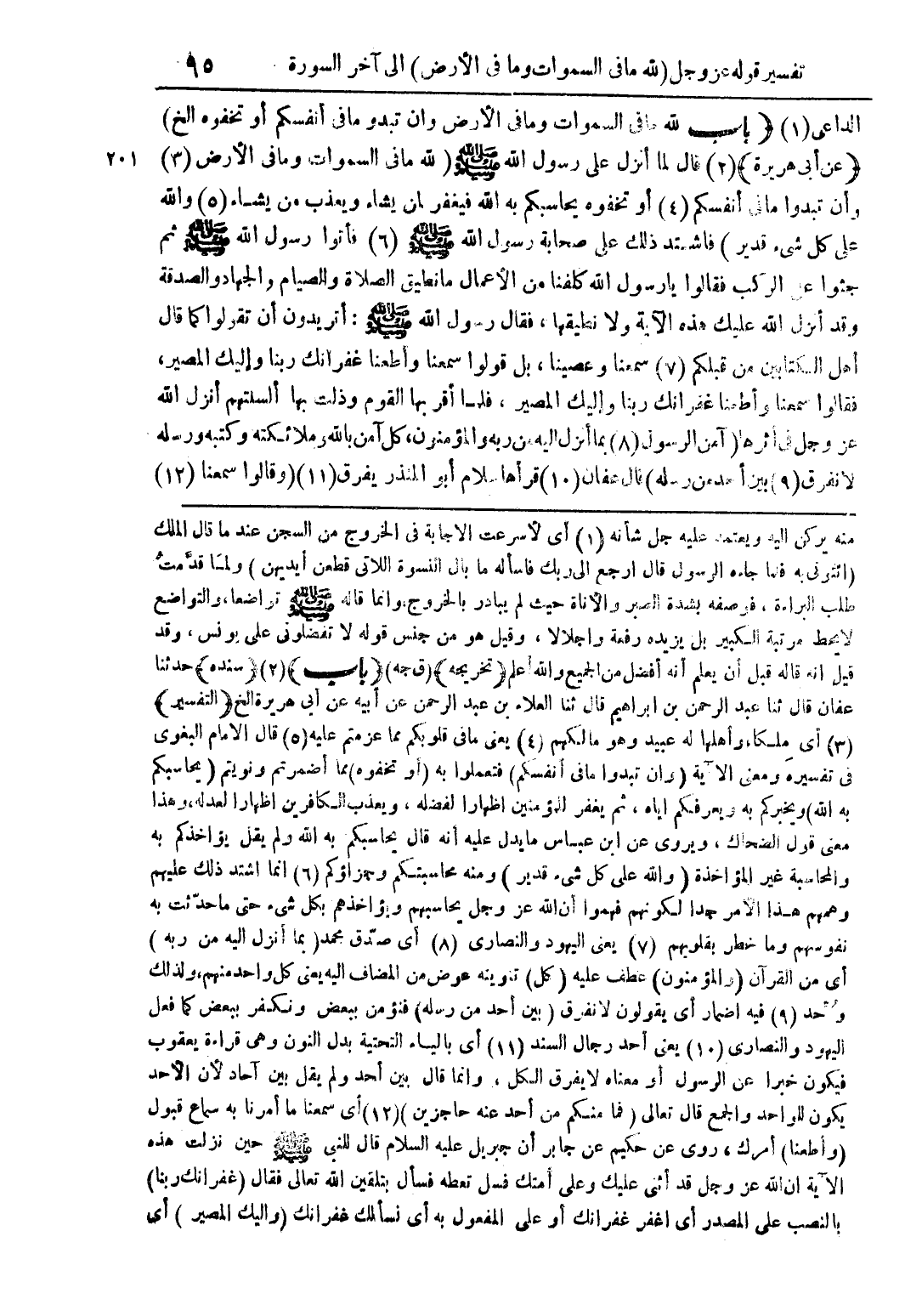 منه يركن اليه ويعتمد عليه جل شأنه (1) أي لأسرعت الاجابة في الخروج من السجن عند ما قال الملك (ائتوني به فلما جاءه الرسول قال ارجع الى ربك فاسأله ما بال النسوة اللاتي قطعن أيديهن) ولما قدمت طلب البراءة فرصفه بشدة الصبر والأناة حيث لم يبادر بالخروج وانما قال صلى الله عليه وسلم تواضعا والتواضع لا يحط مرتبة الكبير بل يزيده رفعة واجلالا وقيل هو من جنس قوله لا تفضلوني على يونس وقد قيل انه قاله قبل أن يعلم أنه أفضل من الجميع والله أعلم (تخريجه) (ق جه) (باب) (2) (سنده) حدثنا عفان قال ثنا عبد الرحمن بن ابراهيم قال ثنا العلاء بن عبد الرحمن عن أبيه عن أبي هريرة الخ (التفسير) (3) أي ملكا وأهلها له عبيد وهو مالكهم (4) يعني ما في قلوبكم مما عزمتم عليه (5) قال الامام البغوي في تفسيره ومعنى هذه الآية (وان تبدوا ما في أنفسكم) فتعملوا به (أو تخفوه) مما اضمرتم ونويتم (يحاسبكم به الله) ويخبركم به ويعرفكم اياه ثم يغفر للمؤمن اظهارا لفضله ويعذب الكافرين اظاهرا لعدله وهذا معنى قول الضحاك ويروى عن ابن عباس ما يدل عليه انه قال يحاسبكم به الله ولم يقل يؤاخذكم به والمحاسبة غير المؤاخذة (والله على كل شيء قدير) ومنه محاسبتكم وجزاؤكم (6) انما اشتد ذلك عليهم وهمهم هذا الأمر جدا لكونهم فهموا أن الله عز وجل يحاسبهم ويؤاخذهم بكل شيء حتى ما حدثت به نفوسهم وما خطر بقلوبهم (7) يعني اليهود والنصارى (8) أي صدق محمد (بما أنزل اليه من ربه) أي من القرآن (والمؤمنون) عطف عليه (كل) تنوينه عوض من المضاف اليه يعني كل واحد منهم ولذلك وحد (9) فيه اضمار أي يقولون لا نفرق (بين أحد من رسله) فنؤمن ببعض ونكفر ببعض كما فعل اليهود والنصارى (10) يعني أحد رجال السند (11) أي بالياء التحتية بدل النون وهي قراءة يعقوب فيكون خبرا عن الرسول أو معناه لا يفرق الكل وانما قال بين أحد ولم يقل بين آحاد لأن الأحد يكون للواحد والجمع قال تعالى (فما منكم من أحد عنه حاجزين) (12) أي سمعنا ما أمرنا به سماع قبول (وأطعنا) أمرك روى عن حكيم عن جابر أن جبريل عليه السلام قال للنبي صلى الله عليه وسلم حين نزلت هذه الآية ان الله عز وجل قد أثنى عليك وعلى أمتك فسل تعطه فسأل بتلقين الله تعالى فقال (غفرانك ربنا) بالنصب على المصدر أي اغفر غفرانك أو على المفعول به أي نسألك غفرانك (واليك المصير) أي