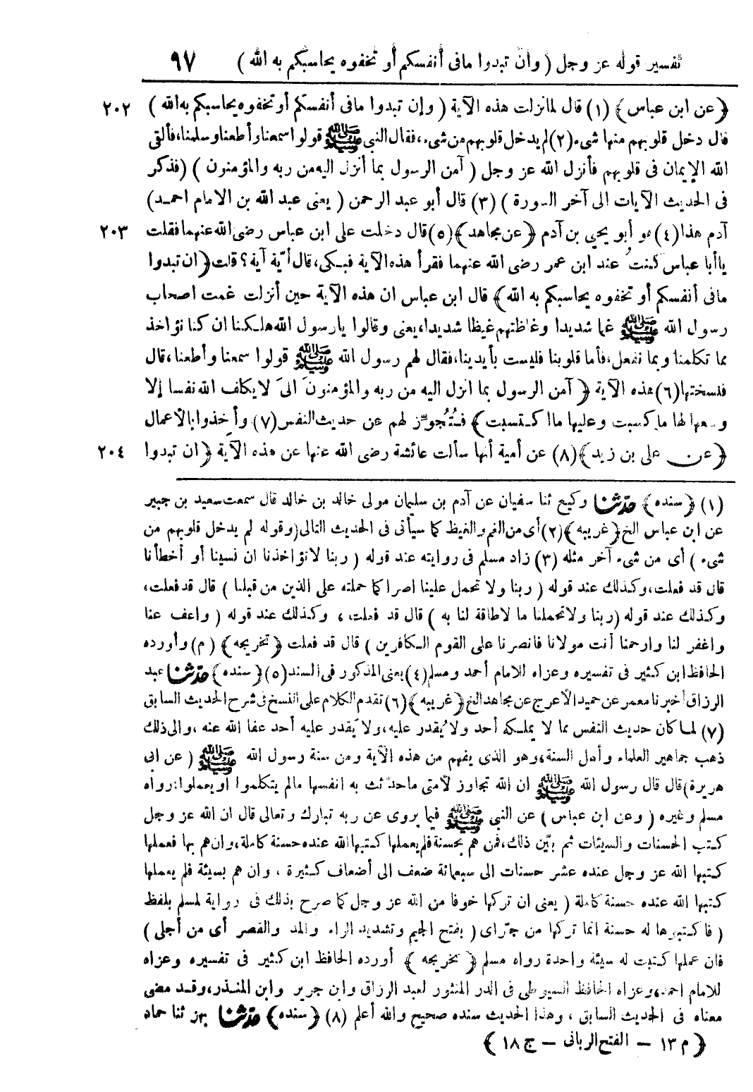 (عن ابن عباس) (1) قال لما نزلت هذه الآية (وإن تبدوا ما في أنفسكم أو تخفوه يحاسبكم به الله) قال دخل قلوبهم منها شيء (2) لم يدخل قلوبهم من شيء فقال النبي صلى الله عليه وسلم قولوا سمعنا وأطعنا وسلمنا فألقى الله الايمان في قلوبهم فأنزل الله عز وجل (آمن الرسول بما أنزل اليه من ربه والمؤمنون) (فذكر في الحديث الآيات إلى آخر السورة) (3) قال أبو عبد الرحمن (يعني عبد الله بن الامام احمد) آدم هذا (4) هو أبو يحيى بن آدم (عن مجاهد) (5) قال دخلت على ابن عباس رضي الله عنهما فقلت يا أبا عباس كنت عند ابن عمر رضي الله عنهما فقرأ هذه الآية فبكى قال أية آية؟ قلت (ان تبدوا ما في أنفسكم أو تخفوه يحاسبكم به الله) قال ابن عباس ان هذه الآية حين أنزلت غمت اصحاب رسول الله صلى الله عليه وسلم غما شديدا وغاظتهم غيظا شديدا يعني وقالوا يا رسول الله هلكنا ان كنا نؤاخذ مما تكلمنا وبما نفعل فأما قلوبنا فليست بأيدينا فقال لهم رسول الله صلى الله عليه وسلم قولوا سمعنا واطعنا قال فنسختها (6) هذه الآية (آمن رسول بما أنزل اليه من ربه والمؤمنون الى لا يكلف الله نفسا إلا وسعها لها ما كسبت وعليها ما اكتسبت) فتجوز لهم عن حديث النفس (7) وأخذوا بالأعمال (عن علي بن زيد) (8) عن أمية أنها سألت عائشة رضي الله عنها عن هذه الآية (إن تبدوا