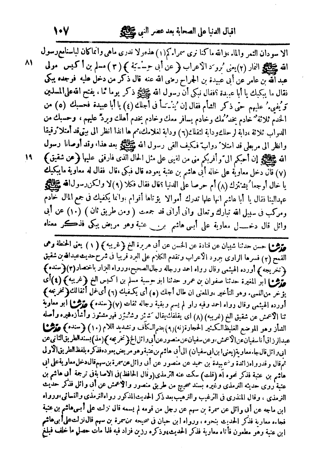 الأسودان التمر والماء والله ما كنا نرى سمراءكم (1) هذه ولا ندري ما هي وإنما كان لباسنا مع رسول الله صلى الله عليه وسلم النمار (2) يعني برود الأعراب (عن أبي حسبة) (3) مسلم بن أكيس مولى عبد الله بن عامر عن أبي عبيدة بن الجراح رضي الله عنه قال ذكر من دخل عليه فوجده يبكي فقال ما يبكيك يا أبا عبيدة؟ فقال نبكي أن رسول الله صلى الله عليه وسلم ذكر يوما ما يفتح الله على المسلمين ويفيء عليهم حتى ذكر الشأم فقال إن ينسأ في أجلك (4) يا أبا عبيدة فحسبك (5) من الخدم ثلاثة خادم يخدمك وخادم يسافر معك وخادم يخدم أهلك ويرد عليهم وحسبك من الدواب ثلاثة دابة لرحلك ودابة لثقلك (6) ودابة لغلامك ثم ها انذا انظر إلى بيتي قد امتلأ رقيقا وانظر إلى مربطي قد امتلأ دواب فكيف القى رسول الله صلى الله عليه وسلم بعد هذا وقد أوصانا رسول الله صلى الله عليه وسلم إن احبكم إلي وأقربكم مني من لقيني على مثل الحال الذي فارقني عليها (عن شقيق) (7) قال دخل معاوية على خاله أبي هاشم بن عتبة يعوده قال فبكى قال فقال له معاوية ما يبكيك يا خال أوجعا يشئزك (8) أم حرصا على الدنيا؟ قال فقال فكلا (9) لا ولكن رسول الله صلى الله عليه وسلم عهد إلينا فقال يا أبا هاشم انها علها تدرك أموالا يؤتاها أقوام وانما يكفيك في جمع المال خادم ومركب في سبيل الله تبارك وتعالى وانى اراني قد جمعت (ومن طريق ثان) (10) عن أبي وائل قال دخل معاوية على أبي هاشم بن عتبة وهو مريض يبكي فذكر معناه