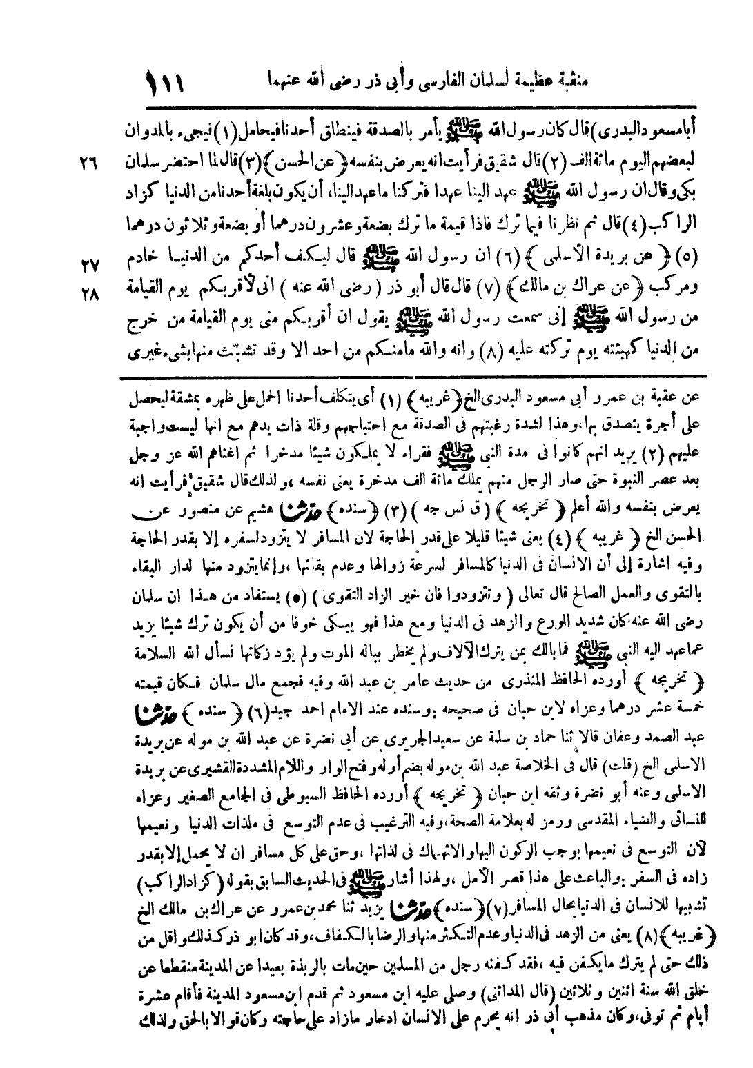 عن عقبة بن عمرو أبي مسعود البدري الخ (غريبه) (1) أي يتكلف أحدنا الحمل على ظهره بمشقة ليحصل على أجرة يتصدق بها وهذا لشدة رغبتهم في الصدقة مع احتياطهم وقلة ذات يدهم مع انها ليست واجبة عليهم (2) يريد انهم كانوا في مدة النبي صلى الله عليه وسلم فقراء لا يملكون شيئا مدخرا ثم اغناهم الله عز وجل بعد عصر النبوة حتى صار الرجل منهم يملك مائة الف مدخرة يعني نفسه ولذلك قال شقيق فرأيت أنه يعرض بنفسه والله أعلم (تخريجه) (ق نس جه) (3) (سنده) حدثنا هشيم عن منصور عن الحسن الخ (غريبه) (4) يعني شيئا قليلا على قدر الحاجة لأن المسافر لا يتزود لسفره إلا بقدر الحاجة وفيه اشارة إلى أن الانسان في الدنيا كالمسافر لسرعة زوالها وعدم بقائها وانما يتزود منها لدار البقاء بالتقوى والعمل الصالح قال تعالى (وتتزودوا فإن خير الزاد التقوى) (5) يستفاد من هذا أن سلمان رضي الله عنه كان شديد الورع والزهد في الدنيا ومع هذا فهو يبكي خوفا من أن يكون ترك شيئا يزيد عما عهد إليه النبي صلى الله عليه وسلم فما بالك بمن يترك الآلاف ولم يخطر بباله الموت ولم يؤد زكاتها نسأل الله السلامة (تخريجه) أورده الحافظ المنذري من حديث عامر بن عبد الله وفيه فجمع مال سلمان فكان قيمته خمسة عشر درهما وعزاه لابن حبان في صحيحه وسنده عند الامام احمد جيد (6) (سنده) حدثنا عبد الصمد وعفان قالا ثنا حماد بن سلمة عن سعيد الجريري عن أبي نضرة عن عبد الله بن موله عن بريدة الأسلمي الخ (قلت) قال في الخلاصة عبد الله بن موله بضم أوله وفتح الواو واللام المشددة القشيري عن بريدة الأسلمي وعنه أبو نضرة وثقة ابن حبان (تخريجه) أورده الحافظ السيوطي في الجامع الصغير وعزاه للنسائي والضياء المقدسي ورمز له بعلامة الصحة وفيه الترغيب في عدم التوسع في ملذات الدنيا ونعيمها لأن التوسع في نعيمها يوجب الركون اليها والانهماك في لذاتها وحق على كل مسافر أن لا يحمل إلا بقدر زاده في السفر والباعث على هذا قصر الأمل ولهذا أشار صلى الله عليه وسلم في الحديث السابق بقوله (كزاد الراكب) تشبيها للانسان في الدنيا مجال المسافر (7) (سنده) حدثنا يزيد ثنا محمد بن عمرو عن عراك بن مالك الخ (غريبه) (8) يعني من الزهد في الدنيا وعدم التكثر منها والرضا بالكفاف وقد كان ابو ذر كذلك واقل من ذلك حتى لم يترك ما يكفنن فيه فقد كفنه رجل من المسلمين حين مات بالربذة بعيدا عن المدينة منقطعا عن خلق الله سنة اثنين وثلاثين (قال المدائني) وصلى عليه ابن مسعود ثم قدم ابن مسعود المدينة فأقام عشرة أيام ثم توفى وكان مذهب ابي ذر انه يحرم على الانسان ادخار ما زاد على حاجته وكان قوالا بالحق ولذلك