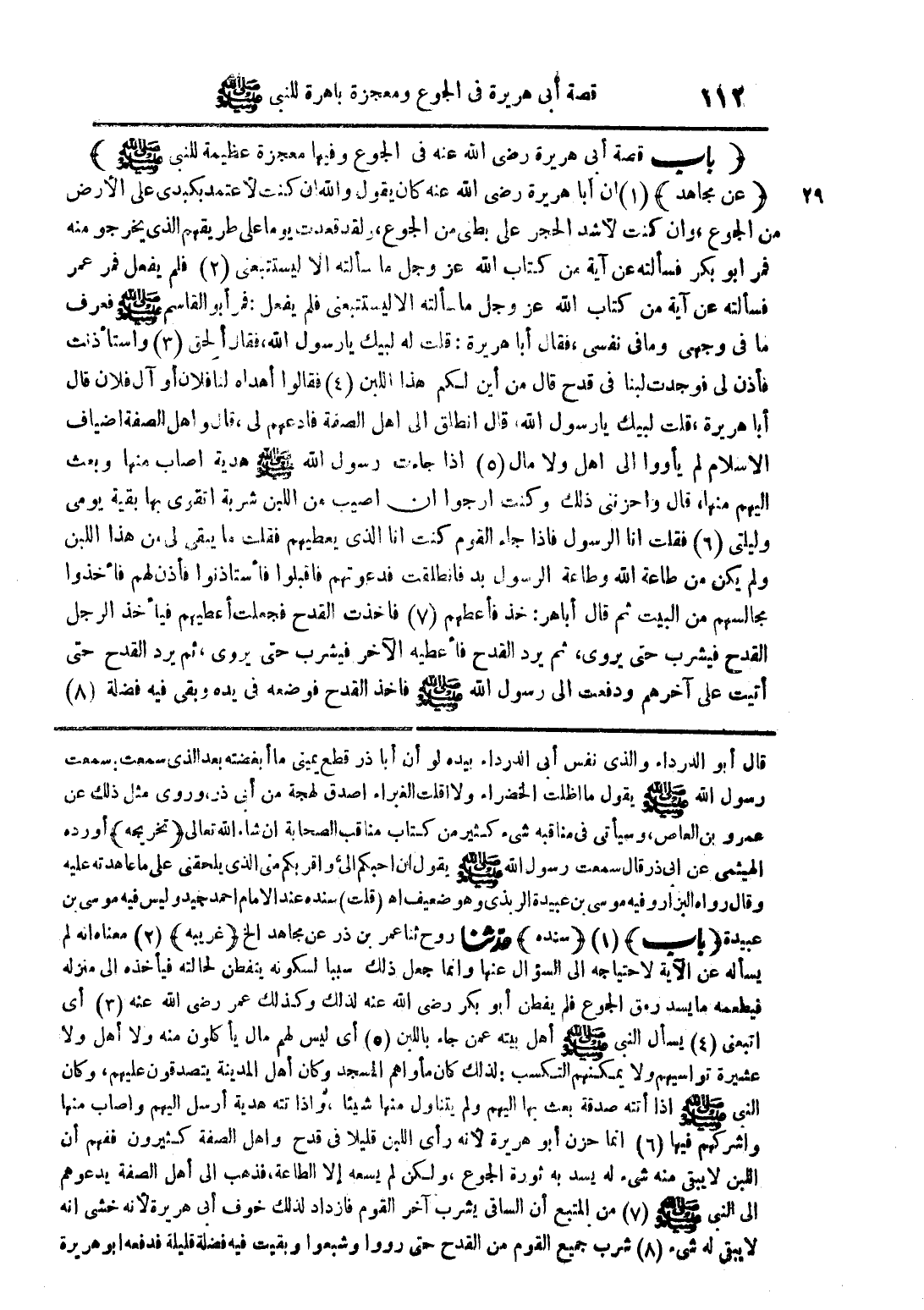 (عن مجاهد) (1) أن أبا هريرة رضي الله عنه كان يقول والله اني كنت لأعتمد بكبدي على الأرض من الجوع وان كنت لأشد الحجر على بطني من الجوع لقد قعدت يوما على طريقهم الذي يخرجو منه فمر أبو بكر فسألته عن آية من كتاب الله عز وجل ما سألته الا ليستتبعني (2) فلم يفعل فمر عمر فسألته عن آية من كتاب الله عز وجل ما سألته إلا ليستتبعني فلم يفعل فمر أبو القاسم صلى الله عليه وسلم فعرف ما في وجهي وما في نفسي فقال أبا هريرة قلت له لبيك يا رسول الله فقال ألحق (3) واستأذنت فأذن لي فوجدت لبنا في قدح قال من أين لكم هذا اللبن (4) فقالوا أهداه لنا فلان أو آل فلان قال أبا هريرة قلت لبيك يا رسول الله قال انطلق إلى أهل الصفة فادعهم لي قال واهل الصفة اضياف الاسلام لم يأووا إلى أهل ولا مال (5) إذا جاءت رسول الله صلى الله عليه وسلم هدية اصاب منها وبعث اليهم منها قال واحزنني ذلك وكنت ارجو أن اصيب من اللبن شربة اتقوى بها بقية يومي وليلتي (6) فقلت أنا الرسول فإذا جاء القوم كنت أنا الذي يعطيهم فقلت ما يبقى لي من هذا اللبن ولم يكن من طاعة الله وطاعة الرسول بد فانطلقت فدعوتهم فاقبلوا فاستأذنوا فأذن لهم فأخذوا مجالسهم من البيت ثم قال أباهر خذ فأعطهم (7) فأخذت القدح فجعلت أعطيهم فيأخذ الرجل القدح فيشرب حتى يروى ثم يرد القدح فأعطيه الآخر فيشرب حتى يروى ثم يرد القدح حتى أتيت على آخرهم ودفعت إلى رسول الله صلى الله عليه وسلم فأخذ القدح فوضعه في يده وبقي فيه فضلة (8)