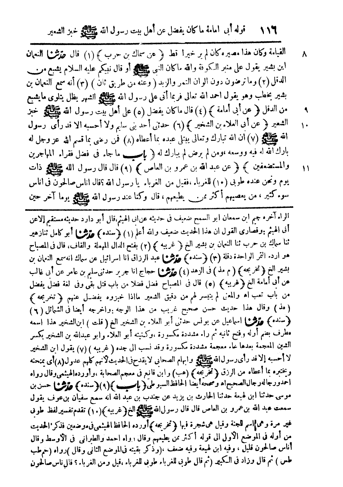 القيامة وكان هذا مصيره كان لم ير خيرا قط (عن سماك بن حرب) (1) قال حدثنا النعمان ابن بشير يقول على منبر الكوفة والله ما كان النبي صلى الله عليه وسلم أو قال نبيكم عليه السلام يشبع من الدقل (2) وما ترضون دون الوان التمر والزبد (وعنه من طريق ثان) (3) أنه سمع النعمان بن بشير يخطب وهو يقول أحمد الله تعالى فربما أتى على رسول الله صلى الله عليه وسلم الشهر يظل يتلوى ما يشبع من الدقل (عن أبي أمامة) (4) قال ما كان يفضل (5) على أهل بيت رسول الله صلى الله عليه وسلم خبز الشعير (عن أبي العلاء بن الشخير) (6) حدثني أحد بني سليم ولا أحسبه إلا قد رأى رسول الله صلى الله عليه وسلم (7) أن الله تبارك وتعالى يبتلي عبده بما أعطاه (8) فمن رضى بما قسم الله عز وجل له بارك الله له فيه ووسعه ومن لم يرض لم يبارك له (باب ما جاء في فضل فقراء المهاجرين والمستضعفين) (عن عبد الله بن عمرو بن العاص) (9) قال قال رسول الله صلى الله عليه وسلم ذات يوم ونحن عنده طوبى (10) للغرباء فقيل من الغرباء يا رسول الله؟ قال أناس صالحون في أناس سوء كثير من يعصيهم أكثر ممن يطيعهم قال وكنا عند رسول الله صلى الله عليه وسلم يوما آخر حين