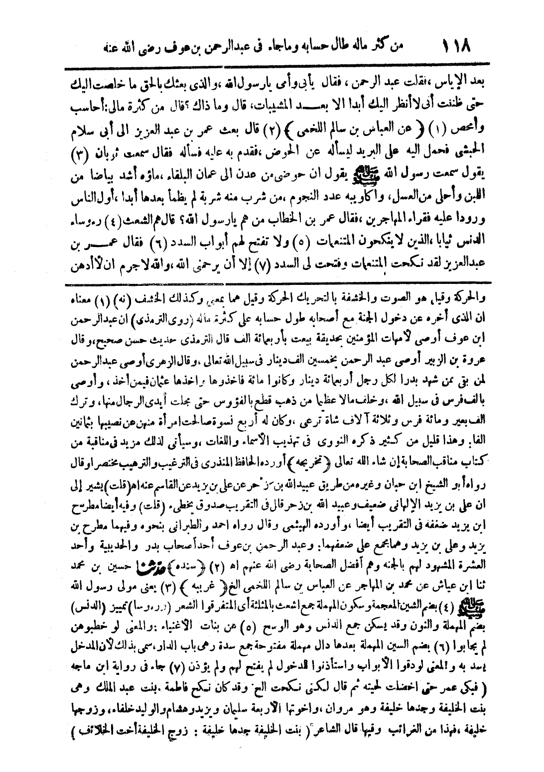 والحركة وقيل هو الصوت والخشفة بالتحريك الحركة وقيل هما بمعنى وكذلك الخشف (نه) (1) معناه أن الذي أخره عن دخول الجنة مع أصحابه طول حسابه على كثرة ماله (روى الترمذي) أن عبد الرحمن ابن عوف اوصى لأمهات المؤمنين بحديقة بيعت بأربعمائة الف قال الترمذي حديث حسن صحيح وقال عروة بن الزبير أوصى عبد الرحمن بخمسين الف دينار في سبيل الله تعالى وقال الزهري أوصى عبد الرحمن لمن بقي ممن شهد بدرا لكل رجل أربعمائة دينار وكانوا مائة فأخذوها واخذها عثمان فيمن أخذ وأوصى بألف فرس في سبيل الله وخلف مالا عظيما من ذهب قطع بالفؤوس حتى مجلت أيدي الرجال منها وترك الف بعير ومائة فرس وثلاثة آلاف شاة ترعى وكان له أربع نسوة صالحت امرأة منهن عن نصيبها بثمانين الف وهذا قليل من كثير ذكره النووي في تهذيب الأسماء واللغات وسيأتي لذلك مزيد في مناقبة من كتاب مناقب الصحابة إن شاء الله تعالى (تخريجه) أورده الحافظ المنذري في الترغيب والترهيب مختصرا وقال رواه أبو الشيخ ابن حبان وغيره من طريق عبيد الله بن زحر عن علي بن يزيد عن القاسم عنه اهـ (قلت) يشير إلى أن علي بن يزيد الإلهاني ضعيف وعبيد الله بن زخر قال في التقريب صدوق يخطئ (قلت) وفيه أيضا مطرح ابن يزيد ضعفه في التقريب أيضا وأورده الهيثمي وقال رواه أحمد والطبراني بنحوه وفيهما مطرح بن يزيد وعلي بن يزيد وهما مجمع على ضعفهما وعبد الرحمن بن عوف أحد أصحاب بدر والحديبية وأحد والعشرة المشهود لهم بالجنة وهم أفضل الصحابة رضي الله عنهم اهـ (2) (سنده) حدثنا حسين بن محمد ثنا ابن عياش عن محمد بن المهاجر عن العباس بن سالم اللخمي ال (غريبه) (3) يعني مولى رسول الله صلى الله عليه وسلم (4) بضم الشين المعجمة وسكون المهملة جمع اشعث بالمثلثة أي المتفرقوا الشعر (ورءوسا) تمييز (الدنس) بضم المهملة والنون وقد يكن جمع الدنس وهو الوسخ (5) هن بنات الأغنياء والمعنى لو خطبوهن لم يجابوا (6) بضم السين المهملة بعدها دال مهملة مفتوحة جمع سدة وهي باب الدار سمي بذلك لأن المدخل يسد به والمعنى لو دقوا الأبواب واستأذنوا للدخول لم يفتح لهم ولم يؤذن (7) جاء في رواية ابن ماجه (فبكى عمر حتى اخضلت لحيته ثم قال لكني نكحت الخ) وقد كان نكح فاطمة بنت عبد الملك وهي بنت الخليفة وجدها خليفة وهو مروان واخوتها الأربعة سلمان ويزيد وهشام والوليد خلفاء وزوجها خليفة فهذا من الغرائب وفيها قال الشاعر (بنت الخليفة جدها خليفة: زوج الخليفة أخت الخلائف)
