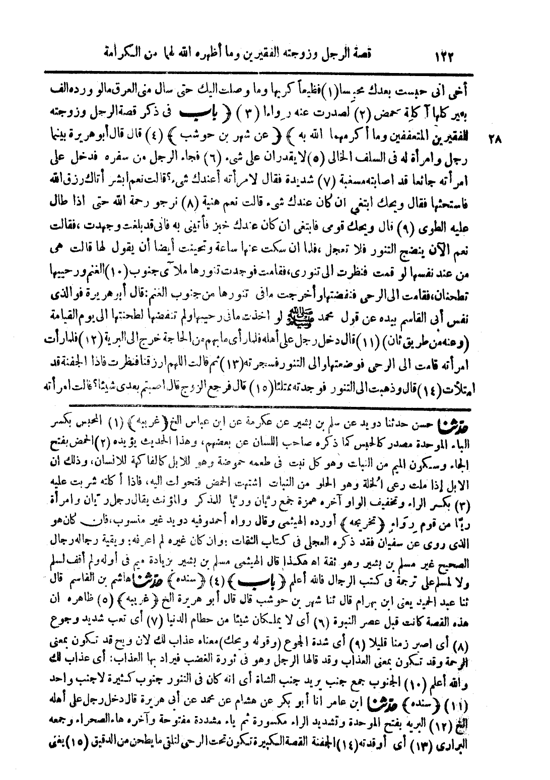 أخي إني حبست بعدك محبسا (1) فظيعا كريها وما وصلت إليك حتى سال مني العرق مالو ورده الف بعير كلها آكلة حمض (2) لصدرت عنه رواءا (3) (باب في ذكر قصة الرجل وزوجته الفقيرين المتعففين وما أكرمهما الله به) (عن شهر بن حوشب) (4) قال قال أبو هريرة بينما رجل وامرأة في السلف الخالى (5) لا يقدران على شيء (6) فجاء الرجل من سفره فدخل على امرأته جائعا قد أصابته مسغبة (7) شديدة فقال لامرأته أعندك شيء؟ قالت نعم أبشر أتاك رزق الله فاستحثها فقال ويحك ابتغي ان كان عندك شيء قالت نعم هنية (8) نرجو رحمة الله حتى إذا طال عليه الطوى (9) قال ويحك قومي فابتغي ان كان عندك خبر فأتيني به فإني قد بلغت وجهدت فقالت نعم الآن ينضج التنور فلا تعجل فلما ان سكت عنها ساعة وتحينت أيضا أن يقول لها قالت هي من عند نفسها لو قمت فنظرت إلى تنوري فقامت فوجدت تنورها ملآى جنوب (10) الغنم ورحييها تطحنان إلى الرحى فنفضتها واخرجت ما في تنورها من جنوب الغنم قال أبو هريرة فوالذي نفس أبي القاسم بيده عن قول محمد صلى الله عليه وسلم لو أخذت ما في رحييها ولم تنفضها لطحنتها إلى يوم القيامة (وعنه من طريق ثان) (11) قال دخل رجل على أهله فلما رأى ما بهم من الحاجة خرج إلى البرية (12) فلما رأت امرأته قامت إلى الرحى فوضعتها والى التنور فسجرته (13) ثم قالت اللهم ارزقنا فنظرت فإذا الجفنة قد امتلأت (14) قال وذهبت إلى التنور فوجدته ممتلئا (15) قال فرجع الزوج قال اصبتم بعدي شيئا؟ قالت امرأته