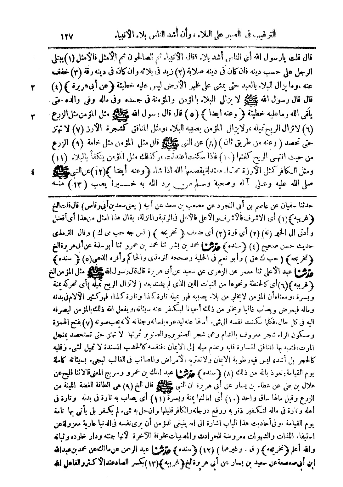 حدثنا سفيان عن عاصم بن أبي النجود عن مصعب بن سعد عن أبيه (يعني سعد بن أبي وقاص) قال قلت الخ (غريبه) (1) أي الاشرف فالأشرف والأعلى فالأعلى في الرتبة والمنزلة يقال هذا امثل من هذا أي أفضل وأدنى إلى الخير (نه) (2) أي قوة (3) أي ضعف (تخريجه) (نس جه حب مي ك) وقال الترمذي حديث حسن صحيح (4) (سنده) حدثنا محمد بن بشر ثنا محمد بن عمرو ثنا أبو سلمة عن أبي هريرة الخ (تخريجه) (حب ك هق) وأبو نعيم في الحلية وصححه الترمذي والحاكم واقره الذهبي (5) (سنده) حدثنا عبد الأعلى ثنا معمر عن الأزهري عن سعيد عن أبي هريرة قال قال رسول الله صلى الله عليه وسلم مثل المؤمن الخ (غريبه) (6) أي كالحنطة ونحوها من النبات اللين الذي لم يشتد بعد (لا تزال الريح تميله) أي تحركه يمنه ويسره ومعناه أن المؤمن لا يخلو من بلاء يصيبه فهو يميله تارة كذا وتارة كذا فهو كثير الآلام في بدنه وماله فيعرض ويصاب غالبا ويخلو من ذلك أحيانا ليكفر عنه سيئاته ويفعل الله ذلك بالمؤمن ليصرفه إليه في كل حال فكلما سكنت نفسه إلى شيء أمالها عنه ليدعوه بلسانه وجنانه لأنه يحب صوته (7) بفتح الهمزة وسكون الراء شجر معروف بالشام وهي شجر الصنوبر والصنوبر ثمرتها لا تهتز حتى تحصد بمنجل الموت فشبه بها المنافق لقساوة قلبه وعدم ميله إلى الايمان فنفسه كالخشب المسندة لا تميل لشيء وقلبه كالحجر بل أشد ليس فيه رطوبة الايمان ولا تعتريه الأمراض والمصائب في الغالب ليجئ بسيئاته كاملة يوم القيامة نعوذ بالله من ذلك (8) (ستنده) حدثنا عبد الملك بن عمرو وسريج المعنى قالا ثنا فليح عن هلال بن علي عن عطاء بن يسار عن أبي هريرة ان النبي صلى الله عليه وسلم قال الخ (9) هي الطاقة الغضة اللينة من الزرع وقيل مالها ساق واحد (10) أي امالتها يمنة ويسرة (11) اي يصاب به تارة في بدنه وتارة في أهله وتارة في ماله لتكفير ذنوبه ورفع درجاته والكافر قليلها وان حل به شيء لم يكفر بل يأتي بها تامة يوم القيامة وفي أحاديث هذا الباب اشارة إلى انه ينبغي للمؤمن أن يرى نفسه في الدنيا عارية معزولة عن استيفاء اللذات والشهوات معروضة للحوادث والمصيبات مخلوقة للآخرة لأنها جنته ودار خلوده وثباته والله أعلم (تخريجه) (ق وغيرهما) (12) (سنده) حدثنا عبد الرحمن عن مالك عن محمد بن عبد الله ابن أبي صعصعة عن سعيد بن يسار عن أبي هريرة الخ (غريبه) (13) بكسر الصاد عند الأكثر والفاعل الله