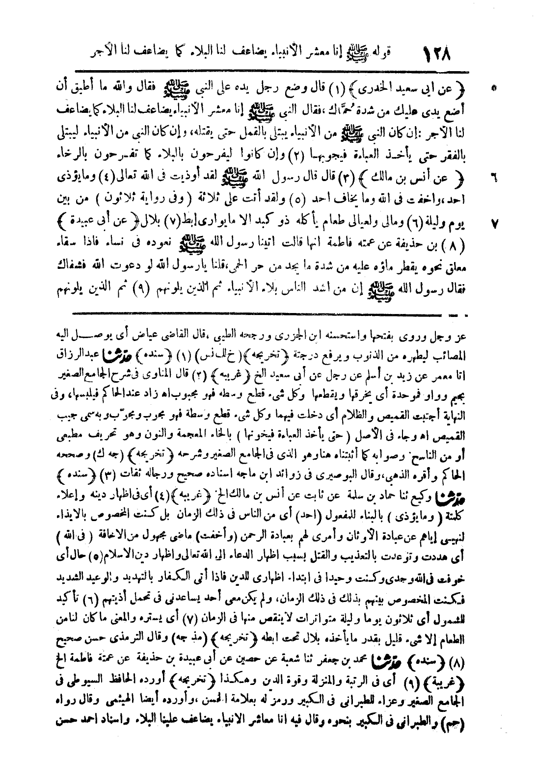 (عن أبي سعيد الخدري) (1) قال وضع رجل يده على النبي صلى الله عليه وسلم فقال والله ما أطيق أن أضع يدي عليك من شدة حماك فقال النبي صلى الله عليه وسلم إنا معشر الأنبياء يضاعف لنا البلاء كما يضاعف لنا الأجر إن كان النبي صلى الله عليه وسلم من الأنبياء يبتلى بالقمل حتى يقتله وإن كان النبي من الأنبياء ليبتلى بالفقر حتى يأخذ العباءة فيجوبها (2) وان كانوا ليفرحون بالبلاء كما تفرحون بالرخاء (عن أنس بن مالك) (3) قال قال رسول الله صلى الله عليه وسلم لقد أوذيت في الله تعالى (4) وما يؤذى أحد واخفت في الله وما يخاف أحد (5) ولقد اتت على ثلاثة (وفي رواية ثلاثون) من بين يوم وليلة (6) ومالي ولعيالي طعام يأكله ذو كبد الا ما يوارى ابط (7) بلال (عن أبي عبيدة) (8) بن حذيفة عن عمته فاطمة انها قالت اتينا رسول الله صلى الله عليه وسلم نعوده في نساء فإذا سقاه معلق نحوه يقطر ماؤه عليه من شدة ما يجد من حر الحمى قلنا يا رسول الله لو دعوت الله فشفاك فقال رسول الله صلى الله عليه وسلم إن من أشد الناس بلاء الأنبياء ثم الذين يلونهم (9) ثم الذين يلونهم