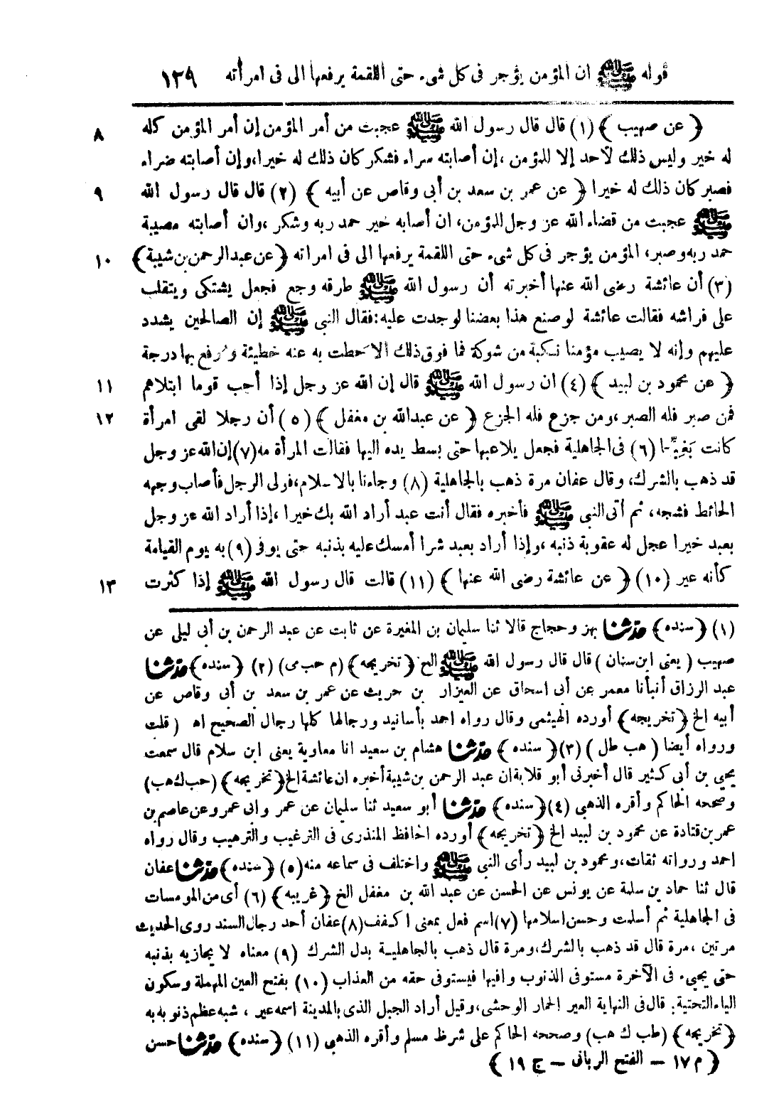 (عن صهيب) (1) قال قال رسول الله صلى الله عليه وسلم عجبت من أمر المؤمن إن أمر المؤمن كله له خير وليس ذلك لأحد إلا للمؤمن إن اصابته سراء فشكر كان ذلك له خير وإن اصابته ضراء فصبر كان ذلك له خيرا (عن عمر بن سعد بن ابي وقاص عن أبيه) (2) قال قال رسول الله صلى الله عليه وسلم عجبت من قضاء الله عز وجل للمؤمن إن اصابه خير حمد ربه وشكره وان اصابته مصيبة حمد ربه وصبر المؤمن يؤجر في كل شيء حتى اللقمة يرفعها إلى في امرأته (عن عبد الرحمن بن شيبه) (3) أن عائشة رضي الله عنها أخبرته أن رسول الله صلى الله عليه وسلم طرقه فجعل يشتكي ويتقلب على فراشه فقالت عائشة لو صنع هذا بعضنا لوجدت عليه فقال النبي صلى الله عليه وسلم إن الصالحين يشدد عليهم وإنه لا يصيب مؤمنا نكبة من شوكة فما فوق ذلك إلا حطت به عنه خطيئة ورفع بها درجة (عن محمود بن لبيد) (4) أن رسول الله صلى الله عليه وسلم قال إن الله عز وجل إذا أحب قوما ابتلاهم فمن صبر فله الصبر ومن جزع فله الجزع (عن عبد الله بن مغفل) (5) أن رجلا لقي امرأة كانت بغيا (6) في الجاهلية فجعل يلاعبها حتى بسط يده إليها فقالت المرأة مه (7) إن الله عز وجل قد ذهب بالشرك وقال عفان مرة ذهب بالجاهلية (8) وجاءنا بالإسلام فولى الرجل فأصاب وجهه الحائظ فشجه ثم أتى النبي صلى الله عليه وسلم فأخبره فقال أنت عبد أراد الله بك خيرا إذا أراد الله عز وجل بعبد خيرا عجل له عقوبة ذنبه وإذا أراد بعبد شرا أمسك عليه بذنبه حتى يوفى (9) به يوم القيامة كأنه عير (10) (عن عائشة رضي الله عنها) (11) قالت قال رسول الله صلى الله عليه وسلم إذا كثرت