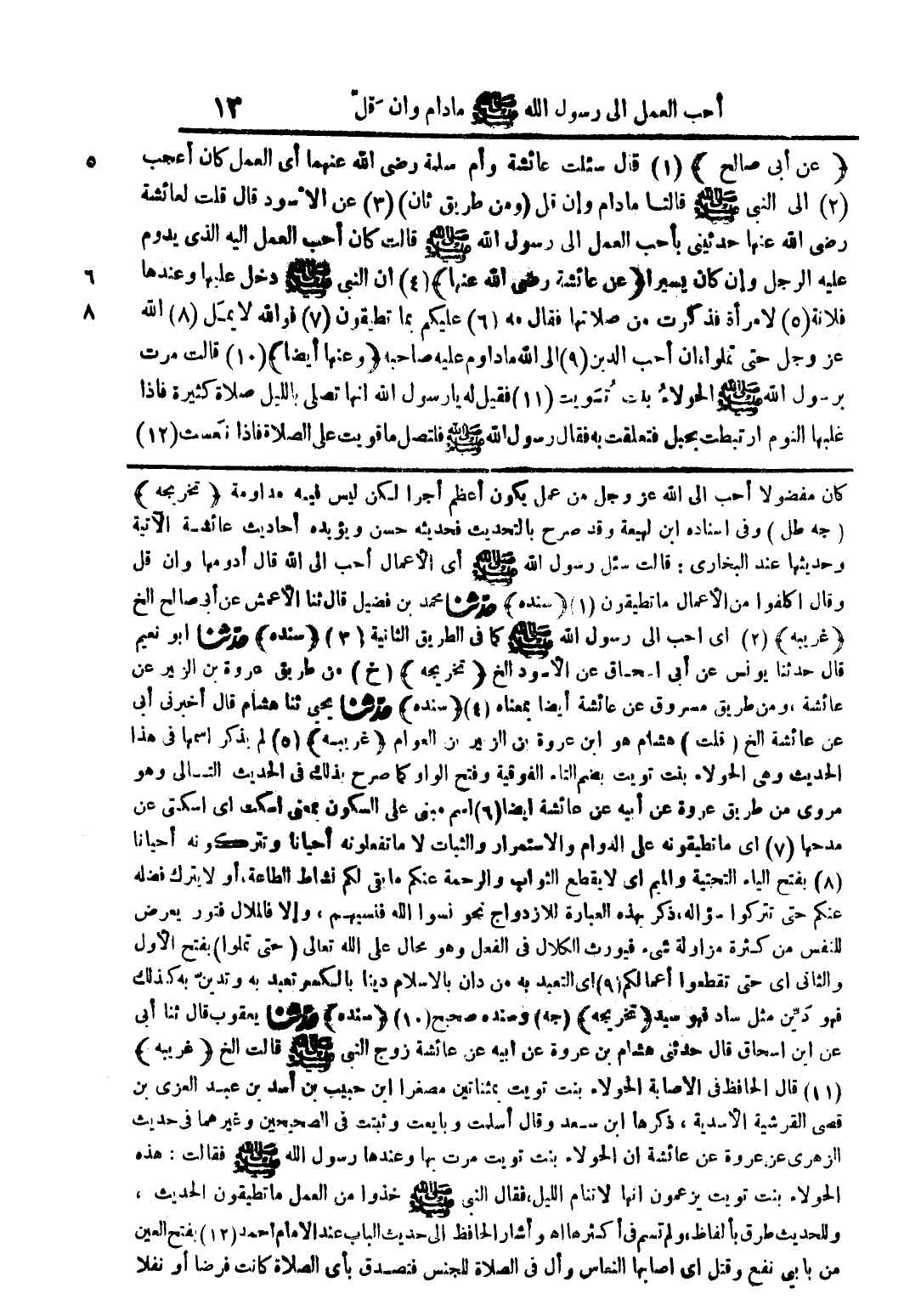 (عن أبي صالح) (1) قال سئلت عائشة وأم سلمة رضي الله عنهما أي العمل كان أعجب (2) إلى النبي صلى الله عليه وسلم قالتا ما دام وإن قل (ومن طريق ثان) (3) عن الأسود قال قلت لعائشة رضي الله عنها حدثيني بأحب العمل إلى رسول الله صلى الله عليه وسلم قالت كان أحب العمل إليه الذي يدوم عليه الرجل وإن كان يسيرا (عن عائشة رضي الله عنها) (4) أن النبي صلى الله عليه وسلم دخل عليها وعندها فلانه (5) لامرأة فذكرت من صلاتها فقال (6) عليكم بما تطيقون (7) فوالله لا يمل (8) الله عز وجل حتى تملوا إن أحب الدين (9) إلى الله ما داوم عليه صاحبه (وعنها أيضا) (10) قالت مرت برسول الله صلى الله عليه وسلم الحولاء بنت تويت (11) فقيل له يا رسول الله صلى الله عليه وسلم إنها تصلى بالليل صلاة كثيرة فإذا غلبها النوم ارتبطت بحبل فتعلقت به فقال رسول الله صلى الله عليه وسلم فلتصل ما قويت على الصلاة فإذا نعست (12)