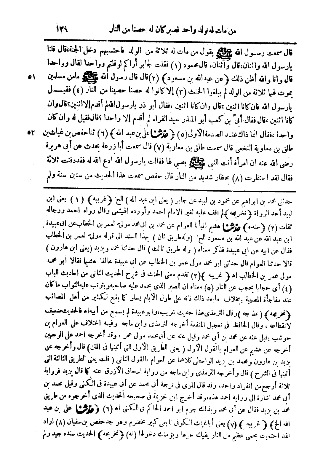حدثني محمد بن ابراهيم عن محمود بن لبيد عن جابر (يعني ابن عبد الله) الخ (غريبه) (1) يعني ابن لبيد احد الرواة (تخريجه) لم أقف عليه لغير الامام أحمد وأورده الهيثمي وقال رواه أحمد ورجاله ثقات (2) (سنده) حدثنا هشيم انبأنا العوام عن محمد بن أبي محمد مولى لعمر بن الخطاب عن أبي عبيدة ابن عبد الله عن عبد الله بن مسعود الخ (وله طريق ثان) بهذا السند إلى قوله مولى لعمر بن الخطاب فقال عن أبيه عن أبي عبيده فذكر معناه (وله طريق ثالث) قال حدثنا محمد ويزيد (يعني ابن هارون) قالا حدثنا العوام قال حدثني ابو محمد مولى عمر بن الخطاب عن أبي عبيدة خالفا هشيما فقالا أبو محمد مولى عمر بن الخطاب اهـ (غريبه) (3) تقدم معنى الحنث في شرح الحديث الثاني من احاديث الباب (4) أي حجابا يحجب من النار (5) معناه أن الصبر الذي يحمد عليه صاحبه ويترتب عليه الثواب ما كان عند مفاجأة المصيبة بخلاف ما بعد ذلك فإنه على طول الأيام يسلو كما يقع لكثير من أهل المصائب (تخريجه) (مذ جه) وقال الترمذي هذا حديث غريب وابو عبيدة لم يسمع من أبيه اهـ فالحديث ضعيف لا نقاطعه وقال الحافظ في تعجيل المنفعة أخرجه الترمذي وابن ماجه وفيه اختلاف على العوام بن حوشب قيل عنه عن محمد بن أبي محمد وقيل عنه عن أبي محمد مولى عمر وقد أخرجه احمد على الوجهين أخرجه عن هشيم عن العوام بالقول الأول (يعني الطريق الأولى التي أثبتها في المتن) قال واخرجه عن يزيد بن هارون ومحمد بن يزيد الواسطي كلاهما عن العوام بالقول الثاني (قلت يعني الطريق الثالثة التي أثبتها الشرح) قال وأخرجه الترمذي وابن ماجه من رواية اسحاق الأزرق عنه كما قال يزيد فرواية ثلاثة أرجح من انفراد واحد وقد قال المزي في ترجمة أبي محمد عن أبي عبيدة في الكنى وقيل محمد بن أبي محمد إشارة إلى رواية أحمد هذه وقد أخرج ابن خزيمة في صحيحه الحديث الذي اخرجوه من طريق محمد بن يزيد فقال عن أبي محمد وبذلك جزم أبو احمد الحاكم في الكنى اهـ (6) (حدثنا علي بن عبد الله الخ) (غريبه) (7) يعني أبا غياث الكوفي تابعي كبير مخضرم وهو جد حفص بن سفيان (8) أراد لقد احتميت بحمى عظيم من النار يفيك حرها ويؤمنك دخولها (نه) (تخريجه) الحديث سنده جيد ولم