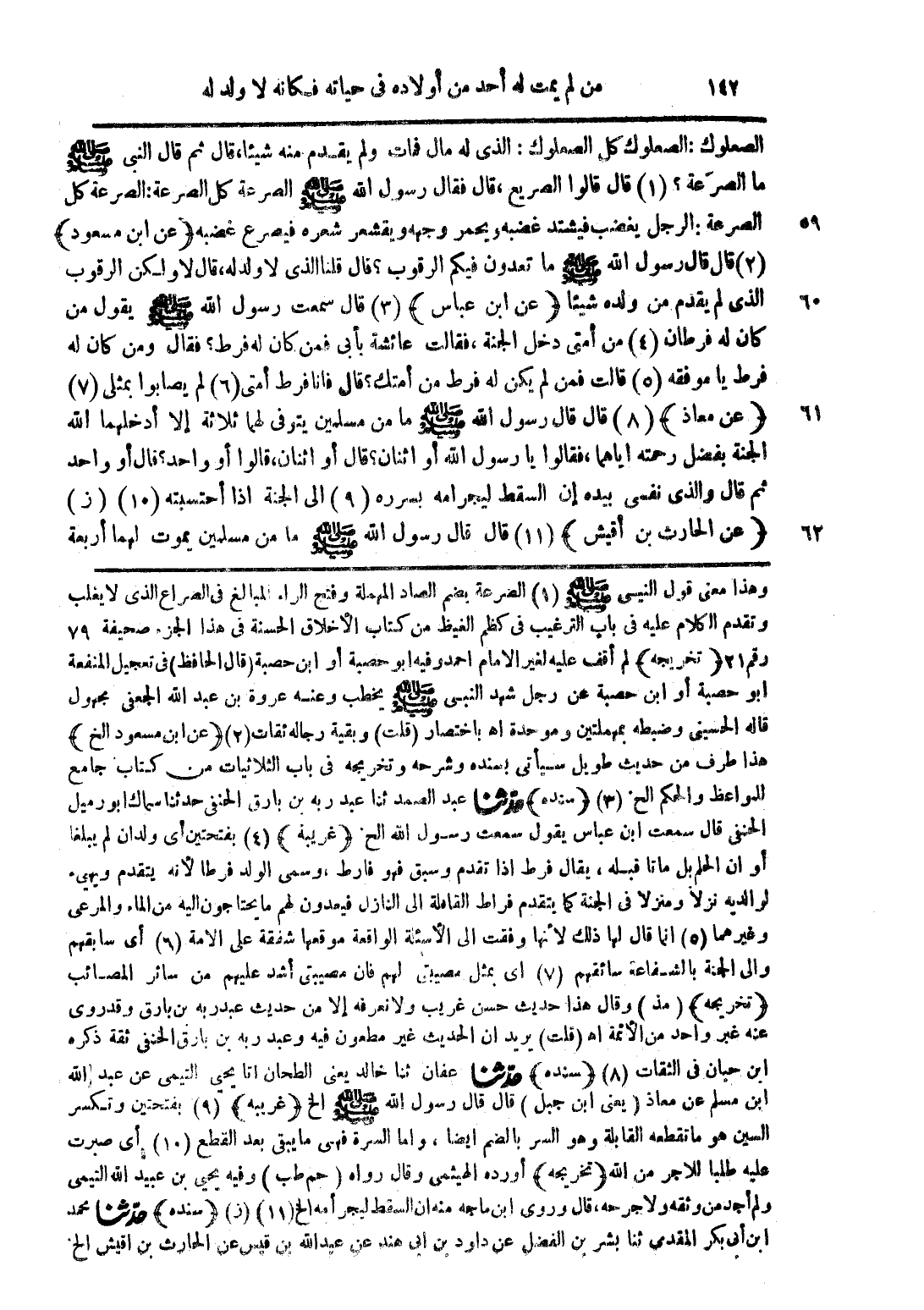 الصعلوك الصعلوك كل الصعلوك الذي له مال فمات ولم يقدم منه شيئا قال ثم قال النبي صلى الله عليه وسلم ما الصرعة؟ (1) قال قالوا الصريع قال فقال رسول الله صلى الله عليه وسلم الصرعة كل الصرعة الصرعة كل الصرعة الرجل يغضب فيشد غضبه ويحمر وجهه ويقشعر شعره فيصرع غضبه (عن ابن مسعود) (2) قال قال رسول الله صلى الله عليه وسلم ما تعدون فيكم الرقوب؟ قال قلنا الذي لا ولد له قال لا ولكن الرقوب الذي لم يقدم من ولده شيئا (عن ابن عباس) (3) قال سمعت رسول الله صلى الله عليه وسلم يقول من كان له فرطان (4) من أمتى دخل الجنة فقالت عائشة بأبي فمن كان له فرط؟ فقال ومن كان له فرط يا موفقه (5) قالت فمن لم يكن له فرط من أمتك؟ قال فانا فرط أمتي (6) لم يصابوا بمثلي (7) (عن معاذ) (8) قال قال رسول الله صلى الله عليه وسلم ما من مسلمين يتوفى لهما ثلاثة إلا أدخلهما الله الجنة بفضل رحمته اياهما فقالوا يا رسول الله أو اثنان؟ قال أو اثنان قالوا أو واحد؟ قال أو واحد ثم قال والذي نفسي بيده إن السقط ليجرامه بسرره (9) إلى الجنة إذا احتسبته (10) (ز) (عن الحارث بن أقيش) (11) قال قال رسول الله صلى الله عليه وسلم ما من مسلمين يموت لهما أربعة