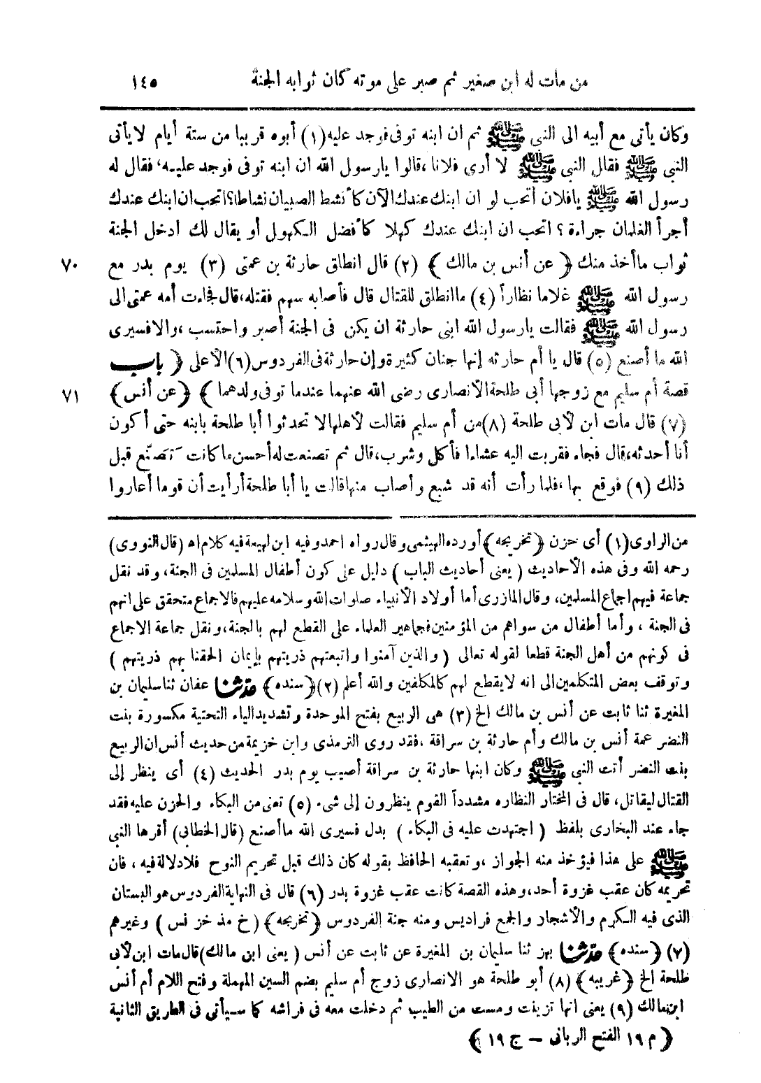 وكان يأتي مع أبيه إلى النبي صلى الله عليه وسلم ثم ان ابنه توفي فوجد عليه (1) أبوه قريبا من ستة أيام لا يأتي النبي صلى الله عليه وسلم فقال النبي صلى الله عليه وسلم لا أرى فلانا قالوا يا رسول الله ان ابنه توفي فوجد عليه فقال له رسول الله صلى الله عليه وسلم يا فلان أتحب لو ان ابنك عندك الآن كأنشط الصبيان نشاطا؟ أتحب ان ابنك عندك أجرأ الغلمان جراءة؟ اتحب ان ابنك عندك كهلا كأفضل الكهول أو يقال لك ادخل الجنة ثواب ما أخذ منك (عن أنس بن مالك) (2) قال انطاق حارثة بن عمتي (3) يوم بدر مع رسول الله صلى الله عليه وسلم غلاما نظارا (4) ما انطلق للقتال فأصابه سهم فقتله قال فجاءت أمه عمتي إلى رسول الله صلى الله عليه وسلم فقالت يا رسول الله ابني حارثة ان يكن في الجنة اصبر واحتسب والا فسيرى الله ما اصنع (5) قال يا أم حارثة إنها جنان كثيرة وإن حارثة في الفردوس (6) الأعلى (باب قصة أم سليم مع زوجها أبي طلحة الأنصاري رضي الله عنهما عندما توفي ولدهما) (عن أنس) (7) قال مات ابن لأبي طلحة (8) من أم سليم فقالت لأهلها لا تحدثوا أبا طلحة بابنه حتى أكون انا أحدثه قال فجاء فقربت إليه عشاءا فأكل وشرب قال ثم تصنعت له أحسن ما كانت تصنع قبل ذلك (9) فوقع بها فلما رأت أنه قد شبع وأصاب منها قالت يا أبا طلحة أرأيت أن قوماً أعاروا