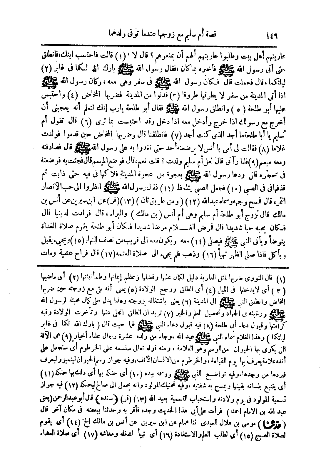 (1) قال النووي ضربها لمثل العارية دليل لكمال علمها وفضلها وعظم إيمانها وطمأنينتها (2) أي ماضيها (3) أي لا يدخلها في الليل (4) أي الطلق ووجع الولادة (5) يعني أنه بقي مع زوجته حين ضربها المخاض وانطلق النبي صلى الله عليه وسلم إلى المدينة (6) يعني باشتغاله بزوجته وهذا يدل على كمال محبته لرسول الله صلى الله عليه وسلم ورغبته في الجهاد وتحصيل العلم والخير (7) تريد أن الطلق انجلى عنها وتأخرت الولادة وفيه كرامتها وقبول دعاء أبي طلحة (8) فيه قبول دعاء النبي صلى الله عليه وسلم لهما حيث قال (بارك الله لكما في غابر ليلتكما) وهذا الغلام سماه النبي صلى الله عليه وسلم عبد الله وجاء من ولده عشرة رجال علماء أخيار (9) هي الآلة التي يكوى بها الحيوان من الوسم وهو العلامة ومنه قوله تعالى (سنسمه على الخرطوم) أي سنجعل على أنفه علامة يعرف بها يوم القيامة والخرطوم من الإنسان الأنف وفيه جواز وسم الحيوان ليتميز وليعرف فيردها من وجدها وفيد تواضع النبي صلى الله عليه وسلم ووسمه بيده (10) أي حنكه بها أي دلك بها حنكه (11) أي يتتبع بلسانه بقيتها ويمسح به شفتيه وفيد تحنيك المولود وأنه يحمل إلى صالح ليحنكه (12) فيه جواز تسمية المولود في يوم ولادته واستحباب التسمية بعبد الله (13) (قر) (سنده) قال أبو عبد الرحمن (يعني عبد الله بن الامام أحمد) فرأت على أبي هذا الحديث وجده فأقر به وحدثنا ببعضه في مكان آخر قال (حدثنا) موسى بن هلال العبدي ثنا همام عن ابن سيرين عن أنس بن مالك الخ (14) أي يقوم لصلاة الصبح (15) أي لطلب العلم والاستفادة (16) أي تهيأ لشغله ومعاشه (17) أي صلاة العشاء