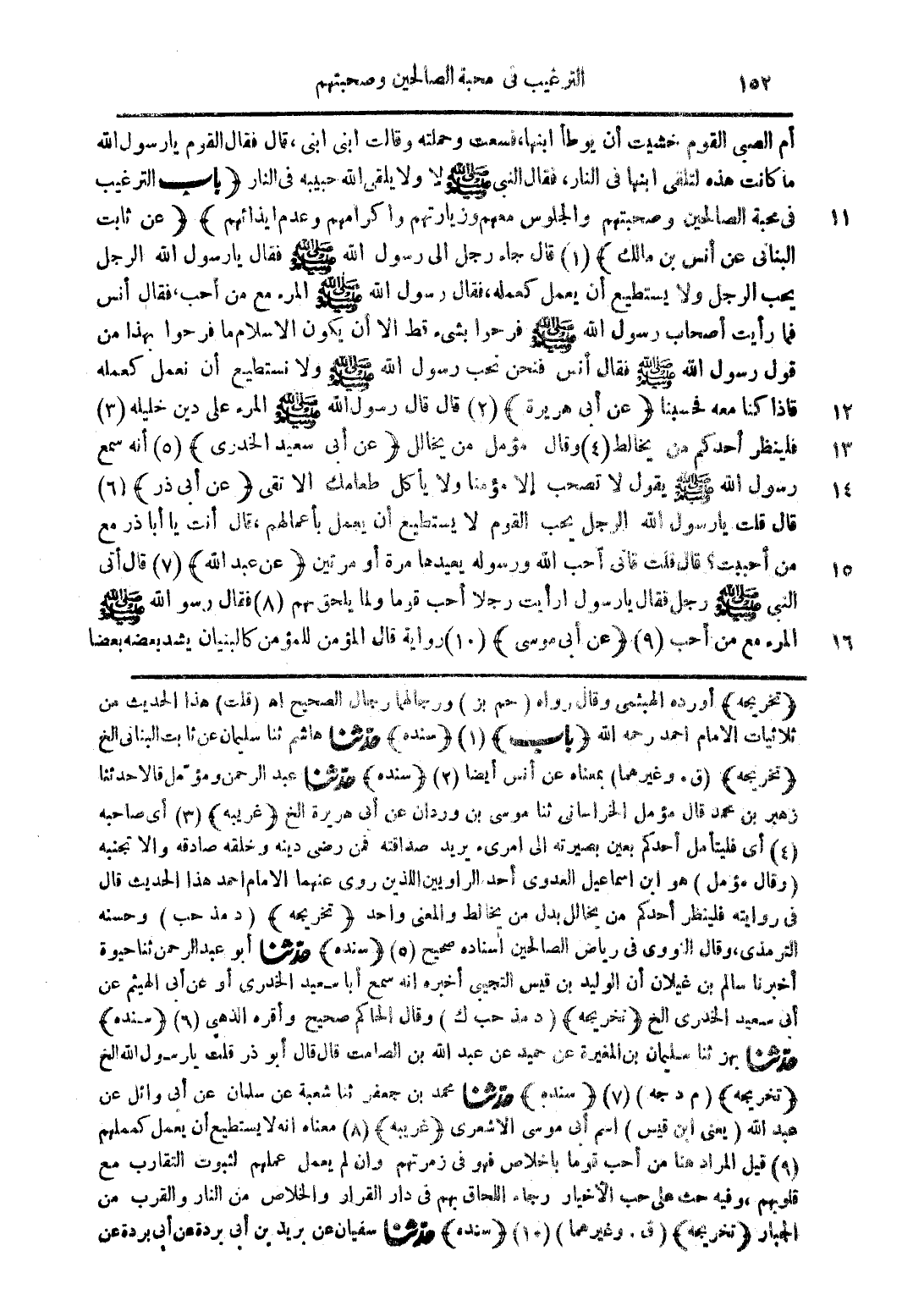 أم الصبي القوم خشيت أن يوطأ ابنها فسعت وحملته وقالت ابني ابني قال فقال القوم يا رسول الله ما كانت هذه لتلقى ابنها في النار فقال النبي صلى الله عليه وسلم لا ولا يلقى الله حبيبه في النار (باب الترغيب في محبة الصالحين وصحبتهم والجلوس معهم وزيارتهم واكرامهم وعدم إيذائهم) (عن ثابت البناني عن أنس بن مالك) (1) قال جاء رجل إلى رسول الله صلى الله عليه وسلم فقال يا رسول الله الرجل يحب الرجل ولا يستطيع أن يعمل كعمله فقال رسول الله صلى الله عليه وسلم المرء مع من أحب فقال انس فما رأيت أصحاب رسول الله صلى الله عليه وسلم فرحوا بشيء قط الا أن يكون الاسلام ما فرحوا بهذا من قول رسول الله صلى الله عليه وسلم فقال أنس فنحن نحب رسول الله صلى الله عليه وسلم ولا نستطيع أن نعمل كعمله فإذا كنا معه فحسبنا (عن أبي هريرة) (2) قال قال رسول الله صلى الله عليه وسلم المرء على دين خليله (3) فلينظر أحدكم من يخالط (4) وقال مؤمل من يخالل (عن أبي سعيد الخدري) (5) أنه سمع رسول الله صلى الله عليه وسلم يقول لا تصحب إلا مؤمنا ولا يأكل طعامك الا تقي (عن أبي ذر) (6) قال قلت يا رسول الله الرجل يحب القوم لا يستطيع أن يعمل بأعمالهم قال انت يا أبا ذر مع من أحببت؟ قال قلت فإني أحب الله ورسوله يعيدها مرة أو مرتين (عن عبد الله) (7) قال اتى النبي صلى الله عليه وسلم رجل فقال يا رسول أرأيت رجلا أحب قوما ولما يلحق بهم (8) فقال رسول الله صلى الله عليه وسلم المرء مع من أحب (9) (عن أبي موسى) (10) رواية قال المؤمن للمؤمن كالبنيان يشد بعضه بعضا