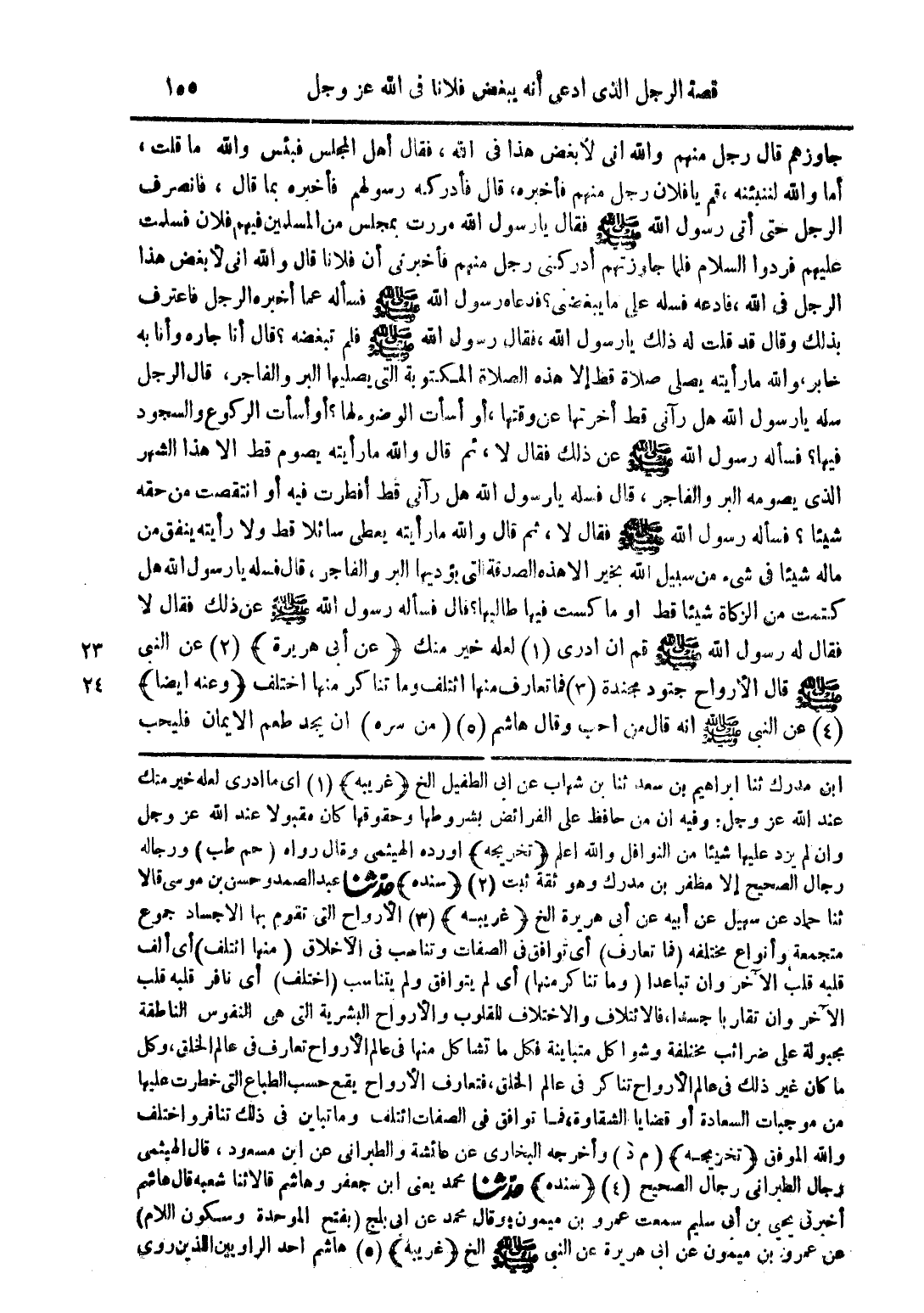 جاوزهم قال رجل منهم والله اني لأبغض هذا في الله فقال أهل المجلس فبئس والله ما قلت أما والله لننبئنه قم يا فلان رجل منهم فأخبره قال فأدركه رسولهم فأخبره بما قال فانصرف الرجل حتى اتى رسول الله صلى الله عليه وسلم فقال يا رسول الله مررت بمجلس من المسلمين فيهم فلان فسلمت عليهم فردوا السلام فلما جاوزتهم أدركني رجل منهم فأخبرني أن فلانا قال والله اني لأبغض هذا الرجل في الله فادعه فسله على ما يبغضني؟ فدعاه رسول الله صلى الله عليه وسلم فسأله عما أخبره الرجل فاعترف بذلك وقال قد قلت له ذلك يا رسول الله فقال رسول الله صلى الله عليه وسلم فلم تبغضه؟ قال أنا جاره وأنا به خابر والله ما رأيته يصلي صلاة قط إلا هذه الصلاة المكتوبة التي يصليها البر والفاجر قال الرجل سله يا رسول الله هل رآني قط أخرتها عن وقتها أو أسأت الوضوء لها؟ أو أسأت الركوع والسجود فيها؟ فسأله رسول الله صلى الله عليه وسلم عن ذلك فقال لا ثم قال والله ما رأيته يصوم قط إلا هذا الشهر الذي يصومه البر والفاجر قال فسله يا رسول الله هل رآني قط أفطرت فيه أو انتقصت من حقه شيئا؟ فسأله رسول الله صلى الله عليه وسلم فقال لا ثم قال والله ما رأيته يعطي سائلا قط ولا رأيته ينفق من ماله شيئا في شيء من سبيل الله بخير الا هذه الصدقة التي يؤديها البر والفاجر قال فسله يا رسول الله هل كتمت من الزكاة شيئا قط أو ما كست فيها طالبها؟ قال فسأله رسول الله صلى الله عليه وسلم عن ذلك فقال لا فقال له رسول الله صلى الله عليه وسلم قم ان ادرى (1) لعله خير منك (عن أبي هريرة) (2) عن النبي صلى الله عليه وسلم قال الأرواح جنود مجندة (3) فما تعارف منها ائتلف وما تناكر منها اختلف (وعنه ايضا) (4) عن النبي صلى الله عليه وسلم أنه قال من أحب وقال هاشم (5) (من سره) أن يجد طعم الإيمان فليحب