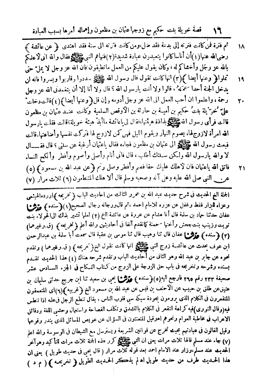 ثم فترة فمن كانت فترته إلى بدعة فقد ضل ومن كانت فترته إلى سنة فقد اهتدى (عن عائشة) رضي الله عنها (1) أن أناسا كانوا يتعبدون في عبادة شديدة (2) فنهاهم النبي صلى الله عليه وسلم فقال والله إني لأعلمكم بالله عز وجل وأخشاكم له وكان يقول عليكم من العمل ما تطيقون فإن الله عز وجل لا يمل حتى تملوا (وعنها أيضا) (3) أنها كانت تقول قال رسول الله صلى الله عليه وسلم سددوا وقاربوا ويسروا فإنه لن يدخل الجنة أحدا عمله قالوا ولا انت يا رسول الله؟ قال ولا أنا إلا أن يتغمدني الله عز وجل رحمة واعلموا أن احب العمل إلى الله عز وجل أدومه وإن قل (وعنها أيضا) (4) قالت دخلت على خويلة بنت حكيم بن أمية بن حارثة بن الأوقص السلمية وكانت عند عمان بن مطعون قالت فرأى رسول الله صلى الله عليه وسلم بذاذة هيئتها فقال لي يا عائشة ما أبذ هيئة خويلة؟ قالت فقلت يا رسول الله امرأة لها زوج يصوم النهار ويقوم الليل فهي كمن لا زوج لها فتركت نفسها وأضاعتها قالت فبعث رسول الله صلى الله عليه وسلم إلى عثمان بن مظعون فجاءه فقال يا عثمان أرغبة عن سنتي؟ قال فقال لا والله يا رسول الله ولكن سنتك أطلب قال فإني أنام وأصلى وأصوم وأفطر وانكح النساء فاتق الله يا عثمان فإن لأهلك عليك حقا فصم وافطر وصل ونم (عن عبدالله بن مسعود) (5) عن النبي صلى الله عليه وعلى آله وصحبه وسلم قال ألا هلك المتنطعون (6) ثلاث مرار (7)