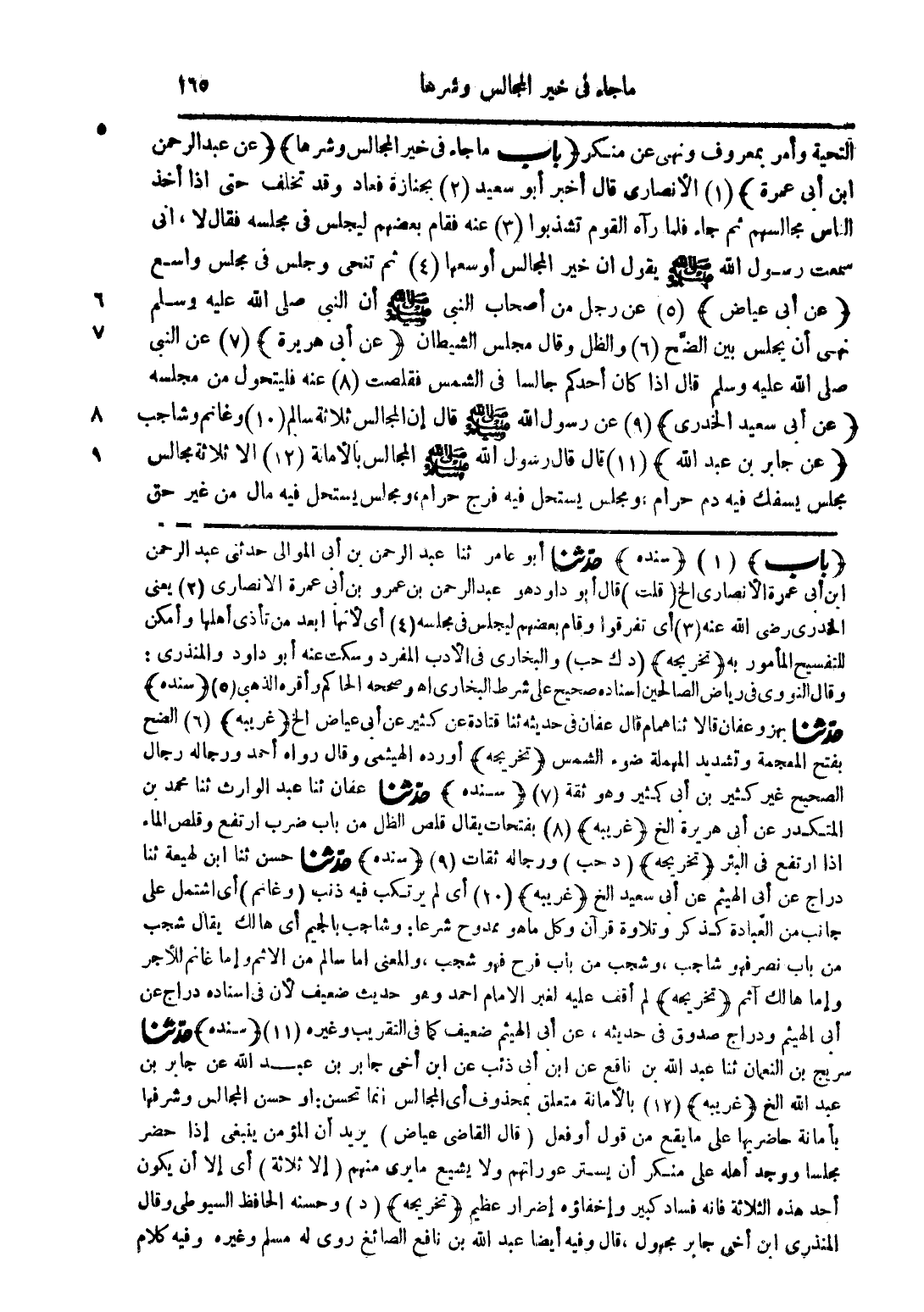 (باب) (1) (سنده) حدثنا أبو عامر ثنا عبد الرحمن بن أبي الموالي حدثني عبد الرحمن ابن أبي عمرة الأنصاري الخ (قلت) قال أبو داود هو عبد الرحمن بن عمرو بن أبي عمرة الأنصاري (2) يعني الخدري رضي الله عنه (3) أي تفرقوا وقام بعضهم ليجلس في مجلسه (4) أي لأنها أبعد من تأذى أهلها وامكن للتفسيح المأمور به (تخريجه) (د ك حب) والبخاري في الأدب المفرد وسكت عنه أبو داود والمنذري وقال النووي في رياض الصالحين اسناده صحيح على شرط البخاري اهـ وصححه الحاكم وأقره الذهبي (5) (سنده) حدثنا بهز وعفان قالا ثنا همام قال عفان في حديثه ثنا قتادة عن كثير عن أبي عياض الخ (غريبه) (6) الضح بفتح المعجمة وتشديد المهملة ضوء الشمس (تخريجه) أورده الهيثمي وقال رواه أحمد ورجاله رجال الصحيح غير كثير بن أبي كثير وهو ثقة (7) (سنده) حدثنا عفان ثنا عبد الوارث ثنا محمد بن المتكدر عن أبي هريرة الخ (غريبه) (8) بفتحات يقال قلص الظل من باب ضرب ارتفع وقلص الماء اذا ارتفع في البئر (تخريجه) (د حب) ورجاله ثقات (9) (سنده) حدثنا حسن ثنا ابن لهيعة ثنا دراج عن أبي الهيثم عن ابي سعيد الخ (غريبه) (10) أي لم يرتكب فيه ذنب (وغانم) اي اشتمل على جانب من العبادة كذكر وتلاوة قرآن وكل ما هو ممدوح شرعا وشاجب بالجيم أي هالك يقال شجب من باب نصر فهو شاجب وشجب من باب فرح فهو شجب والمعنى أما سالم من الاثم واما غانم للأجر واما هالك آثم (تخريجه) لم أقف عليه لغير الامام أحمد وهو حديث ضعيف لأن في اسناده دراج عن أبي الهيثم ودراج صدوق في حديثه عن أبي الهيثم ضعيف كما في التقريب وغيره (11) حدثنا سريج بن النعمان ثنا عبد الله بن نافع عن ابن أبي ذئب عن ابن أخي جابر بن عبد الله عن جابر بن عبد الله الخ (غريبه) (12) بالأمانة متعلق بمحذوف أي المجالس انما تحسن أو حسن المجالس وشرفها بأمانة حاضريها على ما يقع من قول أو فعل (قال القاضي عياض) يزيد أن المؤمن ينبغي إذا حضر مجلسا ووجد أهله على منكر أن يستر عوراتهم ولا يشيع ما يرى منهم (إلا ثلاثة) اي إلا أن يكون أحد هذه الثلاثة فإنه فساد كبير واخفاؤه إضرار عظيم (تخريجه) (د) وحسنه الحافظ السيوطي وقال المنذري ابن اخي جابر مجهول قال وفيه ايضا عبد الله بن نافع الصائغ روى له مسلم وغيره وفيه كلام