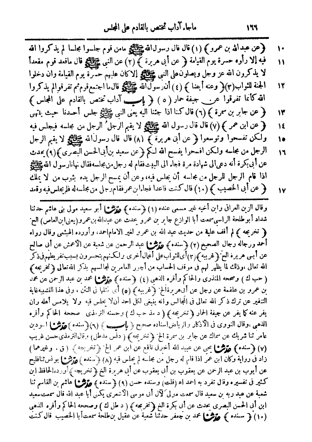 (عن عبد الله بن عمرو) (1) قال قال رسول الله صلى الله عليه وسلم ما من قوم جلسوا مجلسا لم يذكروا الله فيه إلا رأوه حسرة يوم القيامة (عن أبي هريرة) (2) عن النبي صلى الله عليه وسلم قال ما قعد قوم مقعدا لا يذكرون الله عز وجل ويصلون على النبي صلى الله عليه وسلم الا كان عليهم حسرة يوم القيامة وان دخلوا الجنة للثواب (3) (وعنه أيضا) (4) أن رسول الله صلى الله عليه وسلم قال ما اجتمع قوم ثم تفرقوا لم يذكروا الله كأنما تفرقوا عن جيفة حمار (5) (باب آداب تختص بالقادم على المجلس) (عن جابر بن سمرة) (6) قال كنا إذا جئنا إليه يعني النبي صلى الله عليه وسلم جلس احدنا حيث ينتهي (عن ابن عمر) (7) قال قال رسول الله صلى الله عليه وسلم لا يقيم الرجل الرجل من مجلسه فيجلس فيه ولكن تفسحوا وتوسعوا (عن أبي هريرة) (8) قال قال رسول الله صلى الله عليه وسلم لا يقيم الرجل الرجل من مجلسه ولكن افسحوا يفسح الله لكم (عن سعيد بن أبي الحسن البصري) (9) يحدث عن أبي بكرة أنه دعى إلى شهادة مرة فجاء إلى البيت فقام له رجل من مجلسه فقال نهانا رسول الله صلى الله عليه وسلم إذا قام الرجل للرجل من مجلسه أن يجلس فيه وعن أن يمسح الرجل يده بثوب من لا يملك (عن أبي الخصيب) (10) قال كنت قاعدا فجاء ابن عمر فقام رجل من مجلسه له فلم يجلس فيه وقعد