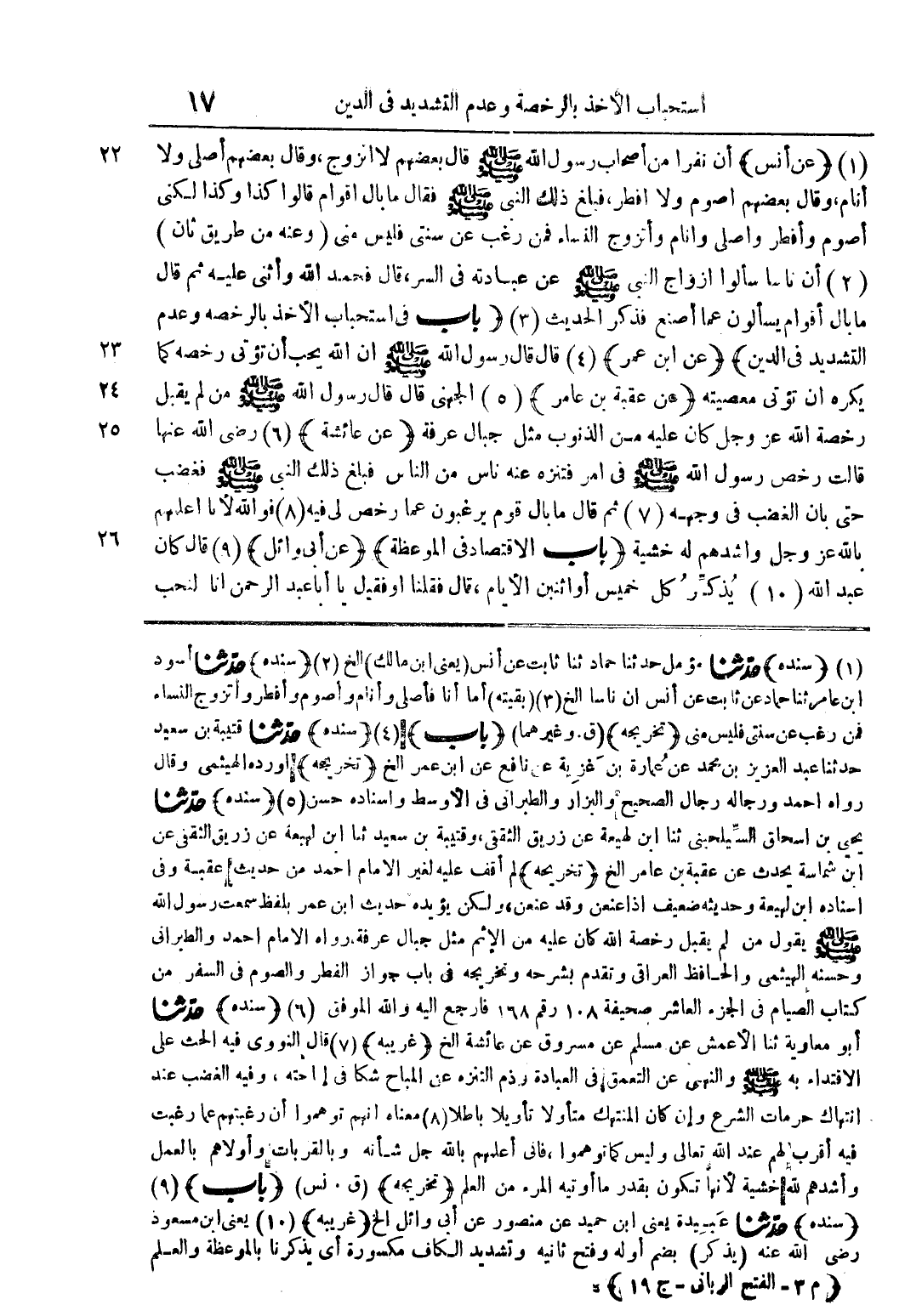 (1) (عن أنس) أن نفرا من أصحاب رسول الله صلى الله عليه وسلم قال بعضهم لا اتزوج وقال بعضهم أصلى ولا أنام وقال بعضهم أصوم ولا أفطر فبلغ ذلك النبي صلى الله عليه وسلم فقال ما بال أقوام قالوا كذا وكذا لكني أصوم وأفطر وأصلي وأنام وأتزوج من النساء فمن رغب عن سنتي فليس مني (وعنه من طريق ثان) (2) أن ناسا سألوا أزواج النبي صلى الله عليه وسلم عن عبادته في السر قال فحمد الله وأثنى عليه ثم قال ما بال أقوام يسألون عما أصنع فذكر الحديث (3) (باب في استحباب الأخذ بالرخصة وعدم التشديد في الدين) (عن ابن عمر) (4) قال قال رسول الله صلى الله عليه وسلم ان الله يحب أن تؤتي رخصة كما يكره أن تؤتي معصيته (عن عقبة بن عامر) (5) الجهنى قال قال رسول الله صلى الله عليه وسلم من لم يقبل رخصة الله عز وجل كان عليه من الذنوب مثل جبال عرفة (عن عائشة) (6) رضي الله عنها قالت رخص رسول الله صلى الله عليه وسلم في أمر فتنزه عنه ناس من الناس فبلغ ذلك النبي صلى الله عليه وسلم فغضب حتى بان الغضب في وجهه (7) ثم قال ما بال قوم يرغبون عما رخص لي فيه (8) فوالله لأنا أعلمهم بالله عز وجل واشدهم له خشية (باب الاقتصاد في الموعظة) (عن أبي وائل) (9) قال كان عبد الله (10) يذكر كل خميس أو اثنين الأيام قال فقلنا أو فقيل يا أبا عبد الرحمن إنا لنحب