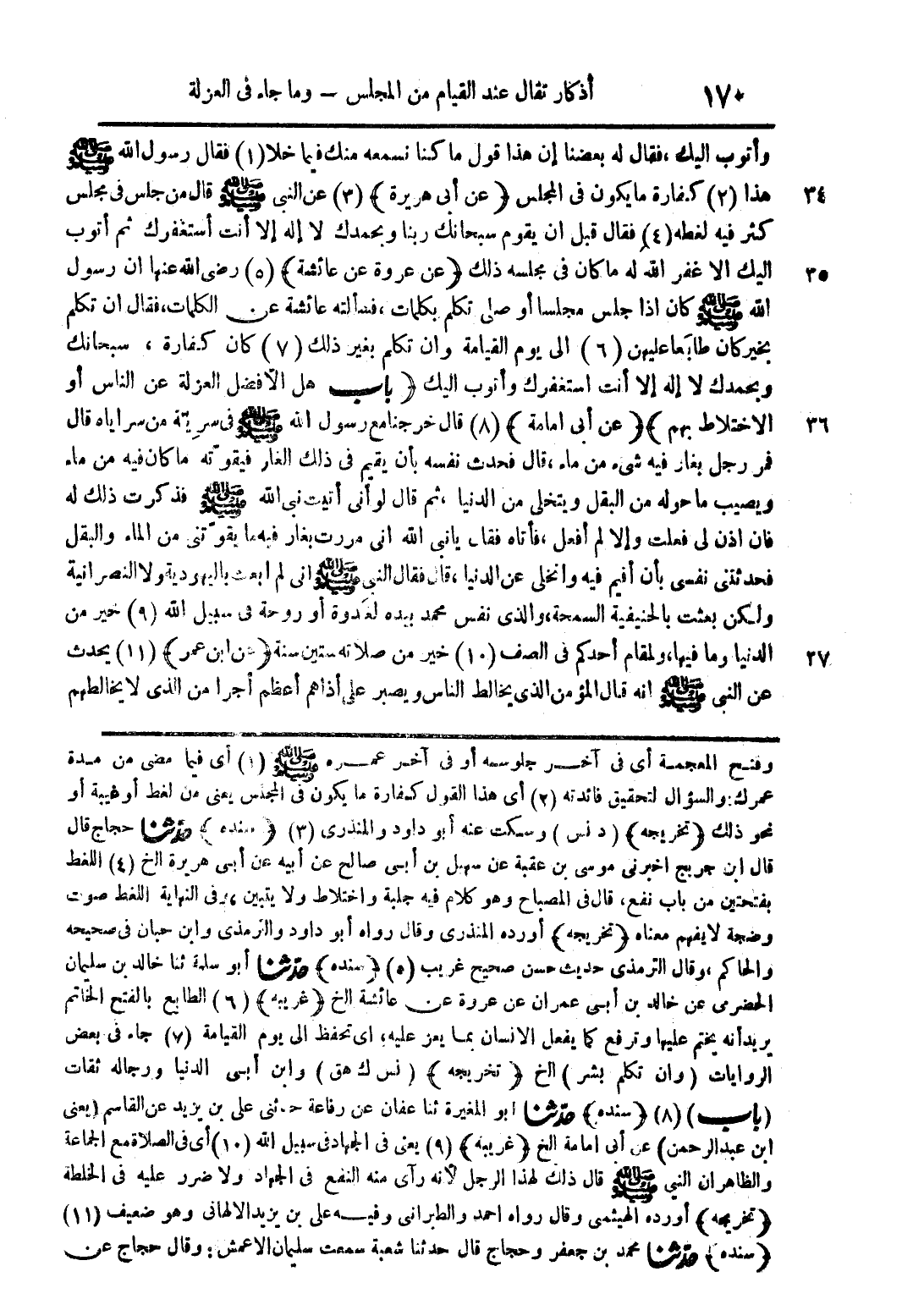 وأتوب إليك فقال له بعضنا إن هذا قول ما كنا نسمعه منك فيما خلا (1) فقال رسول الله صلى الله عليه وسلم هذا (2) كفارة ما يكون في المجلس (عن أبي هريرة) (3) عن النبي صلى الله عليه وسلم قال من جلس في مجلس كثر فيه لغطه (4) فقال قبل أن يقوم سبحانك ربنا وبحمدك لا إله إلا أنت استغفرك ثم اتوب اليك الا غفر الله له ما كان في مجلسه ذلك (عن عروة عن عائشة) (5) رضي الله عنها أن رسول الله صلى الله عليه وسلم كان إذا جلس مجلسا أو صلى تكلم بكلمات فسألته عائشة عن الكلمات فقال ان تكلم بخير كان طابعا عليهن (6) إلى يوم القيامة وان تكلم بغير ذلك (7) كان كفارة سبحانك وبحمدك لا إله إلا أنت استغفرك واتوب اليك (باب هل الافضل العزلة عن الناس أو الاختلاط بهم) (عن أبي أمامة) (8) قال خرجنا مع رسول الله صلى الله عليه وسلم في سرية من سراياه قال فمر رجل بغار فيه شيء من ماء قال فحدث نفسه بأن يقيم في ذلك الغار فيقوته ما كان فيه من ماء ويصيب ما حوله من البقلى ويتخلى من الدنيا ثم قال لو أني أتيت نبي الله صلى الله عليه وسلم فذكرت ذلك له فإن اذن لي فعلت والا لم أفعل فأتاه فقال يانبي الله اني مررت بغار فيه ما يقوتني من الماء والبقل فحدثني نفسي بأن اقيم فيه واتخلى عن الدنيا قال فقال النبي صلى الله عليه وسلم اني لم ابعث باليهودية ولا النصرانية ولكن بعثت بالحنيفية السمحة والذي نفس محمد بيده لغدوة أو روحة في سبيل الله (9) خير من الدنيا وما فيها ولمقام أحدكم الصف (10) خير من صلاته ستين سنة (عن ابن عمر) (11) يحدث عن النبي صلى الله عليه وسلم أنه قال المؤمن الذي يخالط الناس ويصبر على اذاهم اعظم أجرا من الذي لا يخالطهم