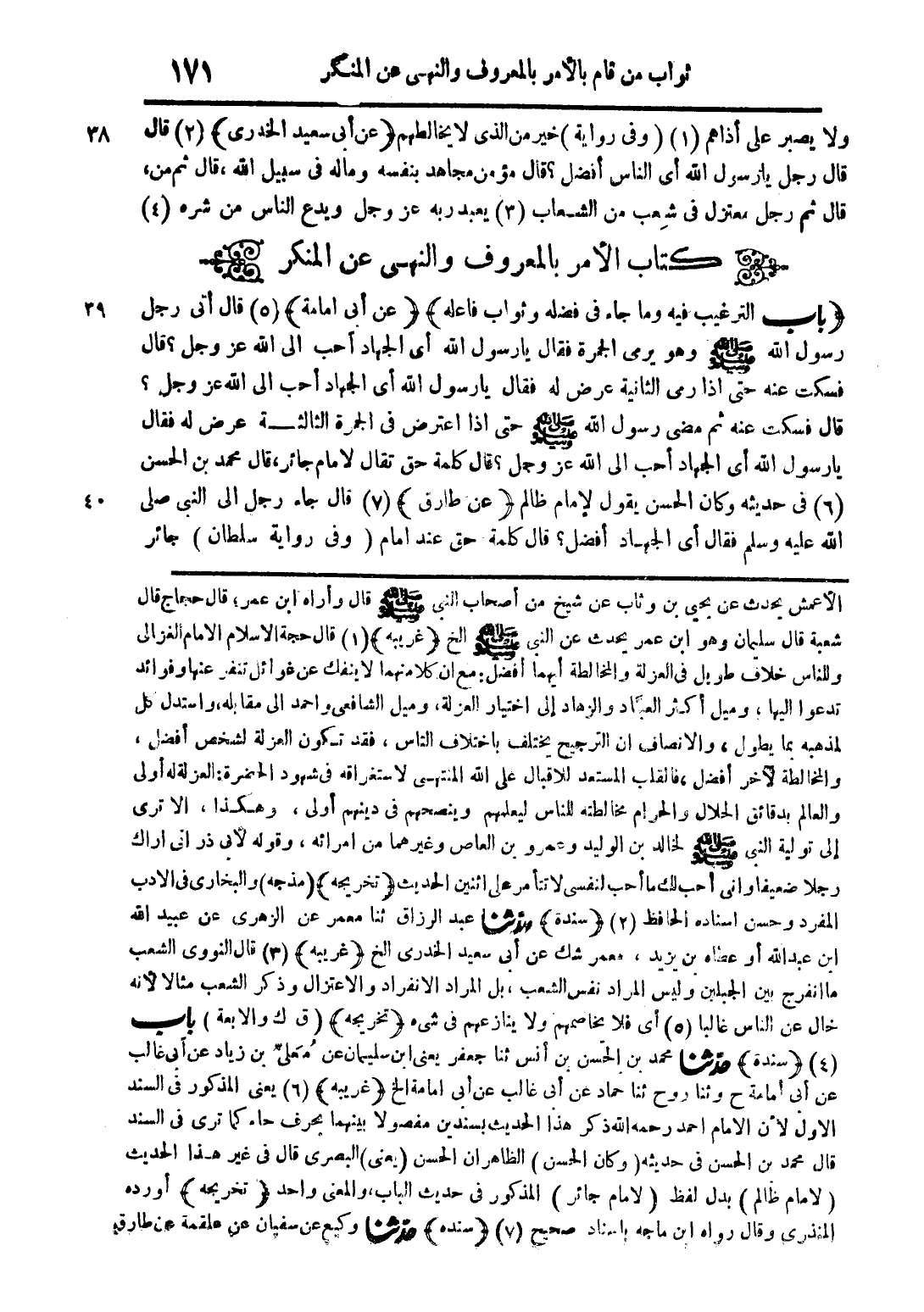 (باب الترغيب فيه وما جاء في فضله وثواب فاعله) (عن أبي أمامة) (5) قال أتى رجل رسول الله صلى الله عليه وسلم وهو يرمي الجمرة فقال يا رسول الله أي الجهاد أحب إلى الله عز وجل؟ قال فسكت عنه حتى إذا رمى الثانية عرض له فقال يا رسول الله اي الجهاد أحب إلى الله عز وجل؟ قال فسكت عنه ثم مضى رسول الله صلى الله عليه وسلم حتى اذا اعترض في الجمرة الثالثة عرض له فقال يا رسول الله أي الجهاد أحب إلى الله عز وجل؟ قال كلمة حق تقال لامام جائر قال محمد بن الحسن (6) في حديثه وكان الحسن يقول لامام ظالم (عن طارق) (7) قال جاء رجل إلى النبي صلى الله عليه وسلم فقال أي الجهاد أفضل؟ قال كلمة حق عند امام (وفي رواية سلطان) جائر