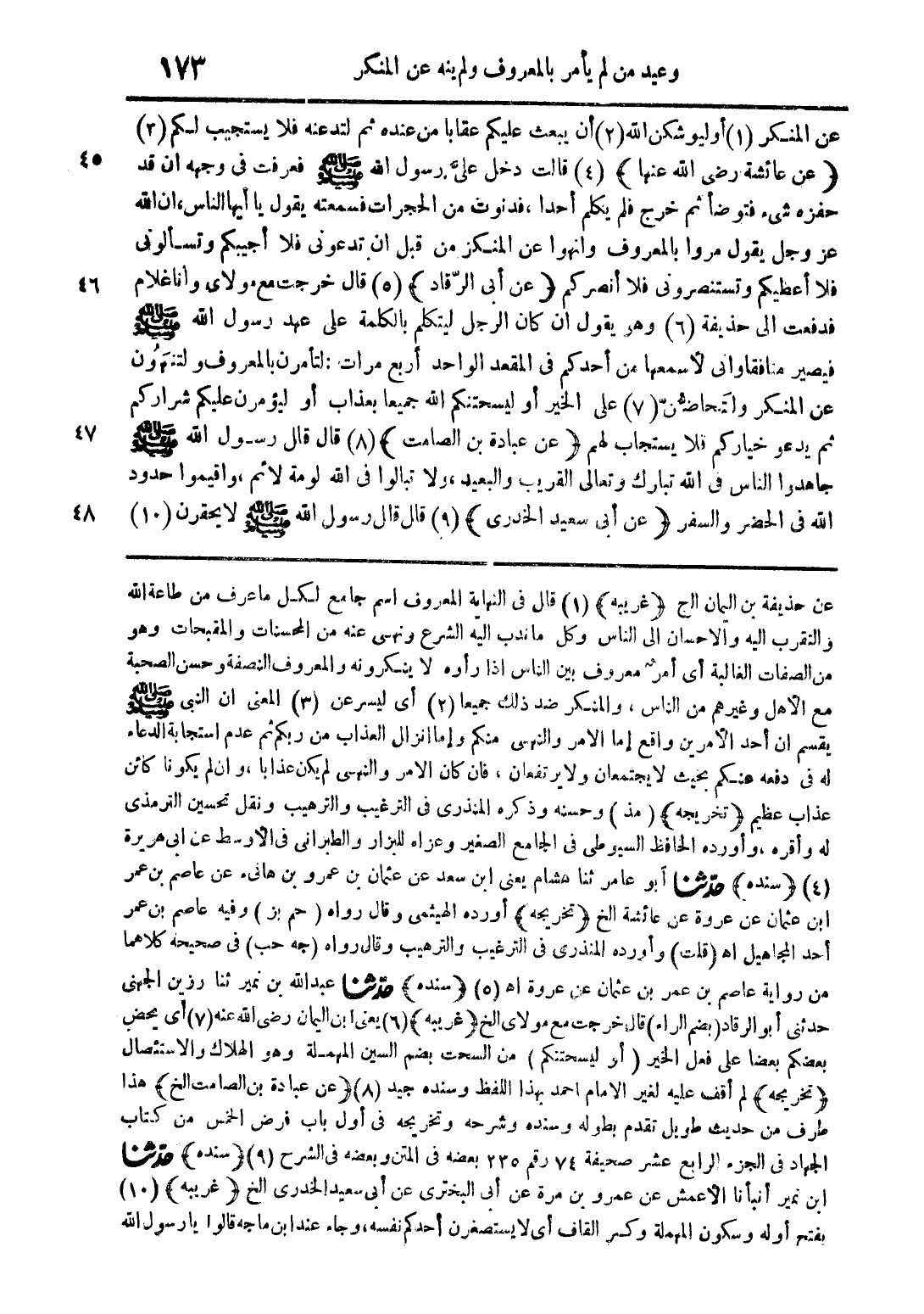 عن حذيفة بن اليمان الخ (غريبة) (1) قال في النهاية المعروف اسم جامع لكل ما عرف من طاعة الله والتقرب إليه والاحسان إلى الناس وكل ما ندب إليه الشرع ونهى عنه من المحسنات والمقبحات وهو من الصفات الغالبة أي أمر معروف بين الناس اذا رأوه لا ينكرونه والمعروف النصفة وحسن الصحبة مع الأهل وغيرهم من الناس والمنكر ضد ذلك جميع (2) اي ليسرعن (3) المعنى أن النبي صلى الله عليه وسلم يقسم ان أحد الأمرين واقع إما الامر والنهي منكم وإما انزال العذاب من ربكم ثم عدم استجابة الدعاء له في دفعه عنكم بحيث لا يجتمعان ولا يرتفعان فإن كان الأمر والنهي لم يكن عذابا وان لم يكونا كائن عذاب عظيم (تخريجه) (مذ) وحسنه وذكره المنذري في الترغيب والترهيب ونقل تحسين الترمذي له وأقره وأورده الحافظ السيوطي في الجامع الصغير وعزاه للبزار والطبراني في الأوسط عن أبي هريرة (4) (سنده) حدثنا ابو عامر ثنا هشام يعني ابن سعد عن عثمان بن عمرو بن هانئ عن عاصم بن عمر ابن عثمان عن عروة عن عائشة الخ (تخريجه) أورده الهيثمي وقال رواه (حم بز) وفيه عاصم بن عمر أحد المجاهيل اهـ (قلت) وأورده المنذري في الترغيب والترهيب وقال رواه (جه حب) في صحيحه كلاهما من رواية عاصم بن عمر بن عثمان عن عروة اهـ (5) (سنده) حدثنا عبد الله بن نمير ثنا رزين الجهني حدثنا أبو الرقاد (بضم الراء) قال خرجت مع مولاي الخ (غريبة) (6) يعني ابن اليمان رضي الله عنه (7) اي يحض بعضكم بعضا على فعل الخير (أو ليسحتنكم) من السحت بضم السين المهملة وهو الهلاك والاستئصال (تخريجه) لم أقف عليه لغير الامام احمد بهذا اللفظ وسنده جيد (8) (عن عبادة بن الصامت الخ) هذا طرف من حديث طويل تقدم بطوله وسنده وشرحه وتخريجه في أول باب فرض الخمس من كتاب الجهاد في الجزء الرابع عشر صحيفة 74 رقم 235 بعضه في المتن وبعضه في الشرح (9) (سنده) حدثنا ابن نمير انبأنا الأعمش عن عمرو بن مرة عن أبي البخترى عن أبي سعيد الخدري الخ (غريبة) (10) بفتح أوله وسكون المهملة وكسر القاف أي لا يستصغرن أحدكم نفسه وجاء عند ابن ماجة قالوا يا رسول الله