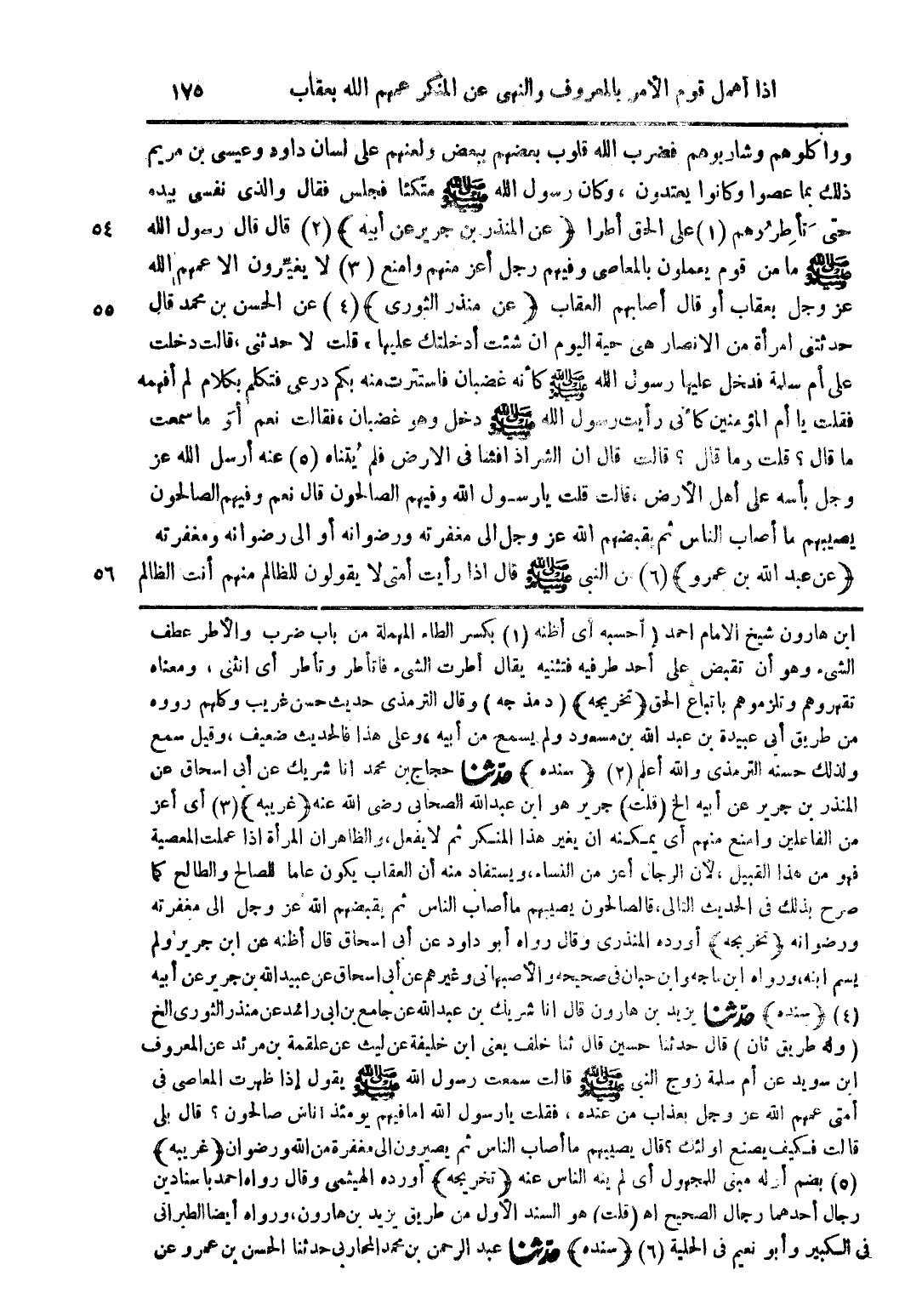 ابن هارون شيخ الإمام أحمد (احسبه) أي أظنه (1) بكسر الطاء المهملة من باب ضرب والأطرعطف الشيء وهو أن تقبض على أحد طرفيه فتثنيه يقال أطرت الشيء فاتأطر وتأطر أي انثنى ومعناه تقهرهم وتلزمهم باتباع الحق (تخريجه) (د مذ جه) وقال الترمذي حديث حسن غريب وكلهم رووه من طريق أبي عبيدة بن عبد الله بن مسعود ولم يسمع من أبيه وعلى هذا فالحديث ضعيف وقيل سمع ولذلك حسنه الترمذي والله أعلم (2) (سنده) حدثنا حجاج بن محمد انا شريك عن أبي اسحاق عن المنذر بن جرير عن أبيه الخ (قلت) جرير هو ابن عبد الله الصحابي رضي الله عنه (غريبه) (3) أي أعز من الفاعلين واضح منهم أي يمكنه أن يغير هذا المنكر ثم لا يفعل والظاهر أن المرأة اذا عملت المعصية فهو من هذا القبيل لأن الرجال أعز من النساء ويستفاد منه أن العقاب يكون عاما للصالح والطالح كما صرح بذلك في الحديث التالي فالصالحون يصيبهم ما أصاب الناس ثم يقبضهم الله عز وجل إلى مغفرته ورضوانه (تخريجه) أورده المنذري وقال رواه أبو داود عن أبي اسحاق قال اظنه عن ابن جرير ولم يسم ابنه ورواه ابن ماجة وابن حبان في صحيحه والأصبهاني وغيرهم عن أبي اسحاق عن عبيد الله بن جرير عن أبيه (4) (سنده) حدثنا يزيد بن هارون قال انا شريك بن عبد الله عن جامع بن أبي رائد عن منذر الثوري الخ (وله طريق ثان) قال حدثنا حسين قال ثنا خلف يعني ابن خليفة عن ليث عن علقمة بن مرند عن المعروف ابن سويد عن أم سلمة زوج النبي صلى الله عليه وسلم قالت سمعت رسول الله صلى الله عليه وسلم يقول إذا ظهرت المعاصي في أمتي عمهم الله عز وجل بعذاب من عنده فقلت يا رسول الله اما فيهم يزمئذ اناس صالحون؟ قال بلى قالت فكيف يصنع أولئك؟ قال يصيبهم ما أصاب الناس ثم يصيرون إلى مغفرة من الله ورضوانه (غريبه) (5) بضم أوله مبني للمجهول أي لم ينه الناس عنه (تخريجه) أورده الهيثمي وقال رواه احمد باسنادين رجال أحدهما رجال الصحيح اهـ (قلت) هو السند الأول من طريق يزيد بن هارون ورواه أيضا الطبراني في الكبير وأبو نعيم في الحلية (6) (سنده) حدثنا عبد الرحمن بن محمد المحاربي حدثنا الحسن بن عمرو عن