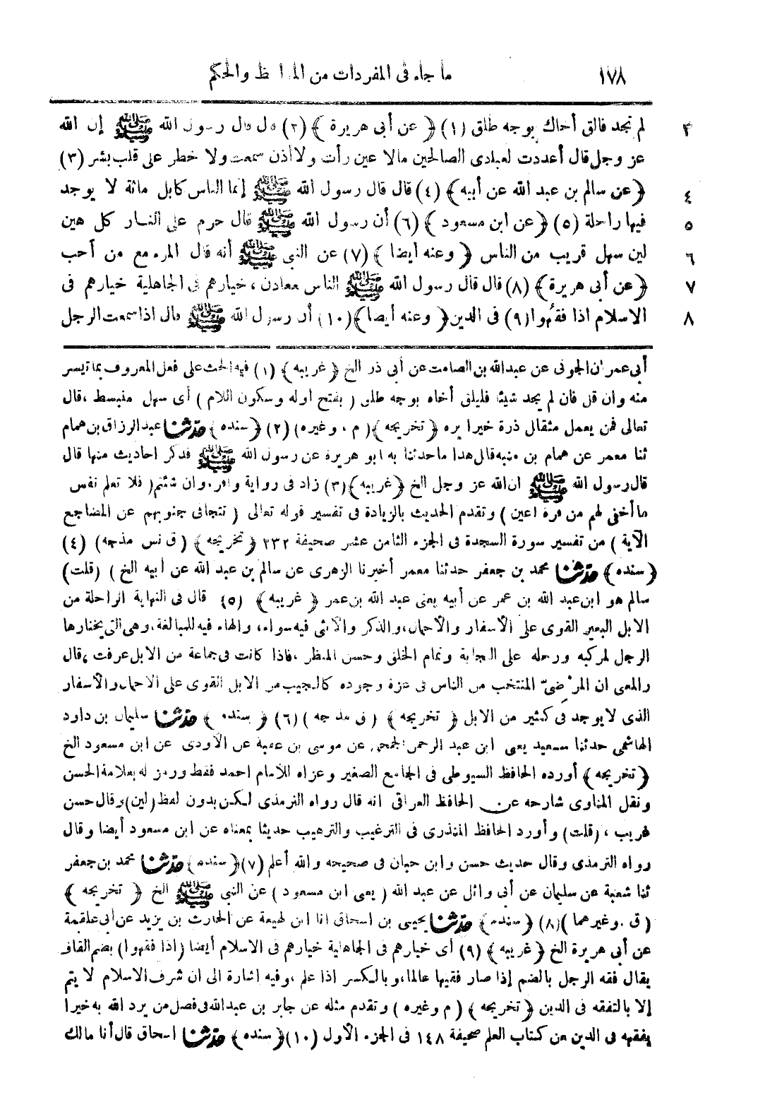 أبي عمران الجوني عن عبد الله بن الصامت عن أبي ذر الخ (غريبه) (1) فيه الحث على فعل المعروف بما تيسر منه وان قل فإن لم يجد شيئا فليلق أخاه بوجه طلق (بفتح أوله وسكون اللام) أي سهل منبسط قال تعالى فمن يعمل مثقال ذرة خيرا يره (تخريجه) (م وغيره) (2) (سنده) حدثنا عبد الرزاق بن همام ثنا معمر عن همام بن منبه قال هذا ما حدثنا به ابو هريرة عن رسول الله صلى الله عليه وسلم فذكر احاديث منها قال قال رسول الله صلى الله عليه وسلم ان الله عز وجل الخ (غريبه) (3) زاد في رواية وامرء وان شثتم (فلا تعلم نفس ما أخفى لهم من قرة اعين) وتقدم الحديث بالزيادة في تفسير قوله تعال (تتجافى جنوبهم عن المضاجع الآية) من تفسير سورة السجدة في الجزء الثامن عشر صحيفة 232 (تخريجه) (ق نس مذ جه) (4) (سنده) حدثنا محمد بن جعفر حدثنا معمر اخبرنا الزهرى عن سالم بن عبد الله عن أبيه الخ (قلت) سالم هو ابن عبد الله بن عمر عن أبيه يعني عبد الله بن عمر (غريبه) (5) قال في النهاية الراحلة من الإبل البعير القوى على الأسفار والأحمال والذكر والأنثى فيه سواء والهاء فيه للمبالغة وفي التي يختارها الرجل لمركبه ورحله على الجابة وتمام الخلق وحسن المنظر فإذا كانت في جماعة من الابل عرفت قال والمعنى أن المرضي المنتخب من الناس في عزة وجوده كالجيب من الابل القوى على الأحمال والأسفار الذي لا يوجد في كثير من الإبل (تخريجه) (ق مذ جه) (6) (سنده) حدثنا سليمان بن داود الهاشمي حدثنا سعيد يعني ابن عبد الرحمن الجمحي عن موسى بن عقبة عن الأودى عن ابن مسعود الخ (تخريجه) أورده الحافظ السيوطي في الجامع الصغير وعزاه للامام احمد فقط ورمز له بعلامة الحسن ونقل المناوى شارحه عن الحافظ العراقي انه قال رواه الترمذي لكن بدون لفظ (لين) وقال حسن غريب (قلت) وأورد الحافظ المنذري في الترغيب والترهيب حديثا بمعناه عن ابن مسعود ايضا وقال رواه الترمذي وقال حديث حسن وابن حبان في صحيحه والله أعلم (7) (سنده) حدثنا محمد بن جعفر ثنا شعبة عن سليمان عن أبي وائل عن عبد الله (يعني ابن مسعود) عن النبي صلى الله عليه وسلم الخ (تخريجه) (ق وغيرهما) (8) (سنده) حدثنا يحيى بن اسحاق انا ابن لهيعة عن الحارث بن يزيد عن أبي علقمة عن أبي هريرة الخ (غريبة) (9) أي خيارهم في الجاهلية خيارهم في الاسلام ايضا (إذا فقهوا) بضم القاف يقال فقه الرجل بالضم إذا صار فقيها عالما وبالكسر إذا علم وفيه اشارة إلى أن شرف الاسلام لا يتم إلا بالتفقه في الدين (تخريجه) (م وغيره) وتقدم مثله عن جابر بن عبد الله في فصل من يرد الله به خيرا يفقهه في الدين من كتاب العلم صحيفة 148 في الجزء الأول (10) (سنده) حدثنا اسحاق قال أنا مالك