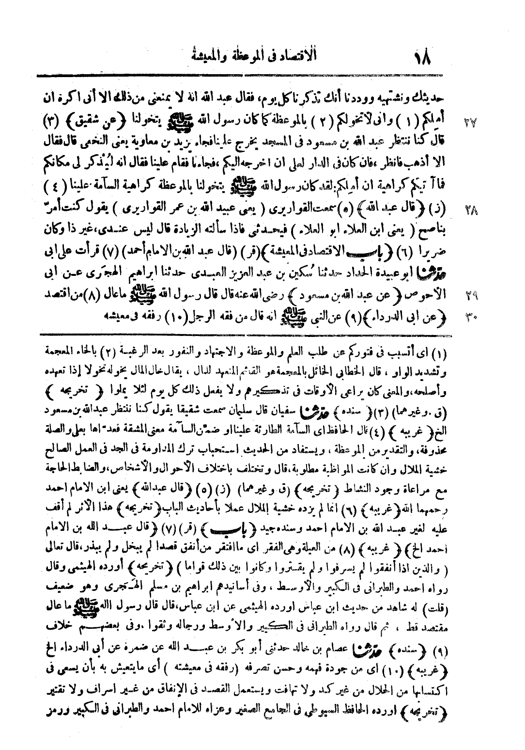 (1) أي أتسبب في فتوركم عن طلب العلم والموعظة والاجتهاد والنفور بعد الرغبة (2) بالخاء المعجمة وتشديد الواو قال الخطابي الخائل بالمعجمة هو القائم المتعهد للمال يقال خال المال يخوله تخولا إذا تعهده وأصلحه والمعنى كان يراعى الأوقات في تذكيرهم ولا يفعل ذلك كل يوم لئلا يملوا (تخريجه) (ق. وغيرهما) (3) (سنده) حدثنا سفيان قال سليمان سمعت شقيقا يقول كنا ننتظر عبد الله بن مسعود الخ (غريبه) (4) قال الحافظ أي السآمة الطارئة علينا أو ضمن السآمة معنى المشقة فعداها بعلى والصلة محذوفة والتقدير من الموعظة ويستفاد من الحديث استحباب ترك المداومة في الجد في العمل الصالح خشية الملال وإن كانت المواظبة مطلوبة قال وتختلف باختلاف الأحوال والأشخاص والضابط الحاجة مع مراعاة وجود النشاط (تخريجه) (ق. وغيرهما) (ز) (5) (قال عبد الله) يعني ابن الامام احمد رحمهما الله (غريبه) (8) من العيلة وهي الفقر أي ما افتقر من انفق قصدا لم يبخل ولم يبذر قال تعالى: (والذين إذا انفقوا لم يسرفوا لم يقتروا وكانوا بين ذلك قواما) (تخريجه) أورده الهيثمي وقال رواه أحمد والطبراني في الكبير والأوسط وفي أسانيدهم إبراهيم بن مسلم الهجرى وهو ضعيف (قلت) له شاهد من حديث ابن عباس أورده الهيثمي عن ابن عباس قال قال رسول الله صلى الله عليه وسلم ما عال مقتصد قط ثم قال رواه الطبراني في الكبير والأوسط ورجاله وثقوا وفي بعضهم خلاف (9) (سنده) حدثنا عصام بن خالد حدثني أبو بكر بن عبد الله عن ضمرة عن أبي الدرداء الخ (غريبه) (10) أي من جودة فهمه وحسن تصرفه (رفقه في معيشته) أي ما يتعيش به بأن يسعى في اكتسابها من الحلال من غير كد ولا تهافت ويستعمل القد في الإنفاق من غير إسراف ولا تقتير (تخريجه) أورده الحافظ السيوطي في الجامع الصغير وعزاه للامام احمد والطبراني في الكبير ورمز