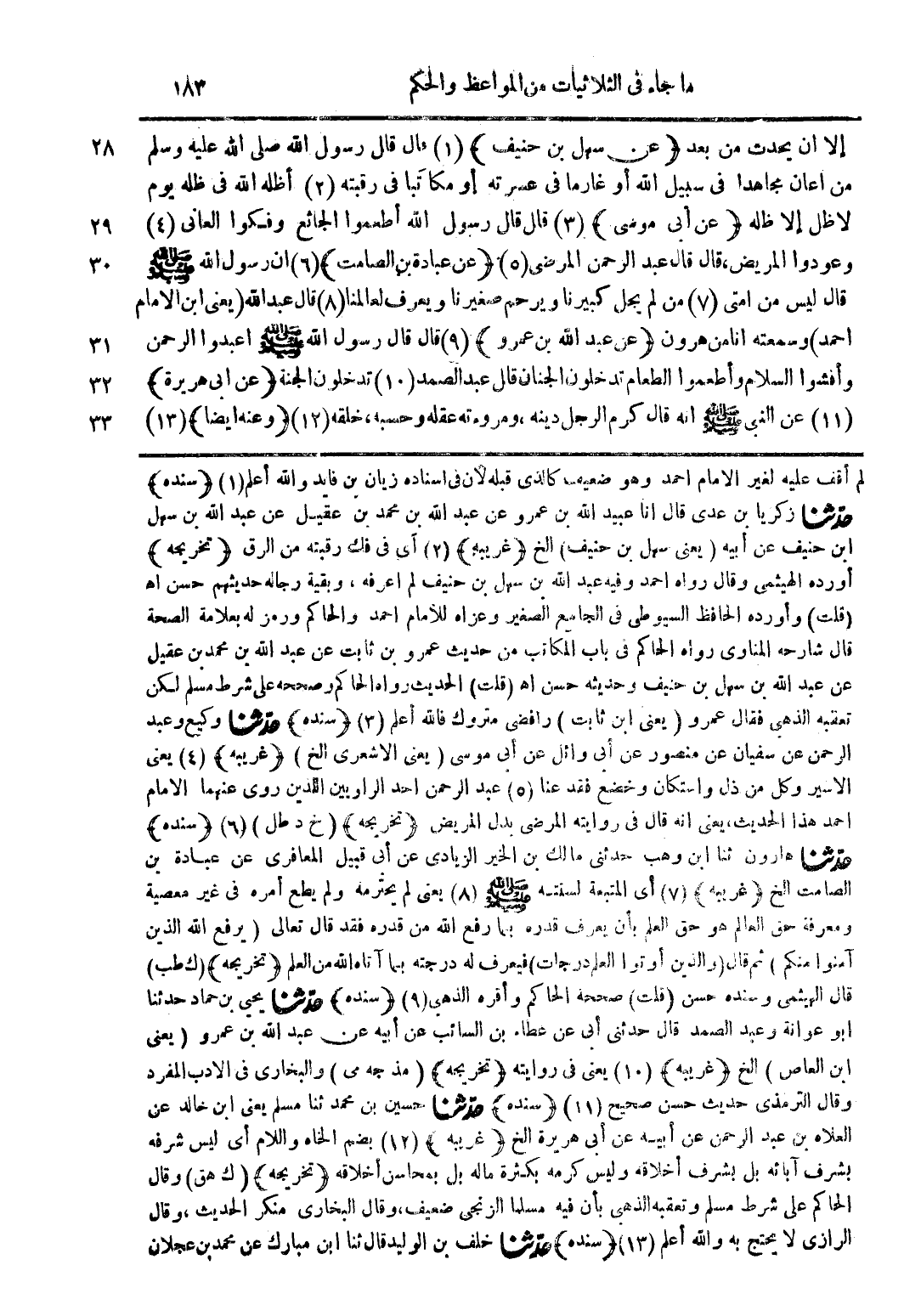 إلا أن يحدث من بعد (عن سهل بن حنيف) (1) قال قال رسول الله صلى الله عليه وسلم من أعان مجاهدا في سبيل الله أو غارما في عسرته أو مكاتبا في رقبته (2) أظله الله في ظله يوم لا ظل إلا ظله (عن أبي موسى) (3) قال قال رسول الله اطعموا الجائع وفكوا العانى (4) وعودوا المريض قال قال عبد الرحمن المرضى (5) (عن عبادة بن الصامت) (6) أن رسول الله صلى الله عليه وسلم قال ليس من أمتي (7) من لم يجل كبيرنا ويرحم صغيرنا ويعرف لعالمنا (8) قال عبد الله (يعني ابن الامام احمد) وسمعته انا من هرون (عن عبد الله بن عمرو) (9) قال قال رسول الله صلى الله عليه وسلم اعبدوا الرحمن وافشوا السلام واطعموا الطعام تدخلون الجنان قال عبد الصمد (10) تدخلون الجنة (عن أبي هريرة) (11) عن النبي صلى الله عليه وسلم انه قال كرم الرجل دينه ومروءته عقله وحسبه خلقه (12) (وعنه أيضا) (13)