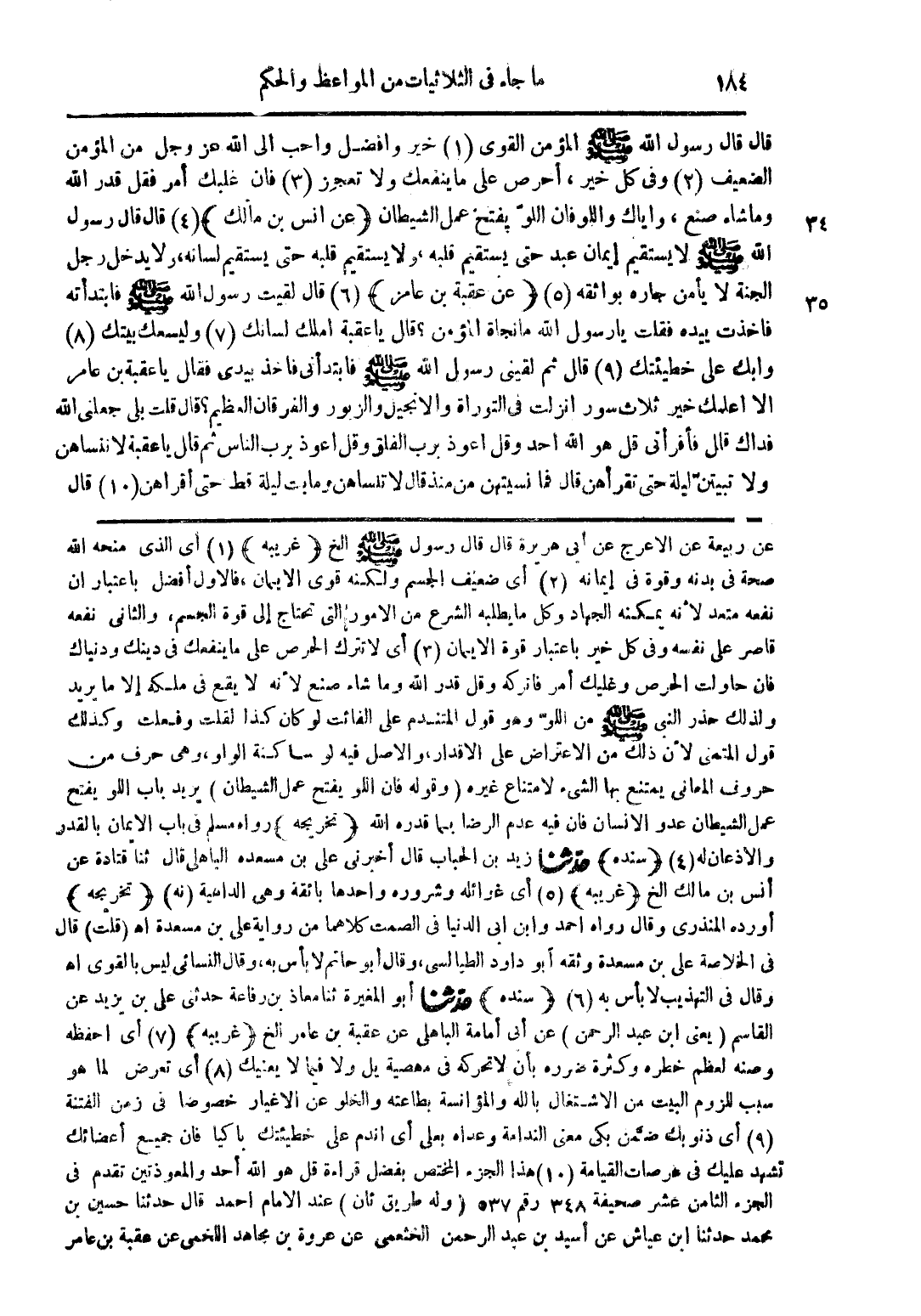 قال قال رسول الله صلى الله عليه وسلم المؤمن القوي (1) خير وأفضل وأحب إلى الله عز وجل من المؤمن الضعيف (2) وفي كل خير أحرص على ما ينفعك ولا تعجز (3) فإن غلبك أمر فقل قدر الله وما شاء صنع واياك واللو فإن اللو يفتح عمل الشيطان (عن أنس بن مالك) (4) قال قال رسول الله صلى الله عليه وسلم لا يستقيم ايمان عبد حتى يستقيم قلبه ولا يستقيم قلبه حتى يستقيم لسانه ولا يدخل رجل الجنة لا يأمن جاره بوائقه (5) (عن عقبة بن عامر) (6) قال لقيت رسول الله صلى الله عليه وسلم فابتدأته فأخذت بيده فقلت يا رسول الله ما نجاة المؤمن؟ قال يا عقبة املك لسانك (7) وليسعك بيتك (8) وابك على خطيئتك (9) قال ثم لقيني رسول الله صلى الله عليه وسلم فابتدأني فأخذ بيدي فقال يا عقبة بن عامر الا أعلمك خير ثلاث سور أنزلت في التوراة والانجيل والزبور والفرقان العظيم؟ قال قلت بلى جعلني الله فداك قال فأقرأني قل هو الله أحد وقل أعوذ برب الفلق وقل أعوذ برب الناس ثم قال يا عقبة لا تنساهن ولا تبيتن ليلة حتى تقرأهن قال فما نسيتهن من منذ قال لا تنساهن وما بت ليلة قط حتى أقراهن (10) قال