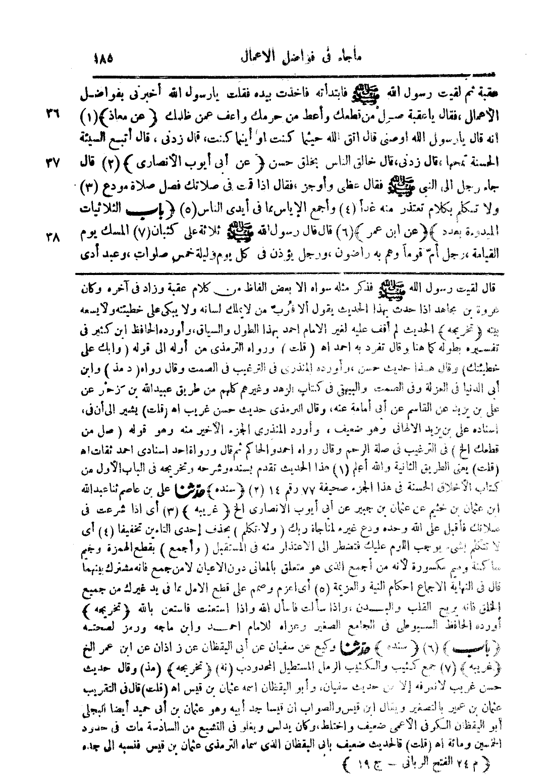 عقبة ثم لقيت رسول الله صلى الله عليه وسلم فابتدأته فأخذت بيده فقلت يا رسول الله اخبرني بفواضل الأعمال فقال يا عقبة صل من قطعك واعط من حرمك واعف عمن ظلمك (عن معاذ) (1) انه قال يا رسول الله اوصني قال اتق الله حيثمان كنت أو أينما كنت قال زدني قال اتبع السيئة الحسنة تمحها قال زدني قال خالق الناس بخلق حسن (عن أبي أيوب الأنصاري) (2) قال جاء رجل إلى النبي صلى الله عليه وسلم فقال عظني وأوجز فقال إذا قمت في صلاتك فصل صلاة المودع (3) ولا تكلم بكلام تعتذر منه غدا (4) واجمع الإيا مما في أيدي الناس (5) (باب الثلاثيات المبدوءة بعدد) (عن ابن عمر) (6) قال قال رسول الله صلى الله عليه وسلم ثلاثة على كثبان (5) المسك يوم القيامة رجل أم قوما وهم به راضون ورجل يؤذن في كل يوم وليلة خمس صلوات وعبد أدى