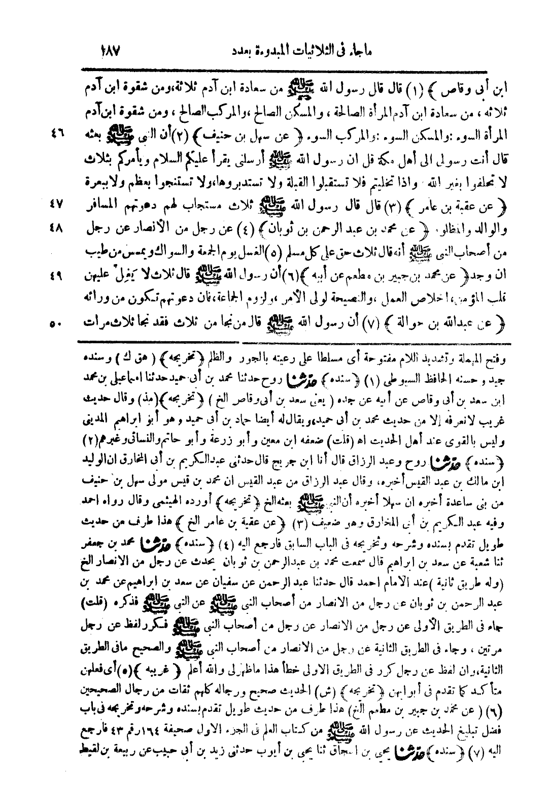 ابن أبي وقاص) (1) قال قال رسول الله صلى الله عليه وسلم من سعادة ابن آدم ثلاثة ومن شقوة ابن آدم ثلاثة من سعادة ابن آدم المرأة الصالحة والمسكن الصالح والمركب الصالح ومن شقوة ابن آدم المرأة السوء والمسكن السوء والمركب السوء (عن سهل بن حنيف) (2) أن النبي صلى الله عليه وسلم بعثه قال أنت رسولي إلى أهل مكة قل ان رسول الله صلى الله عليه وسلم أرسلني يقرأ عليكم السلام ويأمركم بتلات لا تحلفوا بغير الله وإذا تخليتم فلا تستقبلوا القبلة ولا تستدبروها ولا تستنجوا بعظم ولا ببعرة (عن عقبة بن عامر) (3) قال قال رسول الله صلى الله عليه وسلم ثلاث مستجاب لهم دعوتهم المسافر والوالد والمظلوم (عن محمد بن عبد الرحمن بن ثوبان) (4) عن رجل من الأنصار عن رجل من أصحاب النبي صلى الله عليه وسلم أنه قال ثلاث حق على كل مسلم (5) الغسل يوم الجمعة والسواك ويمسس من طيب ان وجد (عن محمد بن جبير بن مطعم عن أبيه) (6) أن رسول الله صلى الله عليه وسلم قال ثلاث لا يغل عليهن قلب المؤمن اخلاص العمل والنصيحة لولي الأمر ولزوم الجماعة فإن دعوتهم تكون من ورائه (عن عبد الله بن حوالة) (7) أن رسول الله صلى الله عليه وسلم قال من نجا من ثلاث فقد نجا ثلاث مرات