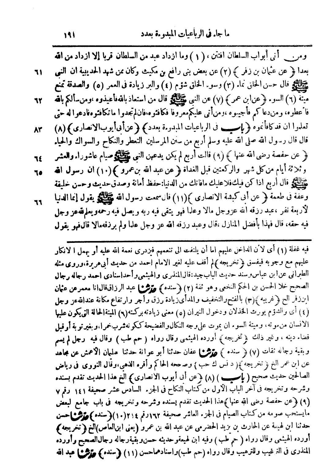 فيه غفلة (1) أي لأن الداخل عليهم اما أن يلتفت إلى تنعمهم فيزدري نعمة الله عليه أو يهمل الانكار عليهم مع وجوبه فيفسق (تخريجه) لم أقف عليه لغير الامام احمد من حديث ابي هريرة وروى مثله الطبراني عن ابن عباس وسند حديث الباب جيد قال المنذري والهيثمي واحد اسنادي احمد رجاله رجال الصحيح خلا الحسن بن الحكم النخمي وهو ثقة (2) (سنده) حدثنا عبد الرزاق قال انا معمر عن عثمان ابن زفر اخل (غريبة) (3) بالفتح والتخفيف والمد أي زيادة رزق وأجر وارتفاع مكانة عند الله عز وجل (4) أي والشؤم يورث الخذلان ودخول النيران (5) معنى زيادته بركته (6) الميتة الحالة التي يكون عليها الانسان من موته وميتة السوء أن يموت على وجه النكال والفضيحة ككونه شرب خمرا وبغير توبة أو قبل قضاء دينه وغير ذلك (تخريجه) أورده الهيثمي وقال رواه (حم طب) وقال فيه رجل لم يسم وبقية رجاله ثقات (7) (سنده) حدثنا عفان حدثنا أبو عوانة حدثنا سلمان الأعمش عن مجاهد عن ابن عمر الخ (تخريجه) (د نس ك حب) وصححه الحاكم وأقره الذهبي وقال النووي في رياض الصالحين حديث صحيح (باب) (8) (عن أبي أيوب الأنصاري) الخ هذا الحديث تقدم بسنده وشرحه وتخريجه في آخر الباب الأول من كتاب النكاح في الجزء السادس عشر صحيفة 141 رقم 7 (9) (عن حفصة رضي الله عنها) هذا الحديث تقدم بسنده وشرحه وتخريجه في باب جامع لبعض ما يستحب صومه من كتاب الصيام في الجزء العاشر صحيفة 162 رقم 214 (10) (سنده) حدثنا حسن حدثنا ابن لهيعة عن الحارث بن يزيد الحضرمي عن عبد الله بن عمرو (يعني ابن العاص) الخ (تخريجه) أورده الهيثمي وقال رواه (حم طب) وفيه ابن لهيعة وحديثه حسن وبقية رجاله رجال الصحيح وأورده المنذري في الترغيب والترهيب وقال رواه (حم طب) واسنادهما حسن (11) (سنده) حدثنا عبد الله