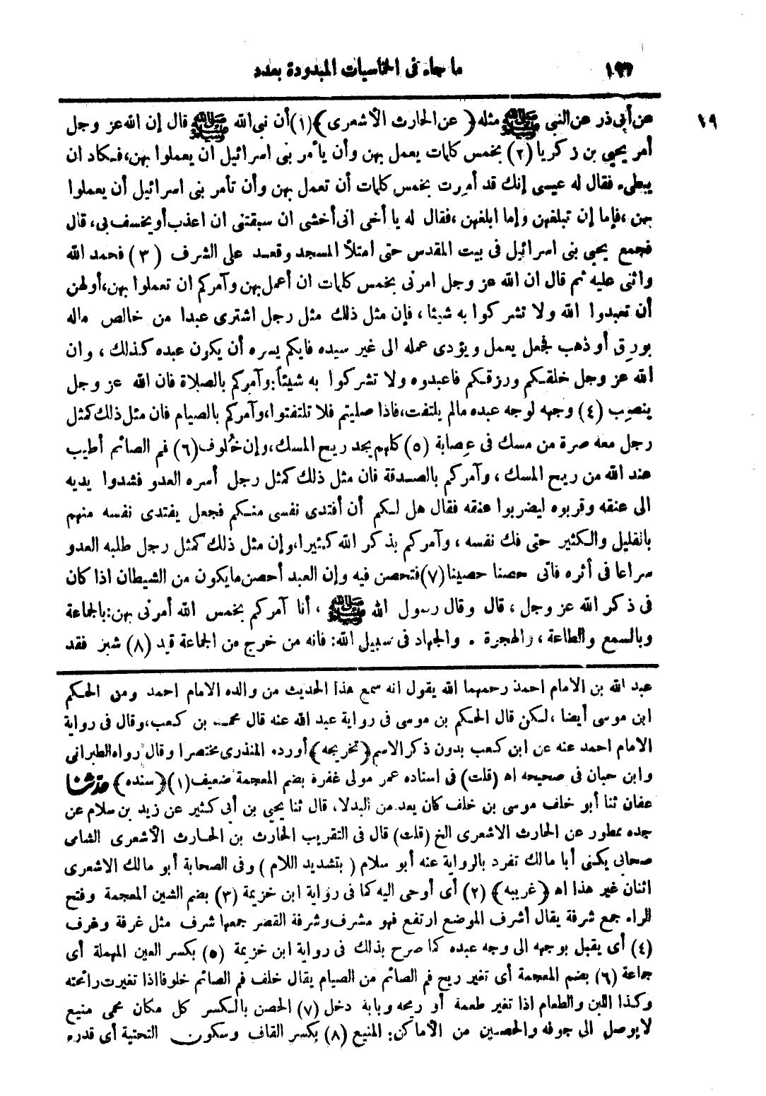عبد الله بن الإمام احمد رحمهما الله يقول سمع هذا الحديث من والده الامام احمد ومن الحكم ابن موسى ايضا لكن قال الحكم بن موسى في رواية عبد الله عنه قال محمد بن كعب وقال في رواية الامام احمد عنه عن ابن كعب بدون ذكر الاسم (تخريجه) أورده المنذري مختصرا وقال رواه الطبراني وابن حبان في صحيحه اهـ (قلت) في اسناده عمر مولى غفرة بضم المعجمة ضعيف (1) (سنده) حدثنا عفان ثنا أبو خلف موسى بن خلف كان يعد من البدلا قال ثنا يحيى بن ابي كثير عن زيد بن سلام عن جده ممطور عن الحارث الأشعري الخ (قلت) قال في التقريب الحارث بن الحارث الأشعري الشامي صحابي يكنى أبا مالك تفرد بالرواية عنه ابو سلام (بتشديد اللام) وفي الصحابة أبو مالك الأشعري اثنان غير هذا اهـ (غريبه) (2) أي أوحى اليه كما في رواية ابن خزيمة (3) بضم الشين المعجمة وفتح الراء جمع شرفة يقال اشرف الموضع ارتفع فهو مشرف وشرفة القصر جمعها شرف مثل غرفة وغرف (4) أي يقبل بوجهه إلى وجه عبده كما صرح بذلك في رواية ابن خزيمة (5) بكسر العين المهملة أي جماعة (6) بضم المعجمة أي تغير ريح فم الصائم من الصيام يقال خلف فم الصائم خلوفا اذا تغيرت رائحته وكذا اللبن والطعام اذا تغير طعمه أو ريحه وبابه دخل (7) الحصن بالكسر كل مكان محمي منيع لا يوصل إلى جوفه والحصين من الاماكن المنيع (8) بكسر القاف وسكون التحتية أي قدره