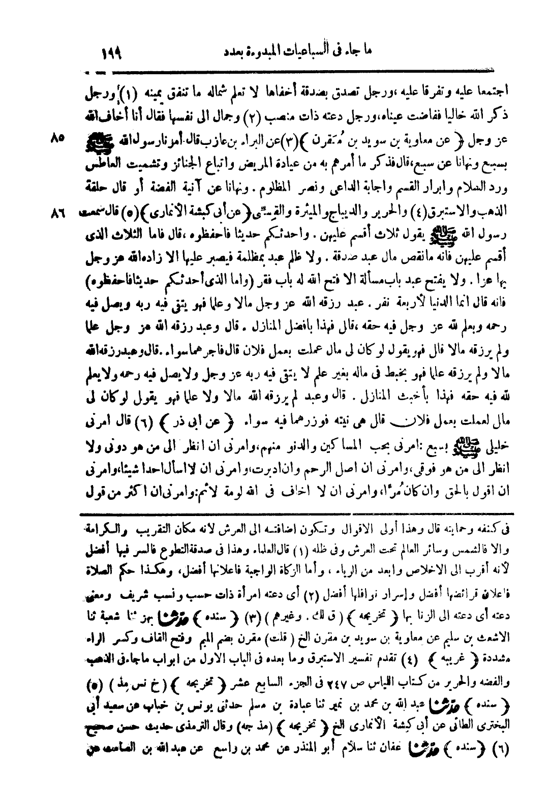 اجتمعا عليه وتفرقا عليه ورجل تصدق بصدقة أخفاها لا تعلم شماله ما تنفق يمينه (1) ورجل ذكر الله خاليا ففاضت عيناه ورجل دعته ذات منصب (2) وجمال إلى نفسها فقال أنا اخاف الله عز وجل (عن معاوية بن سويد بن مقرن) (3) عن البراء بن عازب قال أمرنا رسول الله صلى الله عليه وسلم بسبع ونهانا عن سبع قال فذكر ما أمرهم به من عيادة المريض واتباع الجنائز وتشميت العاطس ورد السلام وابرار القسم واجابة الداعي ونصر المظلوم ونهانا عن آنية الفضة أو قال حلقة الذهب والاستبرق (4) والحرير والديباج والميثرة والقسى (عن أبي كبشة الأنماري) (5) قال سمعت رسول الله صلى الله عليه وسلم يقول ثلاث اقسم عليهن واحدثكم حديثا فاحفظوه قال فاما الثلاث الذي أقسم عليهن فإنه ما نقص مال عبد صدقة ولا ظلم عبد بمظلمة فيصبر عليها إلا زاده الله عز وجل بها عزا ولا يفتح عبد باب مسألة إلا فتح الله باب فقر (واما الذي احدثكم حديثا فاحفظوه) فإنه قال انما الدنيا لأربعة نفر عبد رزقه الله عز وجل مالا وعلما فهو يتقي فيه ربه ويصل فيه رحمه ويعلم لله عز وجل فيه حقه قال فهذا بأفضل المنازل قال وعبد رزقه الله عز وجل علما ولم يرزقه مالا قال فهو يقول لو كان لي مال عملت بعمل فلان قال فاجرهما سواء قال وعبد رزقه الله مالا ولم يرزقه علما فهو يخبط في ماله بغير علم لا يتقي فيه ربه عز وجل ولا يصل فيه رحمه ولا يعلم لله فيه حقه فهذا بأخبث المنازل قال وعبد لم يرزقه الله مالا ولا علما فهو يقول لو كان لي مال لعملت بعمل فلان قال هي نيته فوزرهما فيه سواء (عن أبي ذر) (6) قال أمرني خليلي صلى الله عليه وسلم بسبع أمرني بحب المساكين والدنو منهم وامرني ان انظر الى من هو دوني ولا انظر إلى من هو فوقي وامرني ان اصل الرحم وان ادبرت وامرني ان لا اسأل احدا شيئا وامرني ان اقول بالحق وان كان مرا وامرني ان لا اخاف في الله لومة لائم وأمرني أن أكثر من قول