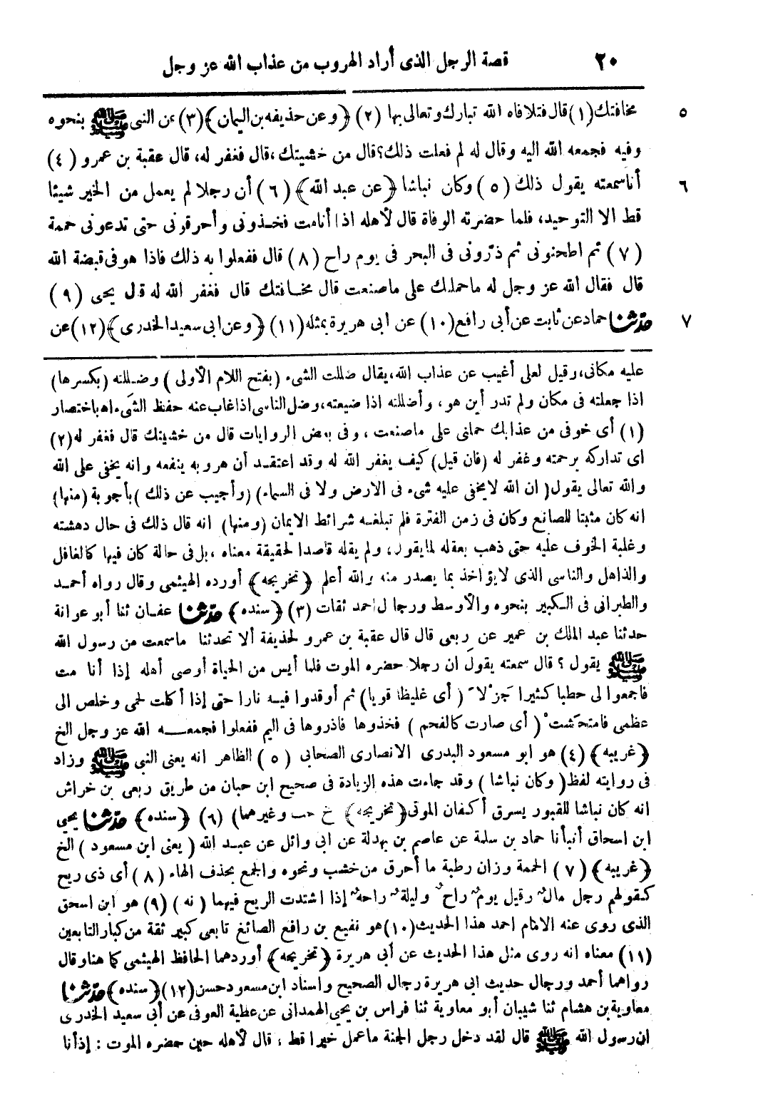 عليه مكاني وقيل لعلي أغيب عن عذاب الله يقال ضللت الشيء (بفتح اللام الأولى) وضللته (بكسرها) إذا جعلته في مكان ولم تدر أين هو وأضللته إذا ضيعته وضل الناس إذا غاب عنه حفظ الشيء اهـ باختصار (1) أي خوفي من عذابك حملني على ما صنعت وفي بعض الروايات قال من خشيتك قال فغفر له (2) أي تداركه برحمته وغفر له (فإن قيل) كيف يغفر الله له وقد اعتقد أن هروبه ينفعه وأنه يخفى على الله والله تعالى يقول (إن الله لا يخفى عليه شيء في الأرض ولا في السماء) (وأجيب عن ذلك) بأجوبة (منها) أنه كان مثبتا للصانع وكان في زمن الفترة فلم تبلغه شرائط الإيمان (ومنها) أنه قال ذلك في حال دهشته وغلبه الخوف عليه حتى ذهب بعقله لما يقول ولم يقله قاصدا لحقيقة معناه بل في حالة كان فيها كالغافل والذاهل والناسي الذي لا يؤاخذه بما يصدر منه والله أعلم (تخريجه) أورده الهيثمي وقال رواه أحمد والطبراني في الكبير بنحوه والأوسط ورجال أحمد ثقات (3) (سنده) حدثنا عفان ثنا أبو عوانة حدثنا عبد الملك بن عمير عن ربعى قال قال عقبة بن عمرو لحذيفة ألا تحدثنا ما سمعت من رسول الله صلى الله عليه وسلم يقول؟ قال سمعته يقول أن رجلا حضره الموت فلما أيس من الحياة أوصى أهله إذا أنا مت فاجمعوا لي حطبا كثيرا جزلا (أي غليظا قويا) ثم اوقدوا فيه نارا حتى إذا أكلت لحمي وخلص إلى عظمي فامتحشت (أي صارت كالفحم) فخذوها فاذروها في اليم ففعلوا فجمعه الله عز وجل الخ (غريبه) (4) هو أبو مسعود البدري الأنصاري الصحابي (5) الظاهر أنه يعني النبي صلى الله عليه وسلم وزاد في روايته لفظ (وكان نباشا) وقد جاءت هذه الزيادة في صحيح ابن حبان من طريق ربعي بن خراش أنه كان نباشا للقبور يسرق أكفان الموتى (تخريجه) (خ حب وغيرهما) (6) (سنده) حدثنا يحيى ابن اسحاق أنبأنا حماد بن سلمة عن عاصم بن بهدلة عن أبي وائل عن عبد الله (يعني ابن مسعود) الخ (غريبه) (7) الحممة وزان رطبة ما أحرق من خشب ونحوه والجمع بحذف الهاء (8) أي ذي ريح كقولهم رجل مال وقيل يوم راح وليلة راحة إذا اشتدت الريح فيها (نه) (9) هو ابن اسحق الذي روى عنه الإمام أحمد هذا الحديث (10) هو نفيع بن رافع الصائغ تابعي كبير ثقة من كبار التابعين (11) معناه أنه روي مثل هذا الحديث عن أبي هريره (تخريجه) أوردهما الحافظ الهيثمي كما هنا وقال رواهما أحمد ورجال حديث أبي هريرة رجال الصحيح واسناد أبو مسعود حسن (12) (سنده) حدثنا معاوية بن هشام ثنا شيبان أبو معاوية ثنا فراس بن يحيى الهمداني عن عطية العوفي عن أبي سعيد الخدري أن رسول الله صلى الله عليه وسلم قال لقد دخل رجل الجنة ما عمل خير قط قال لأهله حين حضره الموت إذا أنا