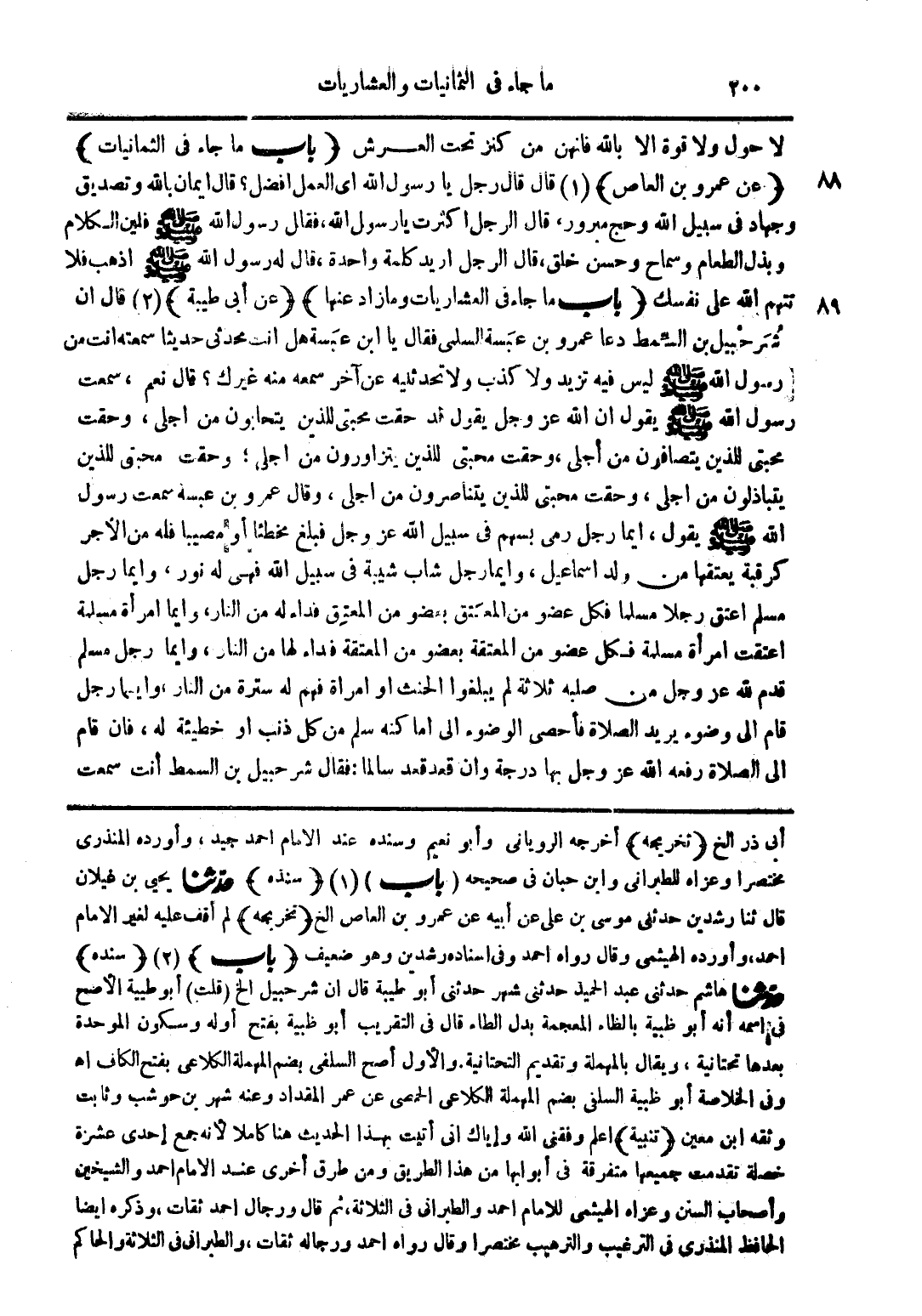 لا حول ولا قوة إلا بالله فانهن من كنز تحت العرش (باب ما جاء في الثمانيات) (عن عمرو بن العاص) (1) قال قال رجل يا رسول الله أي العمل أفضل؟ قال ايمان بالله وتصديق وجهاد في سبيل الله وحج مبرور قال الرجل اكثرت يا رسول الله فقال رسول الله صلى الله عليه وسلم فلين الكلام وبذل الطعام وسماح وحسن خلق قال الرجل أريد كلمة واحدة قال له رسول الله صلى الله عليه وسلم اذهب فلا تتهم الله على نفسك (باب ما جاء في العشاريات ومازاد عنها) (عن أبي طيبة) (2) قال ان شرحبيل بن السمط دعا عمرو بن عبسة السلمي فقال يا ابن عبسة هل انت محدثي حديثا سمعته انت من رسول الله صلى الله عليه وسلم ليس فيه تزيد ولا كذب ولا تحدثنيه عن آخر سمعه منه غيرك؟ قال نعم سمعت رسول الله صلى الله عليه وسلم يقول ان الله عز وجل يقول قد حقت محبتي للذين يتحابون من اجلي وحقت محبتي للذين يتصافون من أجلي وحقت محبتي للذين يتزاورون من أجلي وحقت محبتي للذين يتباذلون من أجلي وحقت محبتي للذين يتناصرون من اجلي وقال عمرو بن عبسة سمعت رسول الله صلى الله عليه وسلم يقول ايما رجل رمى بسهم في سبيل الله عز وجل فبلغ مخطئا أو مصيبا فله من الأجر كرقبة يعتقها من ولد اسماعيل وايما رجل شاب شيبة في سبيل الله فهي له نور وايما رجل مسلم اعتق رجلا مسلما فكل عضو من المعتق بعضو من المعتق فداء له من النار وايما امرأة مسلمة اعتقت امرأة مسلمة فكل عضو من المعتقة بعضو من المعتقة فداء لها من النار وايما رجل مسلم قدم لله عز وجل من صلبه ثلاثة لم يبلغوا الحنث او امرأة فهم له سترة من النار وايما رجل قام إلى وضوء يريد الصلاة فأحصى الوصوء إلى أماكنه سلم من كل ذنب أو خطيئة له فإن قام إلى الصلاة رفعه الله عز وجل بها درجة وان قعد قعد سالما فقال شرحبيل بن السمط أنت سمعت