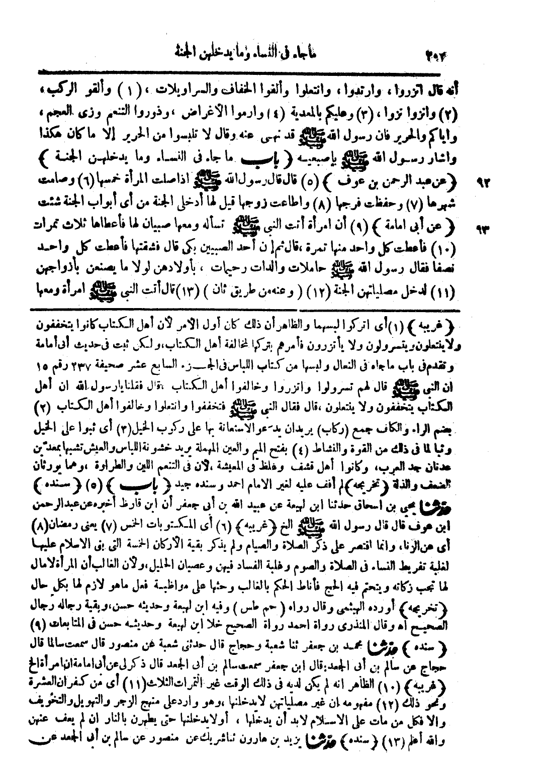 (غريبه) (1) أي اتركوا لبسهما والظاهر أن ذلك ما كان اول الأمر لأن أهل الكتاب كانوا يتخففون ولا ينتعلون ويتسرولون ولا يأتزرون فأمرهم بتركها لمخالفة أهل الكتاب ولكن ثبت في حديث أبي أمامة وتقدم في باب ما جاء في النعال ولبسها من كتاب اللباس في الجزء السابع عشر صحيفة 237 رقم 15 أن النبي صلى الله عليه وسلم قال لهم تسرولوا واتزروا وخالفوا أهل الكتاب قال فقلنا يا رسول الله أن اهل الكتاب يتخففون ولا ينتعلون قال فقال النبي صلى الله عليه وسلم فتخففوا وانتعلوا وخالفوا أهل الكتاب (2) بضم الراء والكاف جمع (ركاب) يريدان يدعو الاستعانة بها على ركوب الخيل (3) أي ثبوا على الخيل وثبا لما في ذلك من القوة والنشاط (4) بفتح الميم والعين المهملة يريد خشونة اللباس والعيش تشبها بمعد بن عدنان جد العرب وكانوا أهل قشف وغلظ في المعيشة لأن في التنعيم اللين والطراوة وهما يورثان الضعف والذل (تخريجه) لم أقف عليه لغير الامام احمد وسنده جيد (باب) (5) (سنده) حدثنا يحيى بن اسحاق حدثنا ابن لهيعة عن عبيد الله بن أبي جعفر ان ابن قارظ اخبره عن عبد الرحمن ابن عوف قال قال رسول الله صلى الله عليه وسلم الخ (غريبه) (6) أي المكتوبات الخمس (7) يعني رمضان (8) أي عن الزنا وانما اقتصر على ذكر الصلاة والصيام ولم يذكر بقية الأركان الخمسة التي بني الاسلام عليها لغلبة تفريط النساء في الصلاة والصوم وغلبة الفساد فيهن وعصيان الحليل ولأن الغالب أن المرأة لا مال لها تجب زكاته ويتحتم فيه الحج فأناط الحكم بالغالب وحثها على مواظبة فعل ما هو لازم لها بكل حال (تخريجه) أورده الهيثمي وقال رواه (حم طس) وفيه ابن لهيعة وحديثه حسن وبقية رجاله رجال الصحيح اهـ وقال المنذري رواة احمد رواة الصحيح خلال ابن لهيعة وحديثه حسن في المتابعات (9) (سنده) حدثنا محمد بن جعفر ثنا شعبة وحجاج قال حدثني شعبة عن منصور قال سمعت سالما قال حجاج عن سالم بن أبي الجعد قال ابن جعفر سمعت سالم بن أبي الجعد قال ذكر لي عن أبي أمامة ان امرأة الخ (غريبة) (10) الظاهر أنه لم يكن لديه في ذلك الوقت غير التمرات الثلاث (11) أي من كفران العشرة ونحو ذلك (12) مفهومه ان غير مصلياتهن لا يدخلنها وهو وارد على منهج الزجر والتمويل والتخويف والا فكل من مات على الاسلام لابد أن يدخلها أو لا يدخلنها حتى يطهرن بالنار ان لم يعف عنهن والله أعلم (13) (سنده) حدثنا يزيد بن هارون ثنا شريك عن منصور عن سالم بن أبي الجعد عن